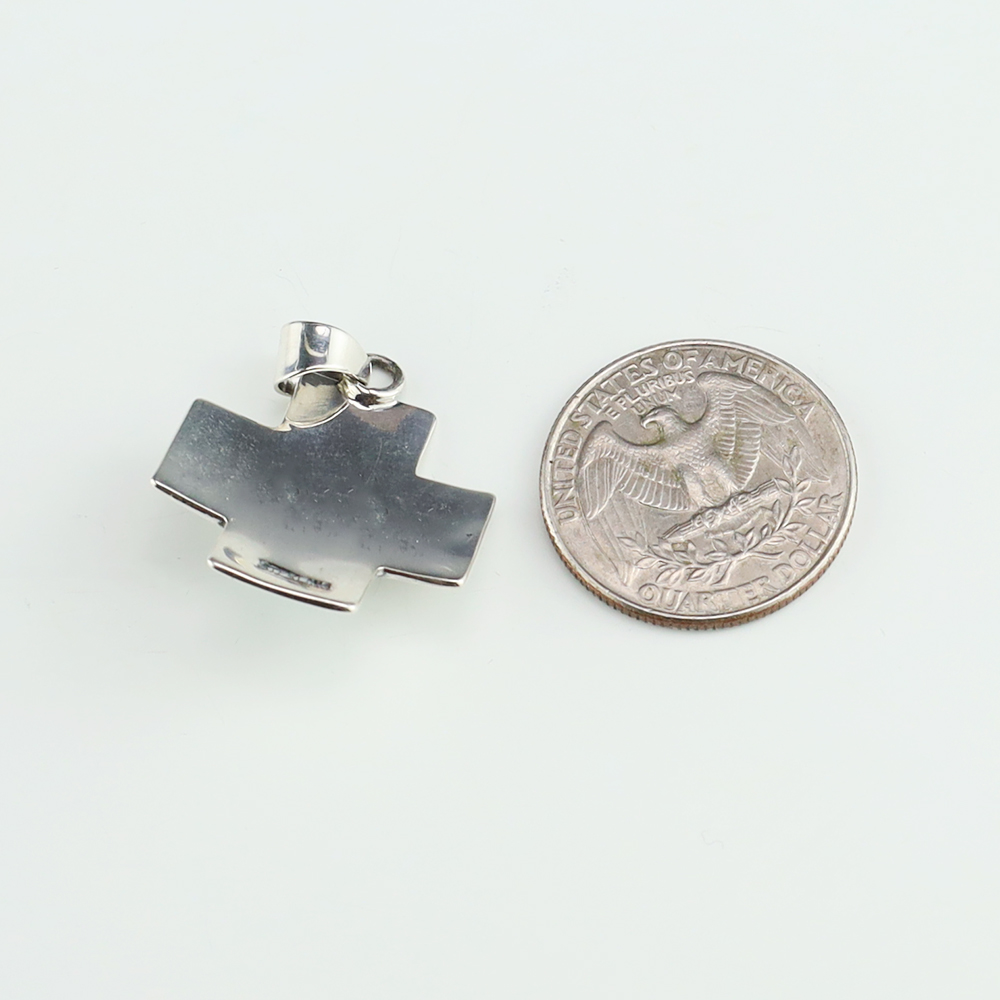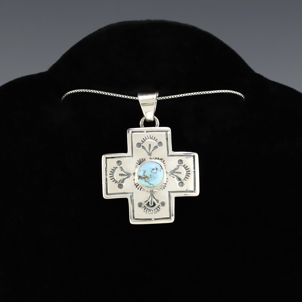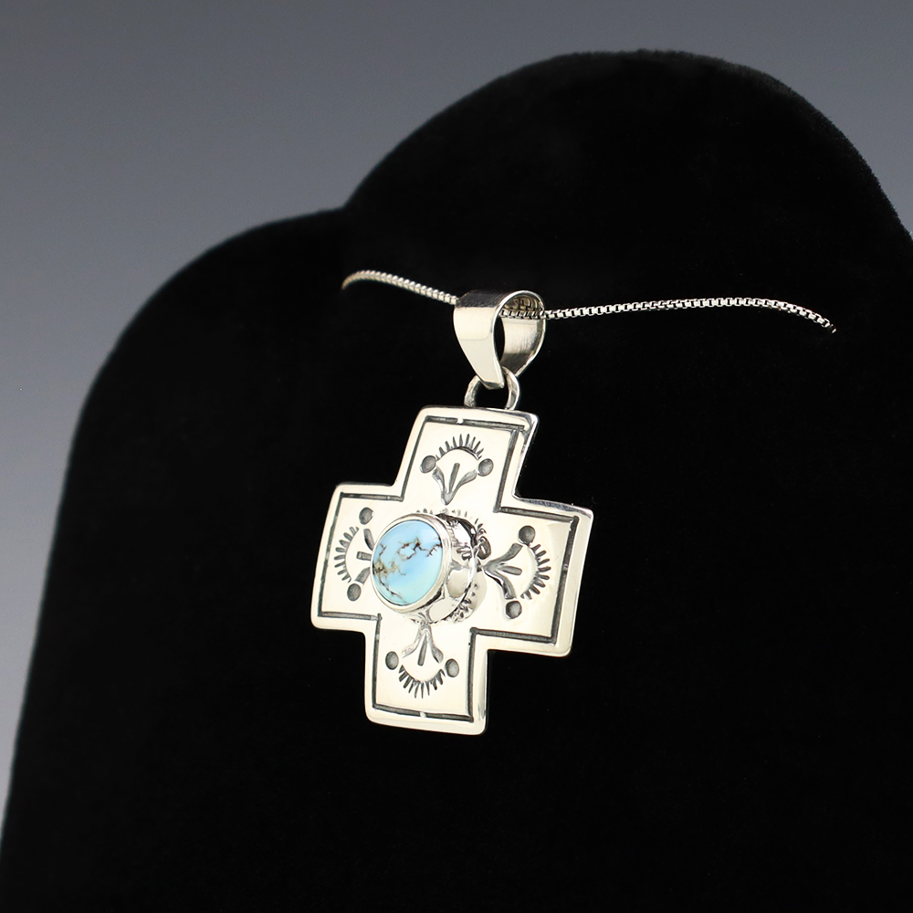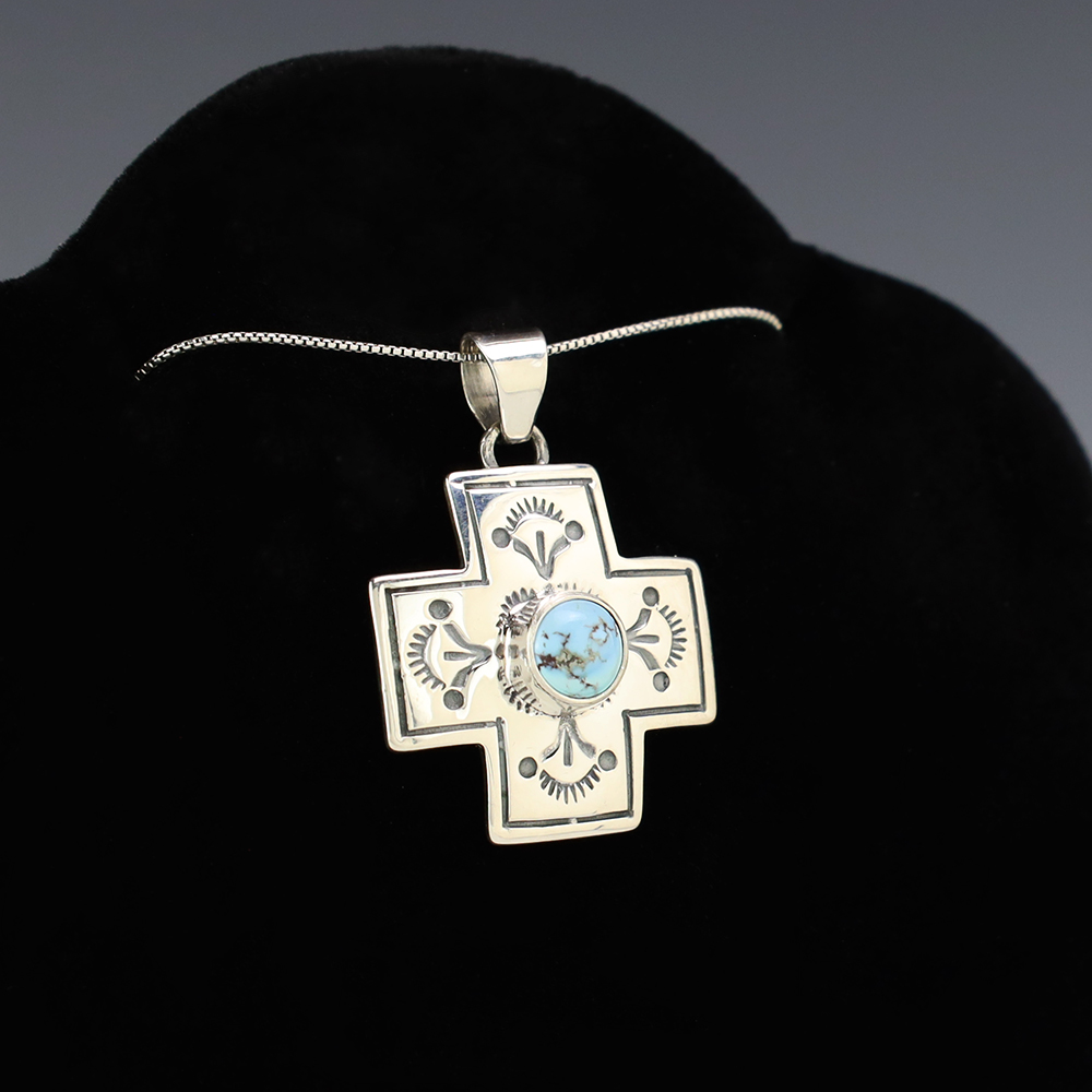 Lovely cross pendant hand made out of sterling silver and Golden Hills Turquoise. A timeless beauty that you will enjoy for years to come. Weighs 6 grams. (Chain not included)