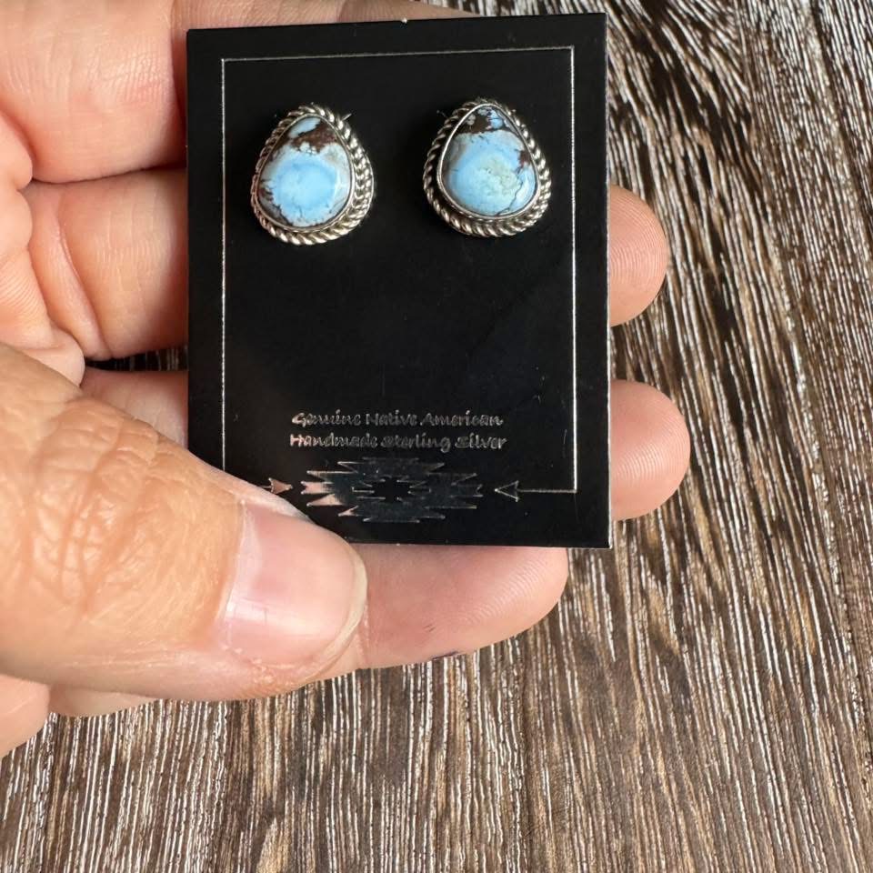 Beautiful earrings made out of sterling silver and set with Golden Hills Turquoise stones. These fabulous earrings will become a versatile accessory in your jewelry collection. Weighs 4 grams.
