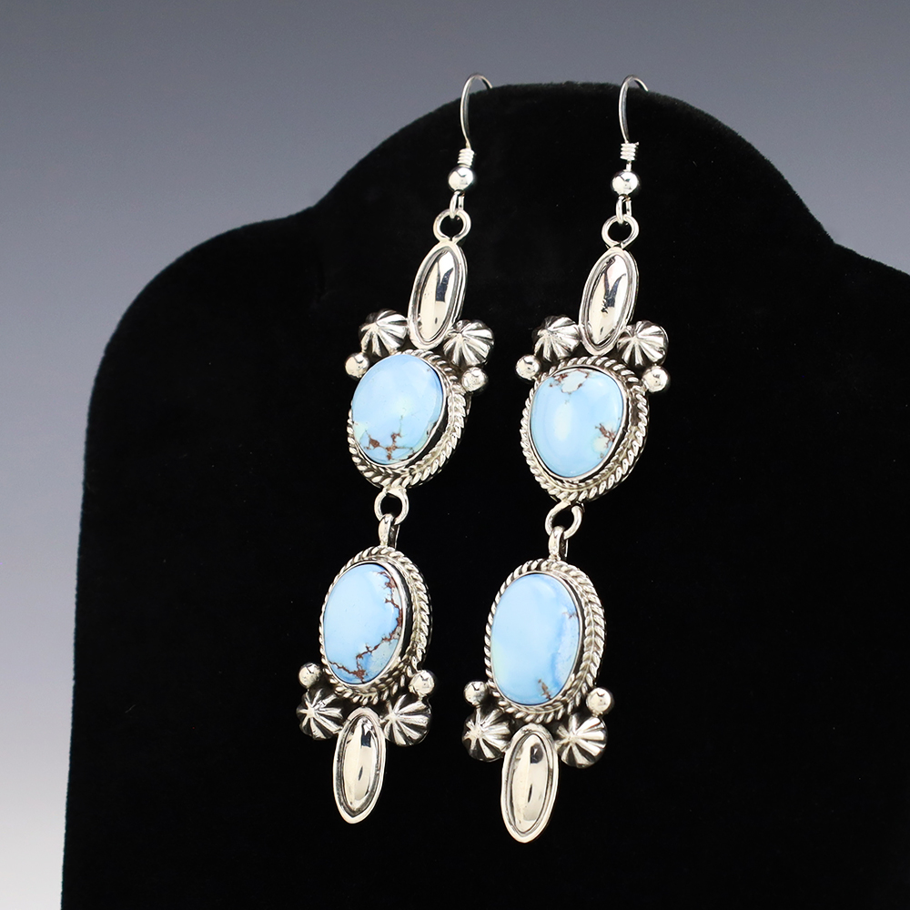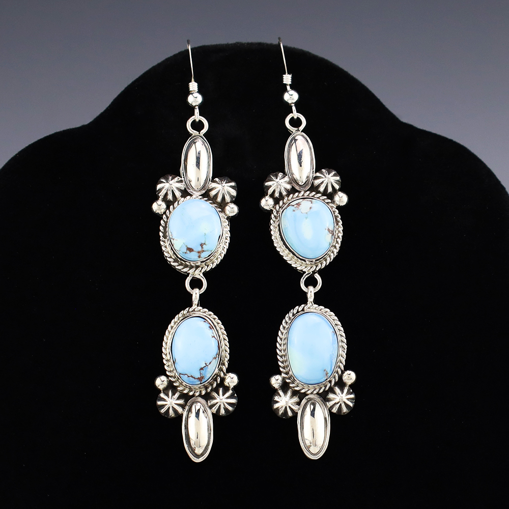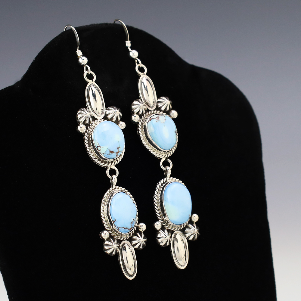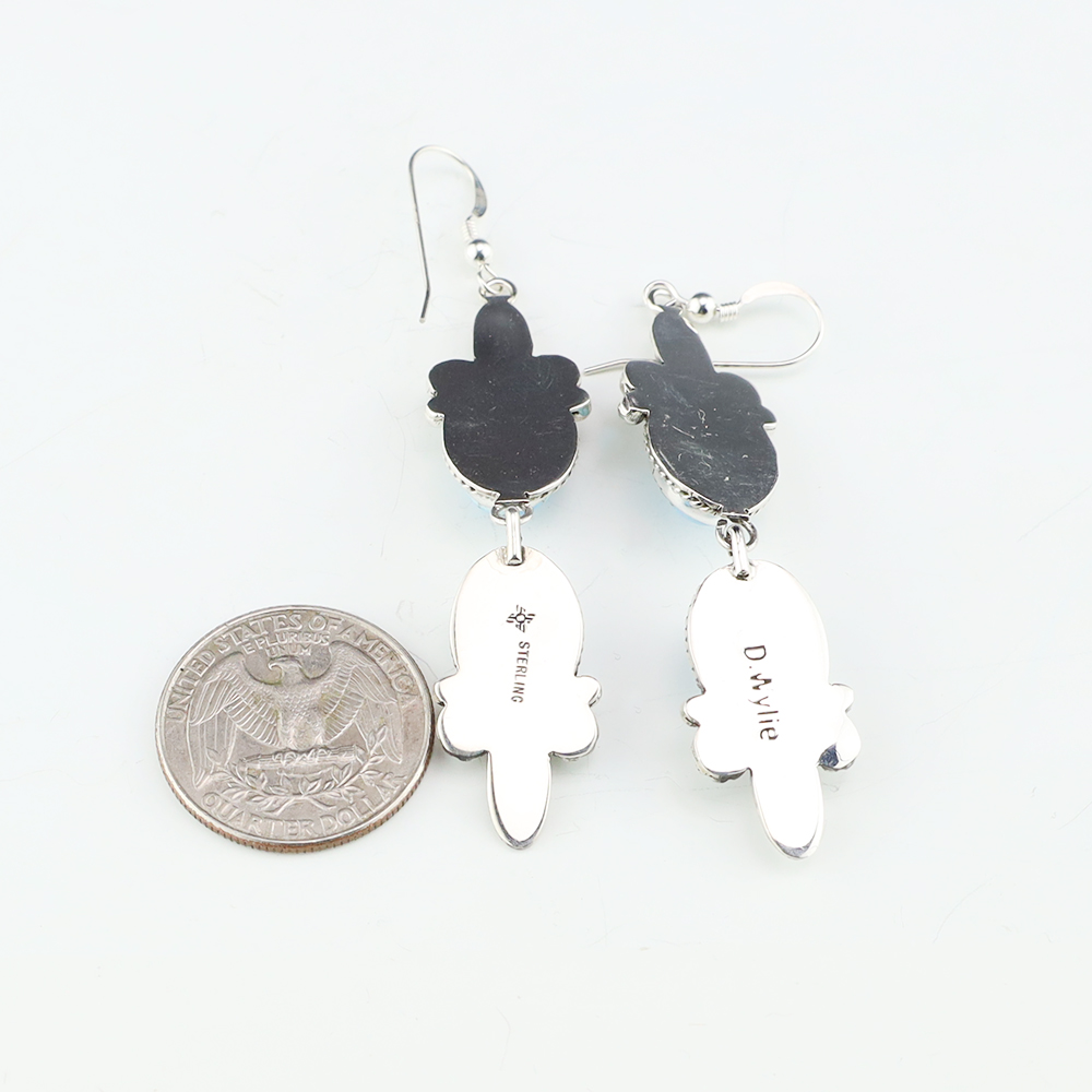 Gorgeous earrings hand made out of sterling silver and Golden Hills Turquoise. Hand made by Navajo silversmith Darrell Wylie. These fabulous earrings will become a versatile accessory in your jewelry collection. Weighs 16 grams. Signed.