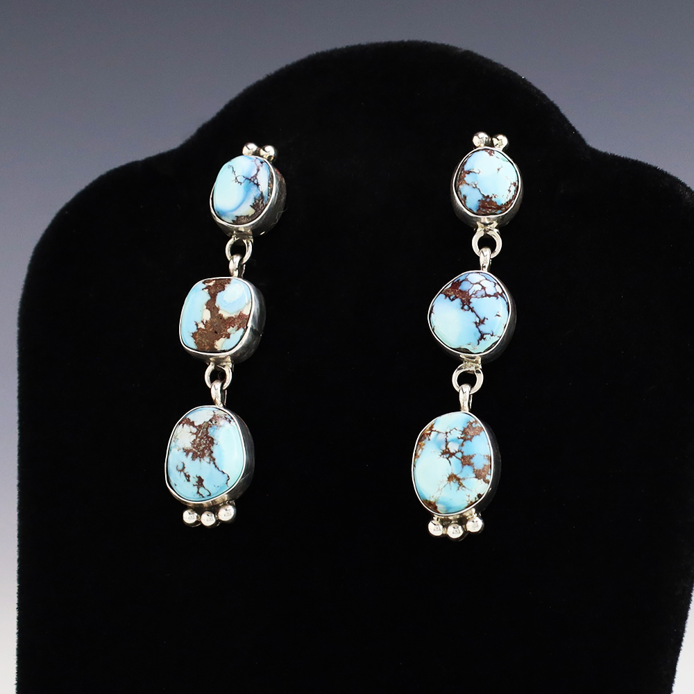 Gorgeous earrings hand made out of sterling silver and Golden Hills Turquoise. Hand made by Navajo silversmith Darrell Wylie. These fabulous earrings will become a versatile accessory in your jewelry collection. Weighs 10 grams. Signed.