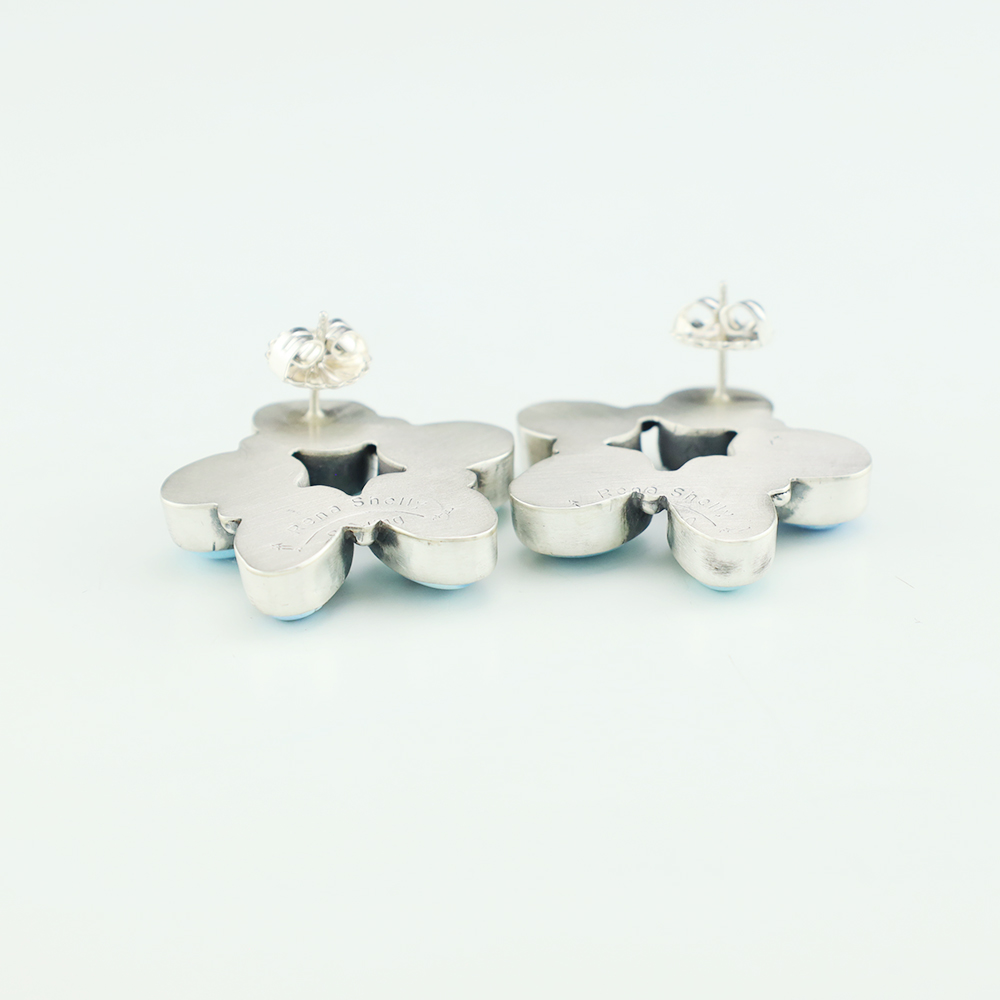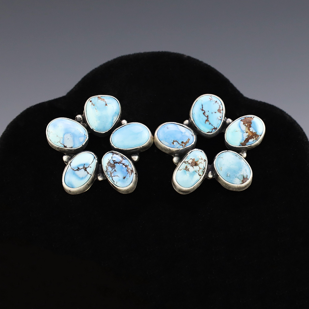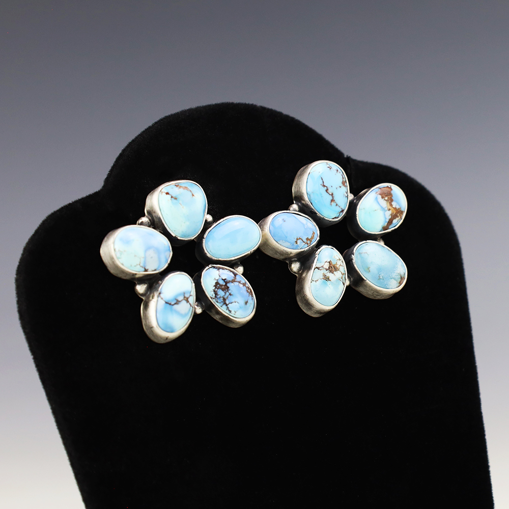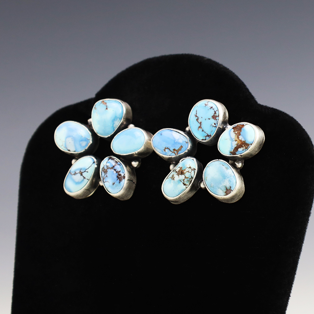 Gorgeous cluster earrings hand made by Navajo silversmith Rena Shelly. The earrings are sterling silver and set with Golden Hills Turquoise stones. These fabulous earrings will become a versatile accessory in your jewelry collection. Weighs 18 grams. Signed.