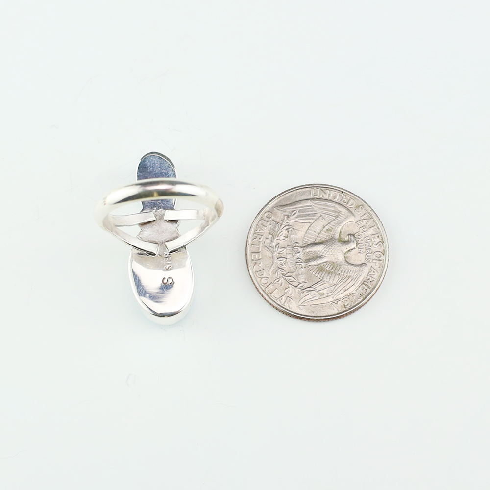 Amazing inlay work! Zuni jewelry makers, Nancy and Sheldon Westika created this magnificent ring. Made out of sterling silver and inlaid with Kingman Turquoise and Jet. Zuni artists are known for their lapidary work. The Westikas have been making jewelry since the 1970’s and they are known for their fine...