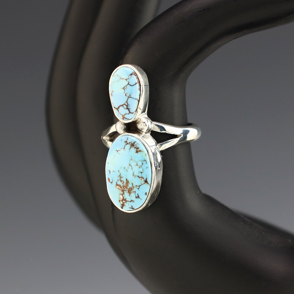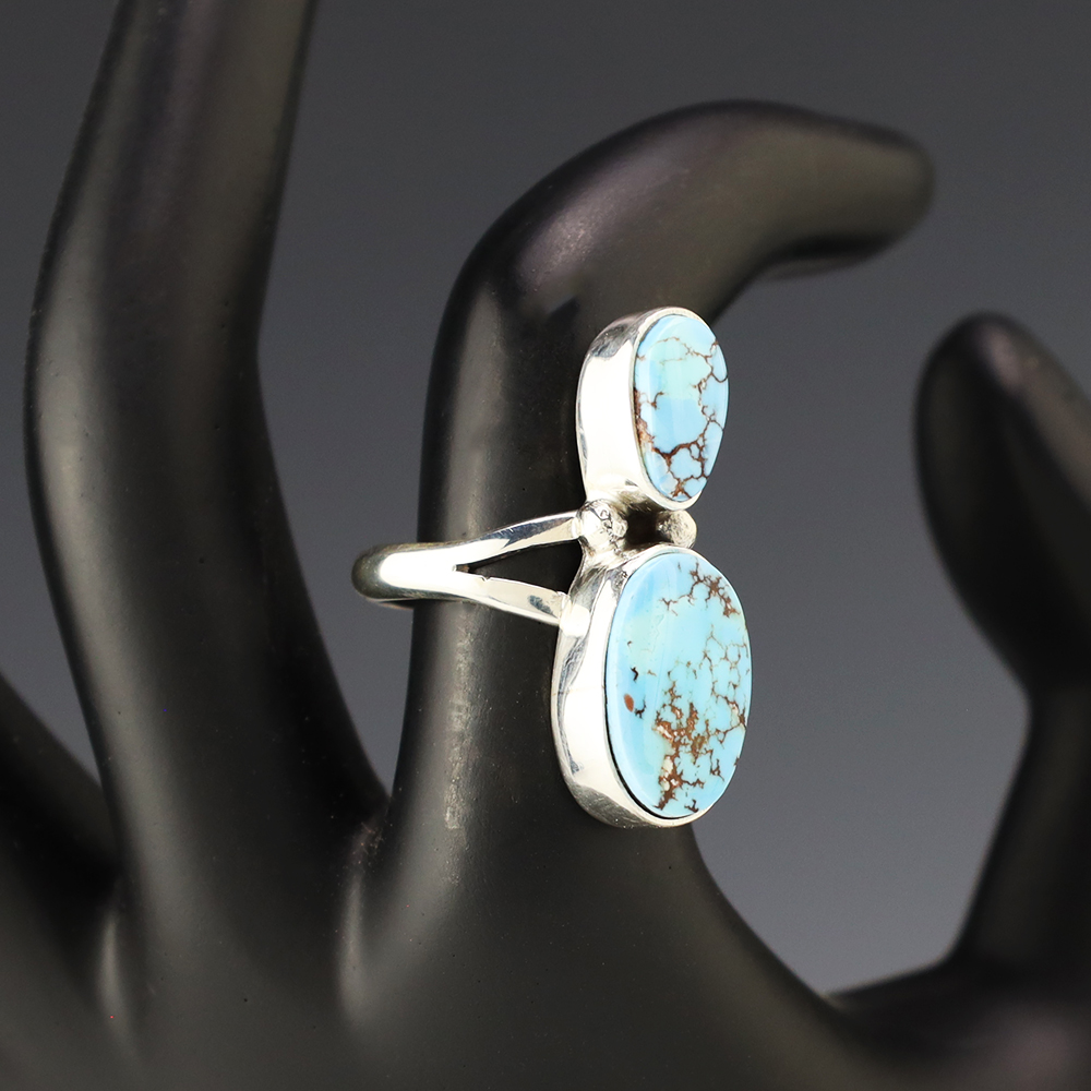 This ring is a great representation of hand made Navajo jewelry and will make a statement on your hand. A beautiful piece of Golden Hills Turquoise is set into a sterling silver setting. Weighs 6 grams. Size 7. Signed