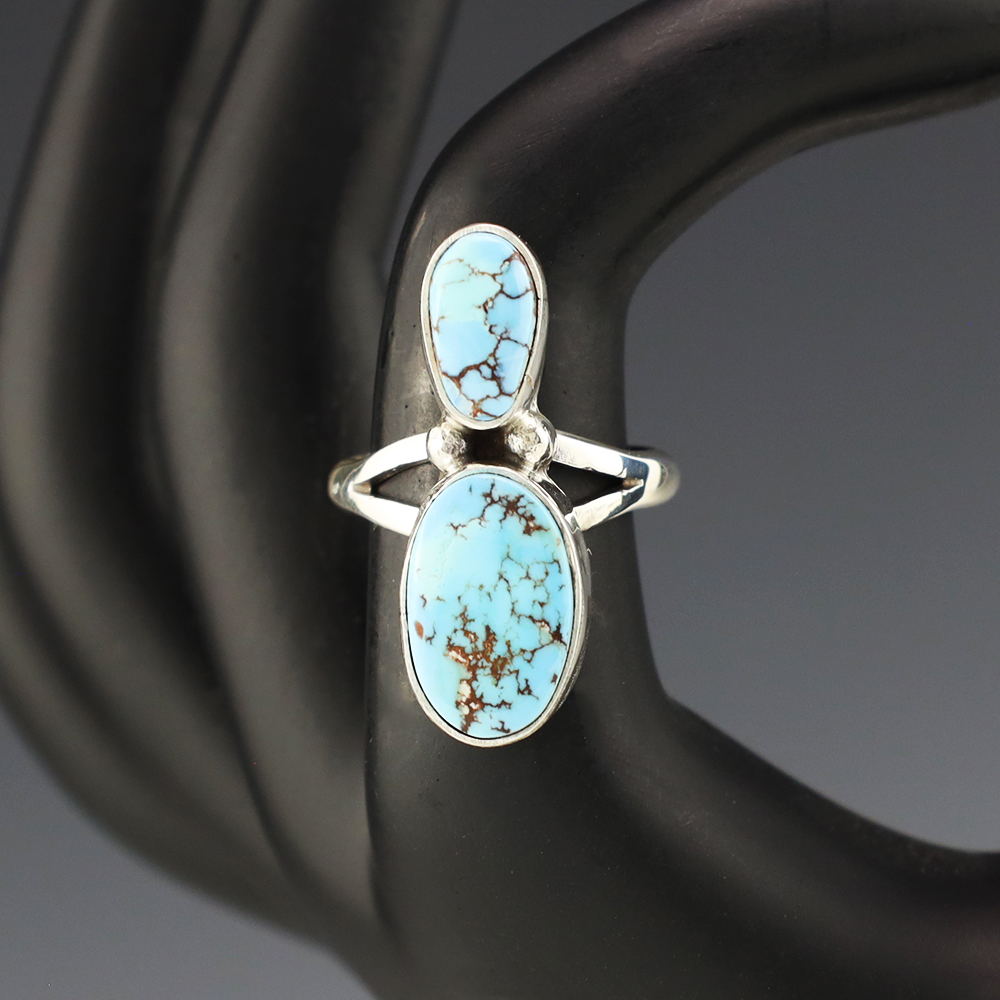 This ring is a great representation of hand made Navajo jewelry and will make a statement on your hand. A beautiful piece of Golden Hills Turquoise is set into a sterling silver setting. Weighs 6 grams. Size 7. Signed
