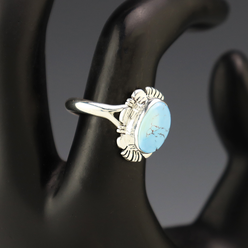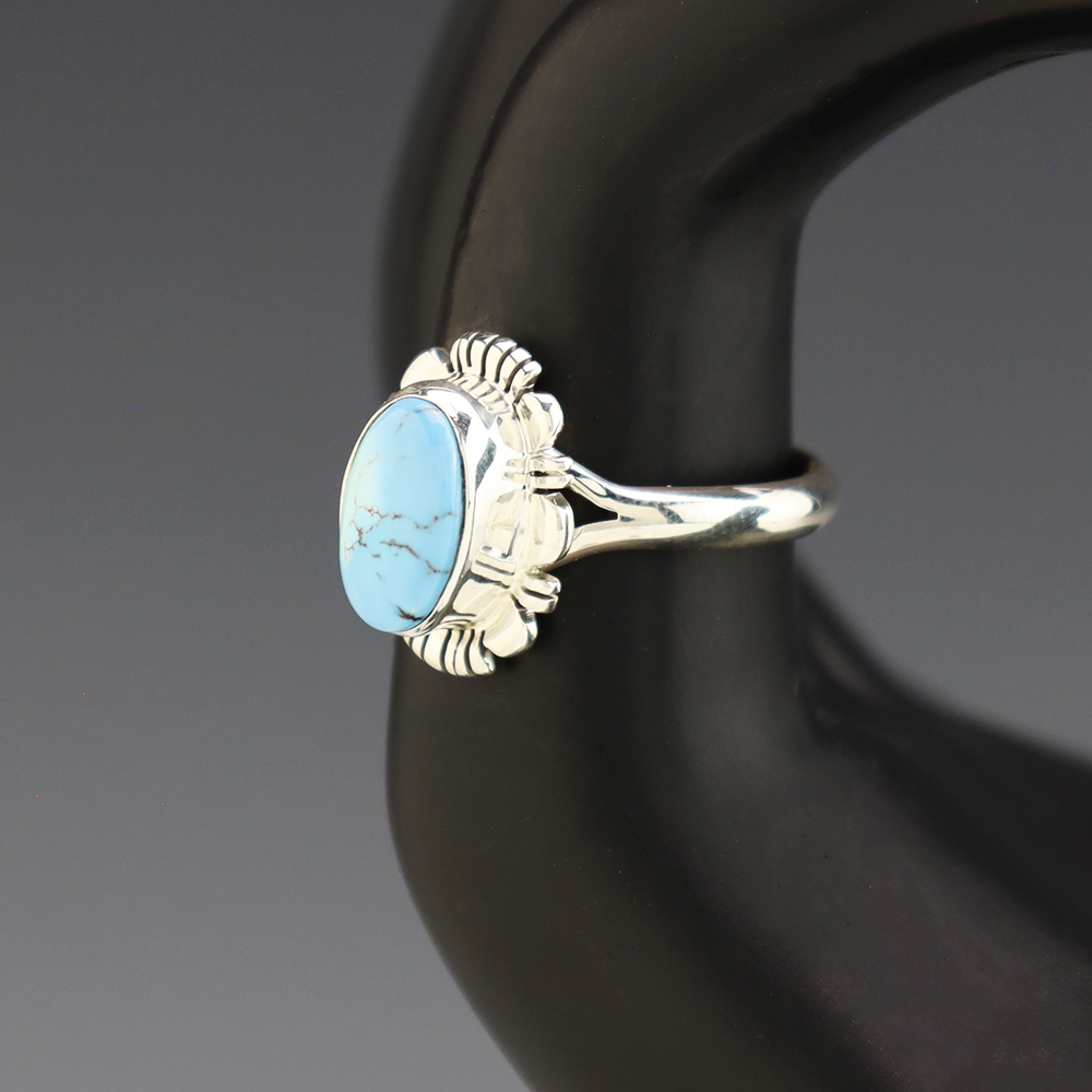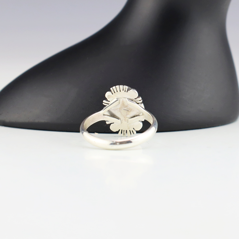 Amazing inlay work! Zuni jewelry makers, Nancy and Sheldon Westika created this magnificent ring. Made out of sterling silver and inlaid with Kingman Turquoise and Jet. Zuni artists are known for their lapidary work. The Westikas have been making jewelry since the 1970’s and they are known for their fine...