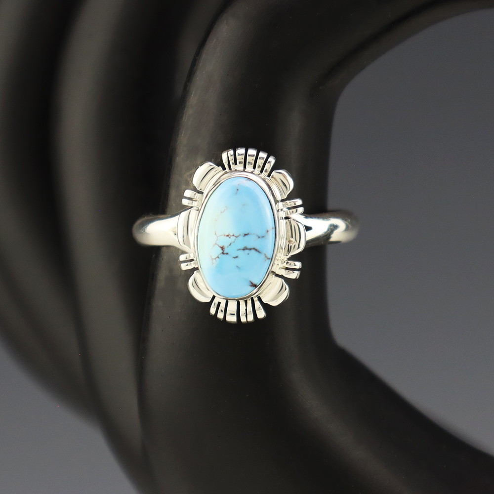Amazing inlay work! Zuni jewelry makers, Nancy and Sheldon Westika created this magnificent ring. Made out of sterling silver and inlaid with Kingman Turquoise and Jet. Zuni artists are known for their lapidary work. The Westikas have been making jewelry since the 1970’s and they are known for their fine...