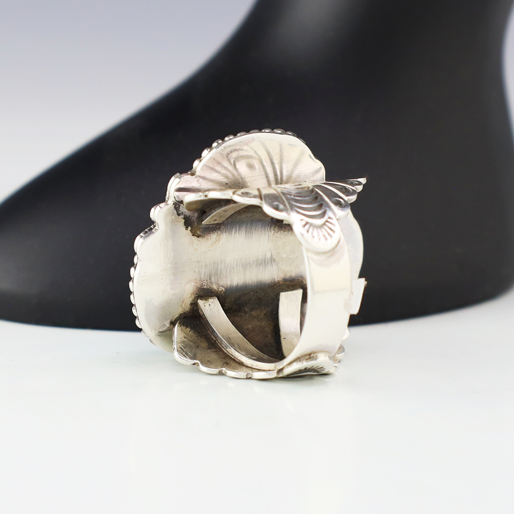 Zuni jewelry makers, Nancy and Sheldon Westika hand crafted this magnificent ring. Made out of sterling silver and inlaid with Kingman Turquoise and Jet. Zuni artists are known for their lapidary work. The Westikas have been making jewelry since the 1970’s and they are known for their fine inlay work. ...