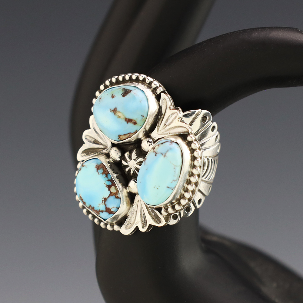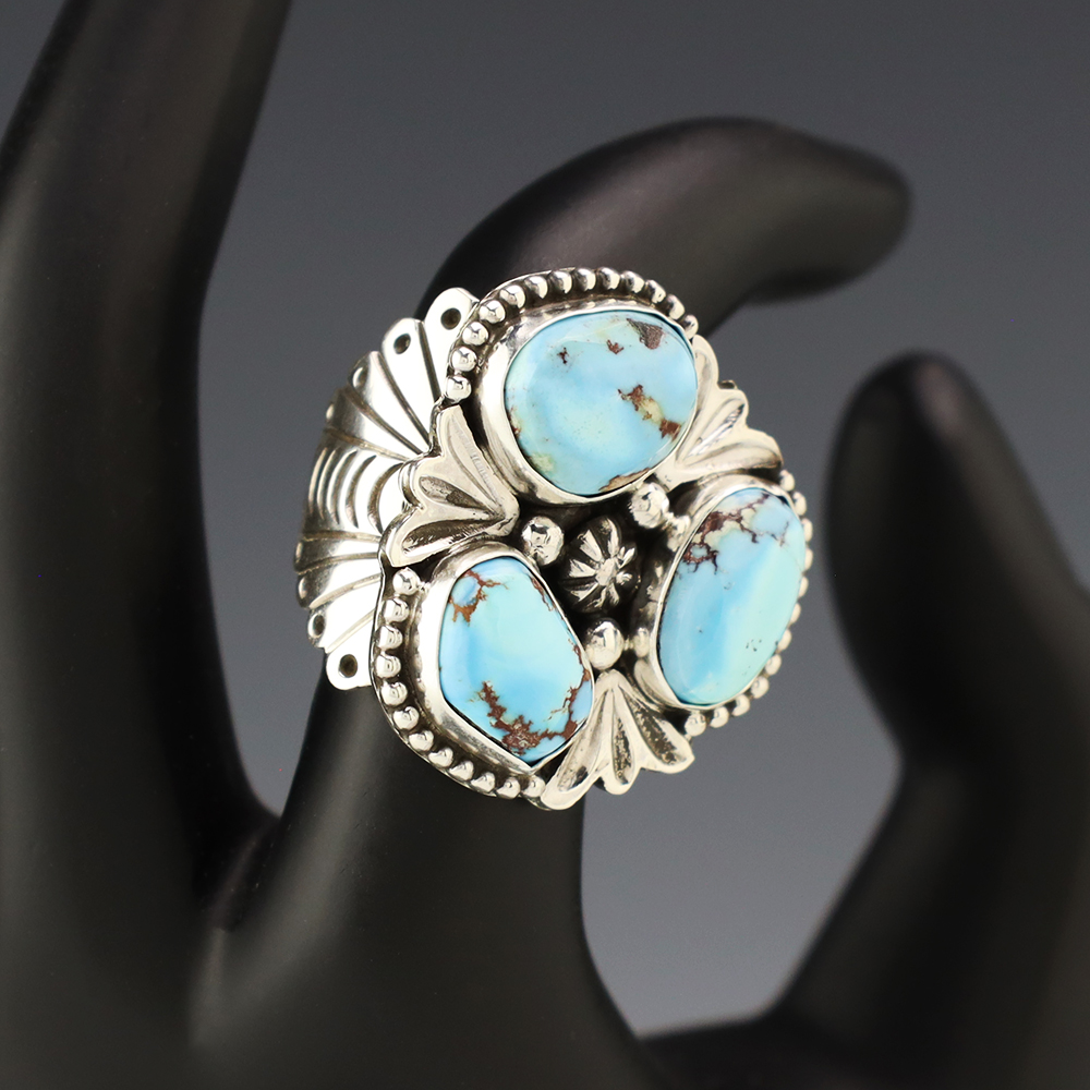 This ring is a great representation of hand made Navajo jewelry and will make a statement on your hand. Beautiful pieces of Golden Hills Turquoise are set into a sterling silver setting. Handmade by Navajo artist Eula Wylie. Weighs 16 grams. Size 6 1/2.