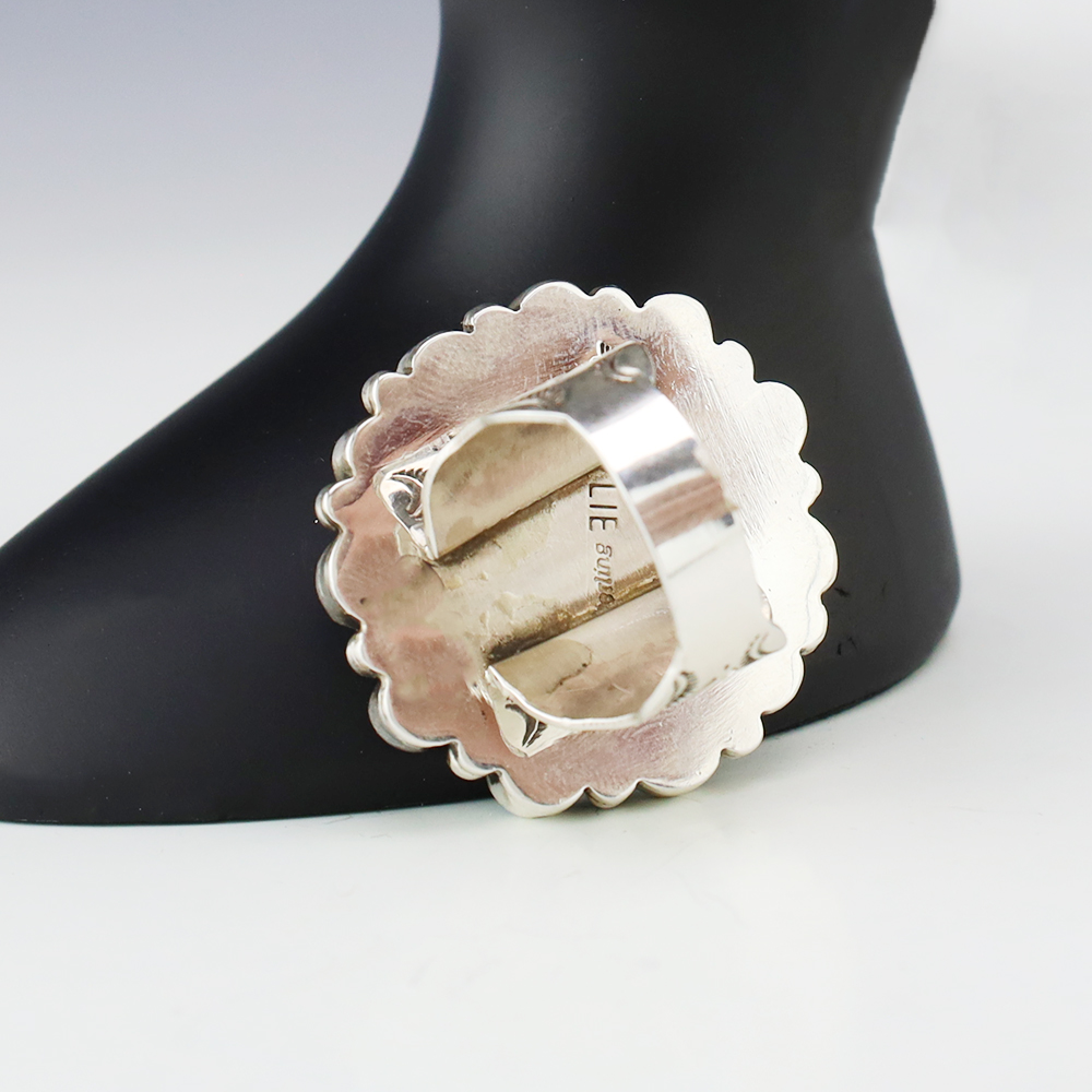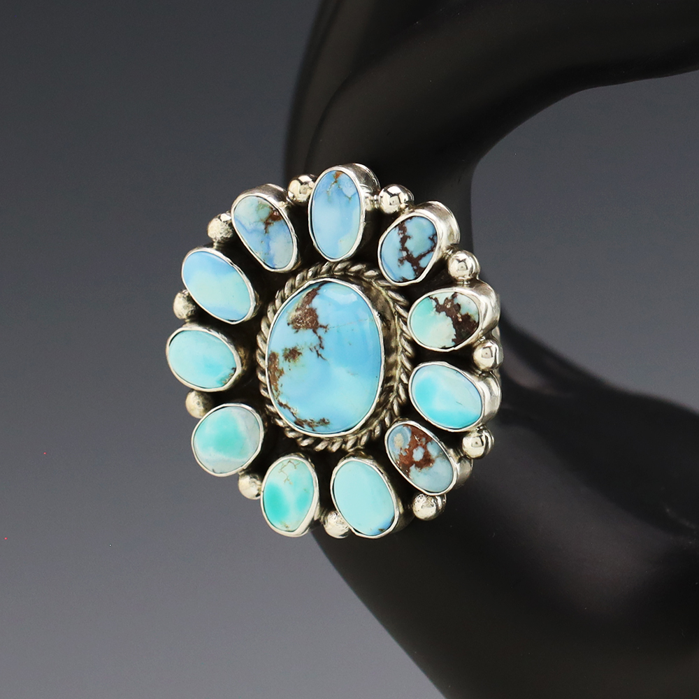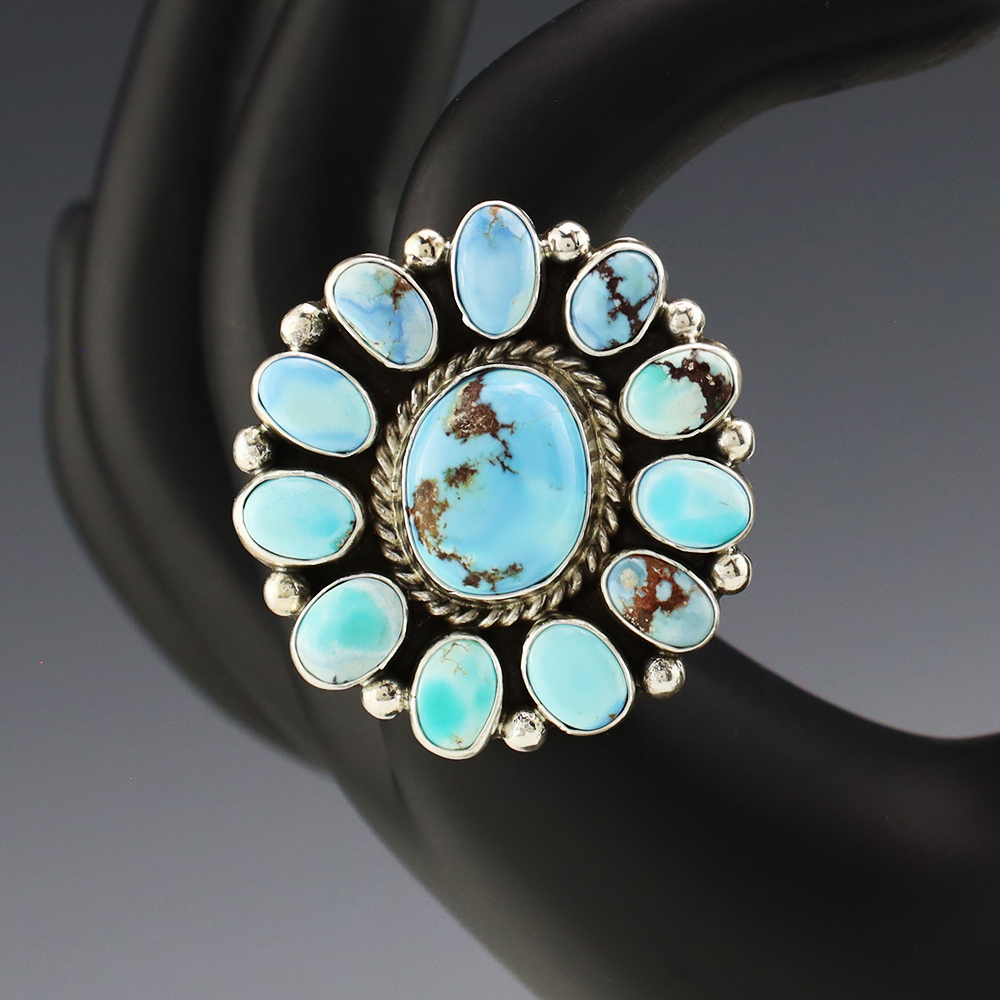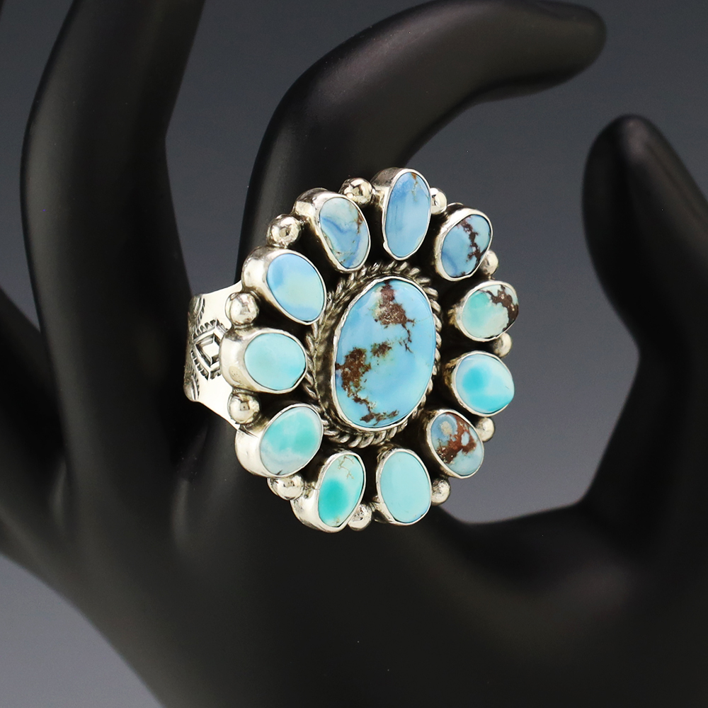 This ring is a great representation of hand made Navajo jewelry and will make a statement on your hand. Beautiful pieces of Golden Hills Turquoise are set into a sterling silver setting. Handmade by Navajo artist Eula Wylie. Weighs 20 grams. Size 9 1/4. Signed.