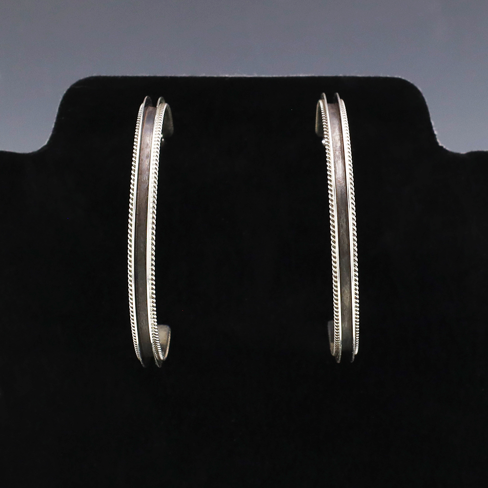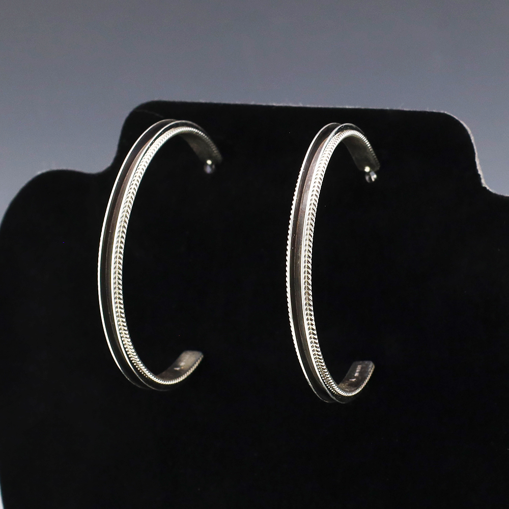 Beautiful hoop earrings hand made out of sterling silver. Hand made by Navajo silversmith Darrell Yazzie. These fabulous earrings will become a versatile accessory in your jewelry collection. Weighs 26 grams. Signed.