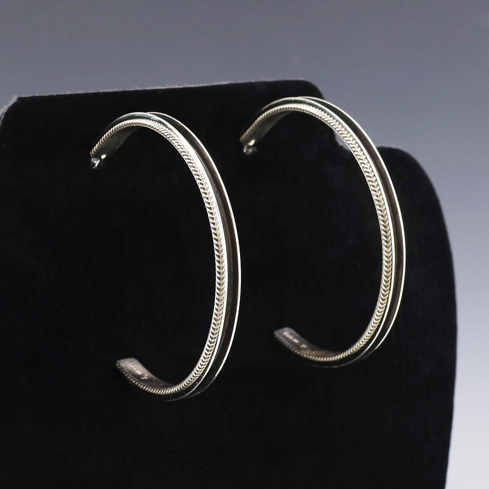 Beautiful hoop earrings hand made out of sterling silver. Hand made by Navajo silversmith Darrell Yazzie. These fabulous earrings will become a versatile accessory in your jewelry collection. Weighs 26 grams. Signed.