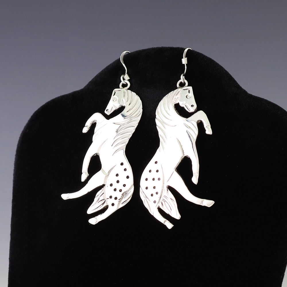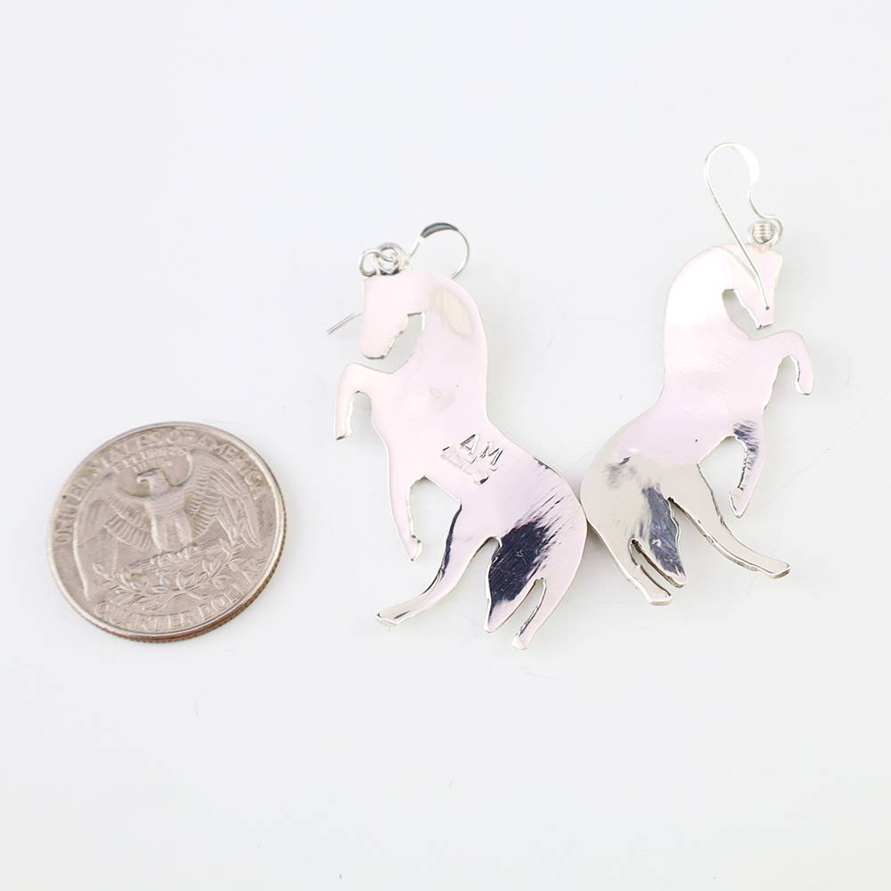 Lovely horse earrings hand made out of sterling silver by Navajo silversmith Allison Manuelito. These fabulous earrings will become a versatile accessory in your jewelry collection. Weighs 10 grams. Signed
