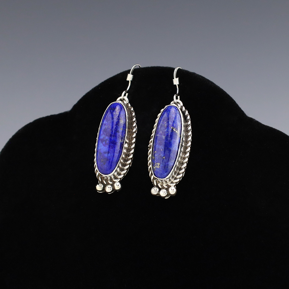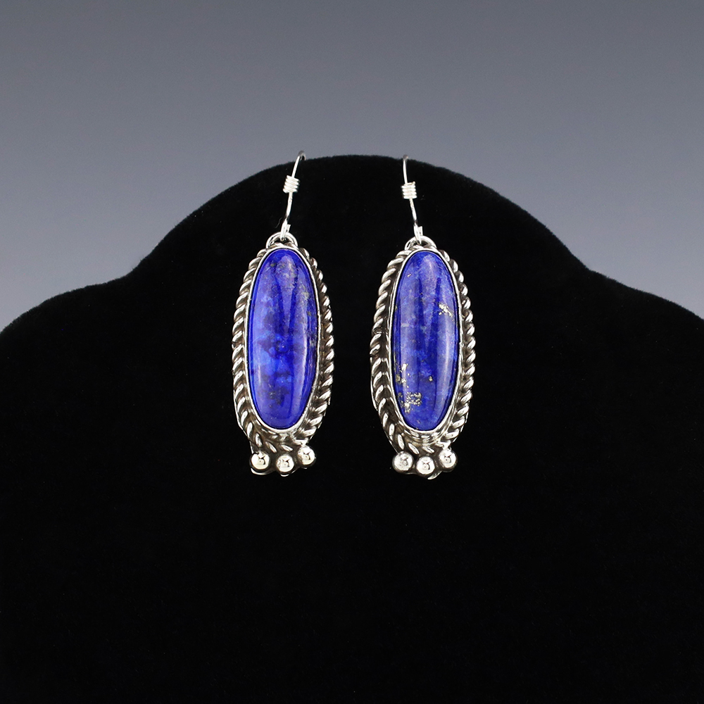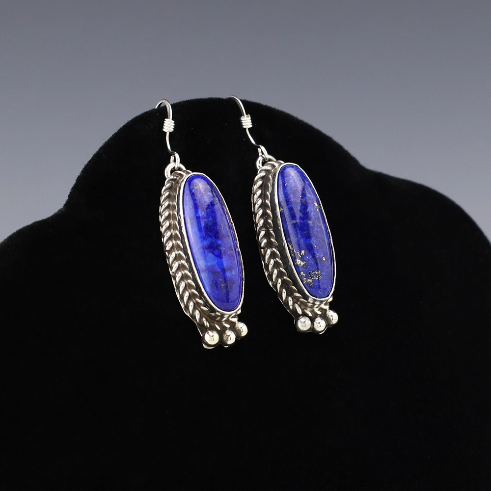 Beautiful earrings hand made out of sterling silver and Lapis by Navajo silversmith Priscilla Smith. These wonderful earrings will become a versatile accessory in your jewelry collection. Weighs 8 grams. Signed