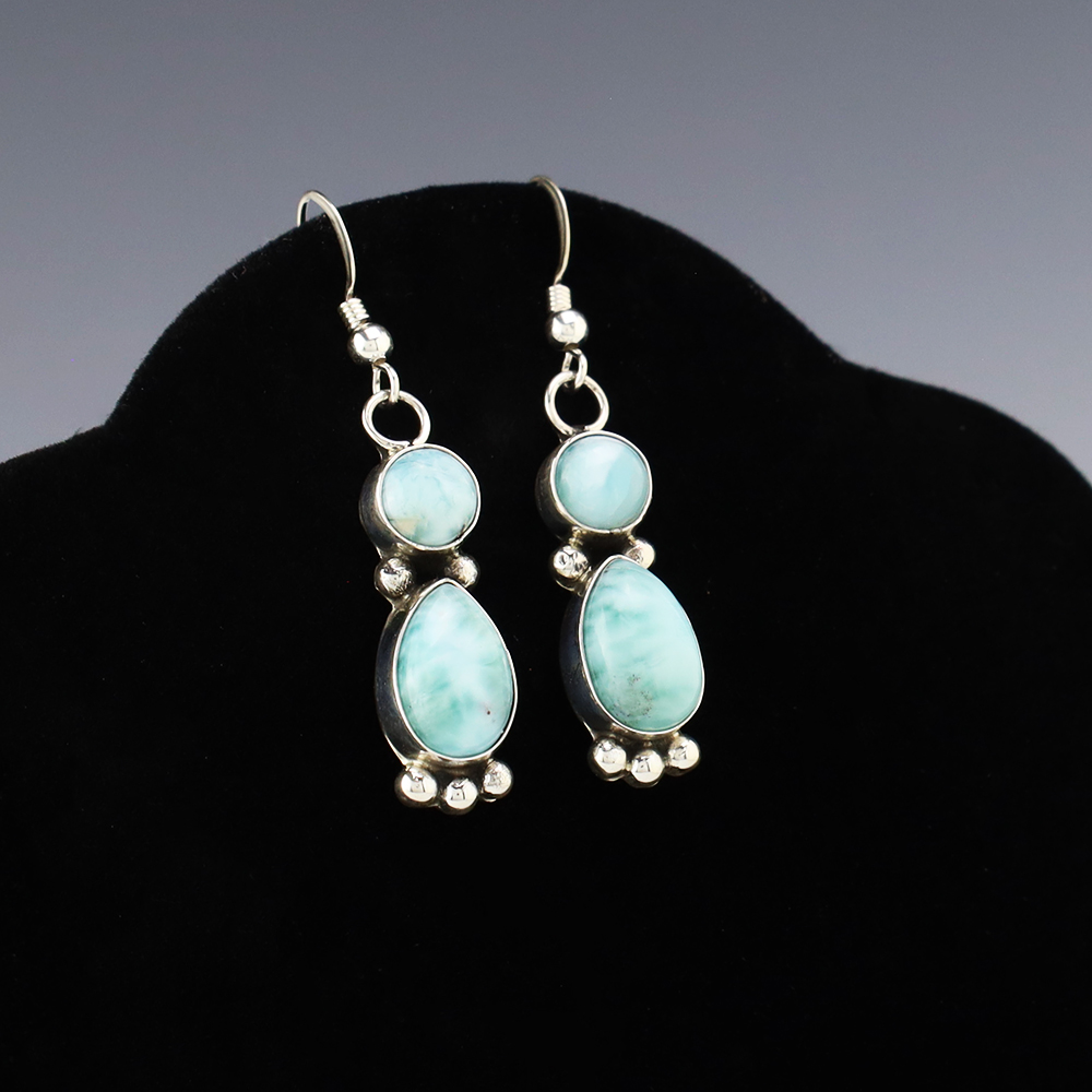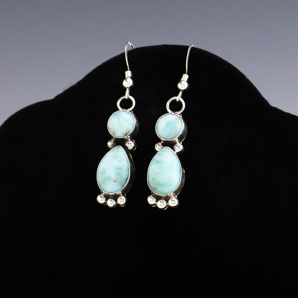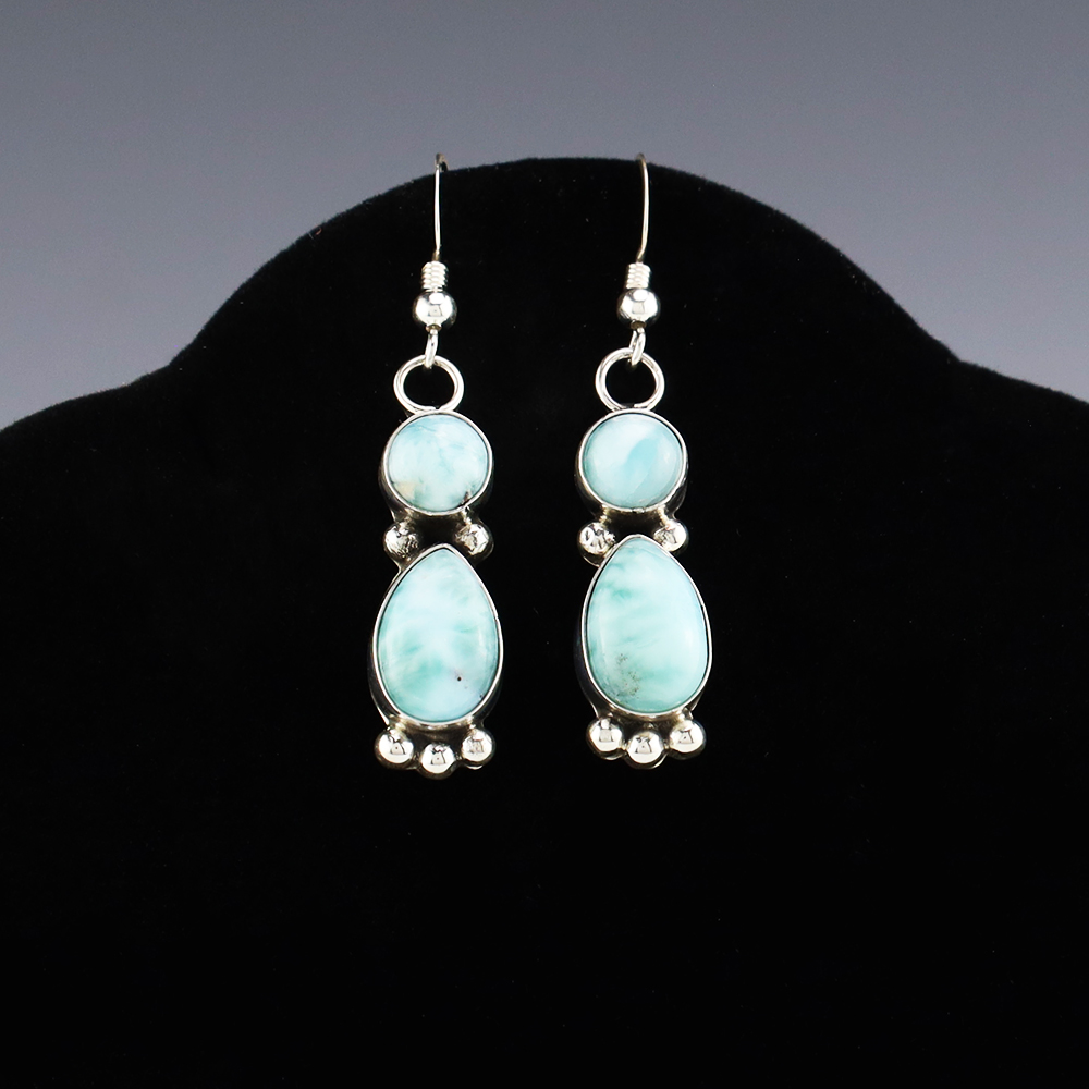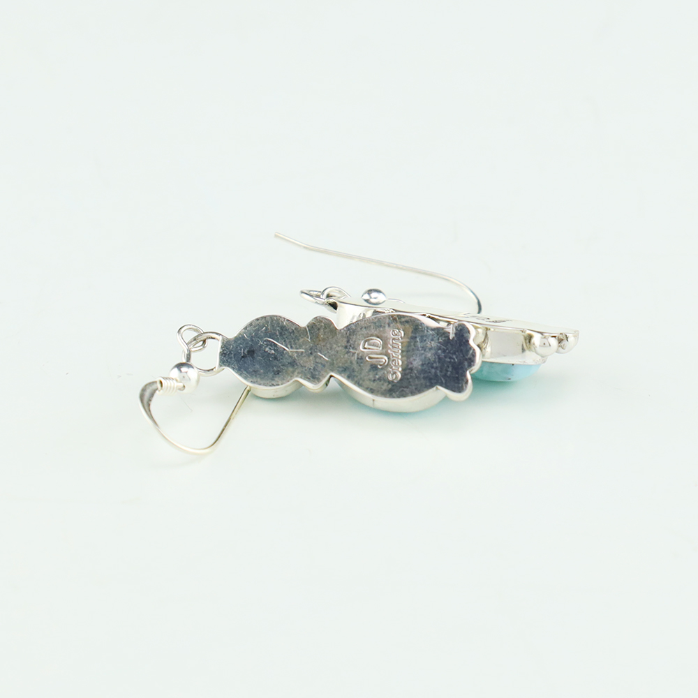 Beautiful earrings hand made out of sterling silver and Larimar by Navajo artist Jones Delgarito. These fabulous earrings will become a versatile accessory in your jewelry collection. Weighs 6 grams. Signed