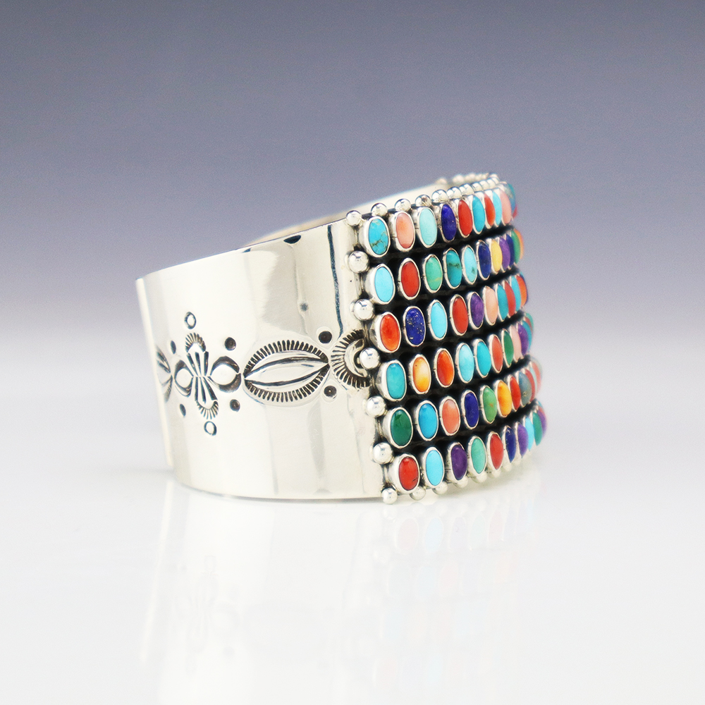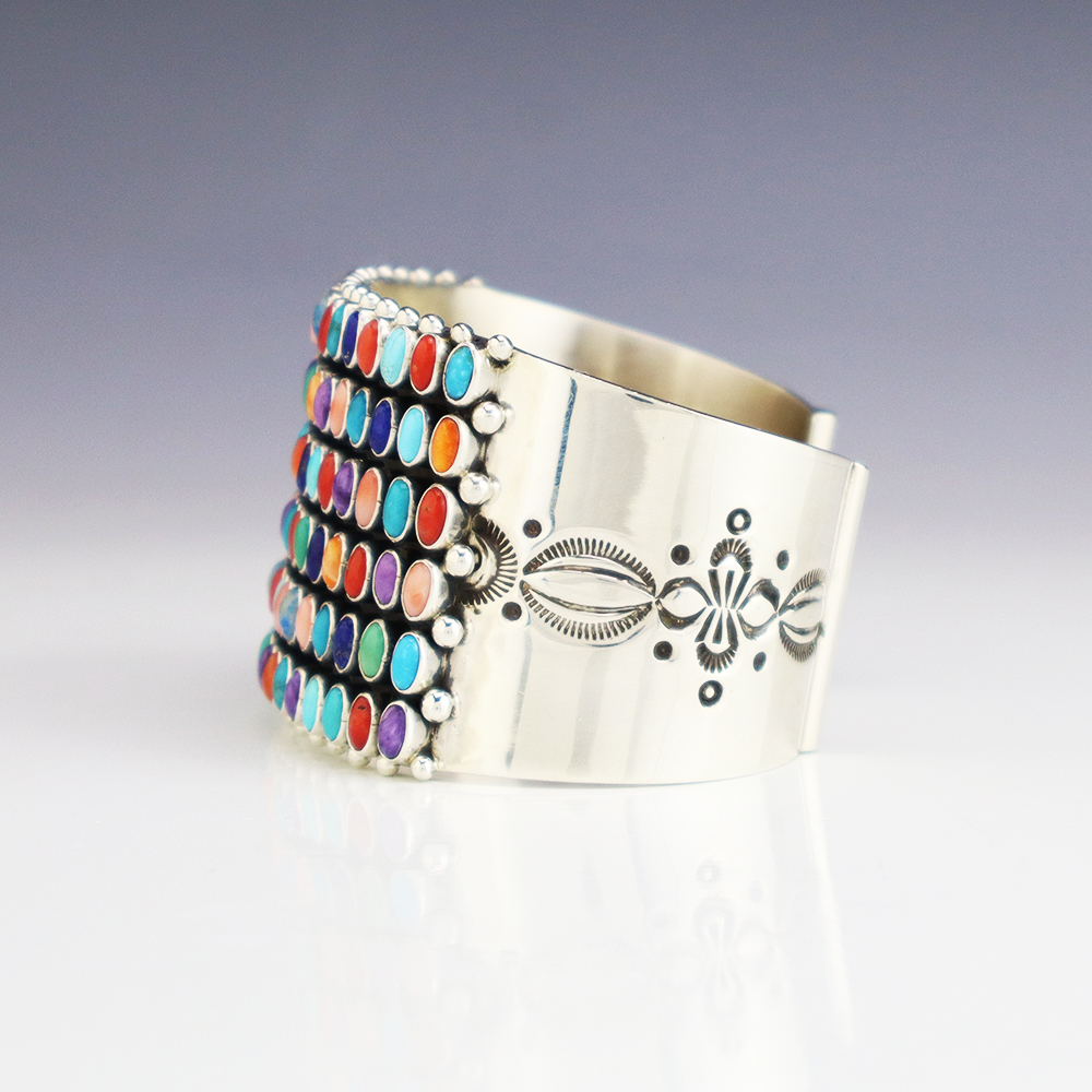 Navajo artist Dee Nez made this exquisite bracelet. Sterling silver with Coral, Pink Coral, Charoite, Spiny Oyster, Lapis, and Turquoise stones. Weighs 76 grams. The entire inner circumference is about 7”, including 1 1/8” opening. (Fits a 7″ wrist). Signed