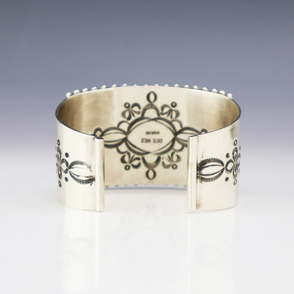 The Navajos began working with silver in the 19th century, and began making things like buckles, bridles, buttons, rings, canteens, hollow beads, earrings, crescent-shaped pendants (called “najas”), bracelets, crosses, powder chargers, tobacco canteens, and conchos (for belts). Their silversmithing skills has evolved and changed throughout the years, and in about 1880 Navajo silversmiths started to set turquoise in their silver work. Traditionally, Navajo artists worked with jewelry techniques like repousee and stamp work, but today they explored in other Native American jewelry making techniques like Zuni inlay work and Hopi overlay work