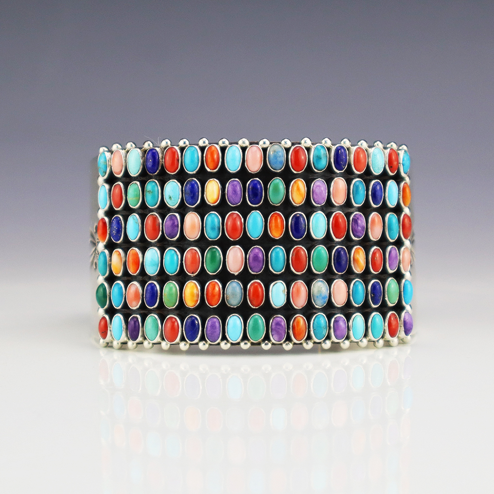 Navajo artist Dee Nez made this exquisite bracelet. Sterling silver with Coral, Pink Coral, Charoite, Spiny Oyster, Lapis, and Turquoise stones. Weighs 76 grams. The entire inner circumference is about 7”, including 1 1/8” opening. (Fits a 7″ wrist). Signed