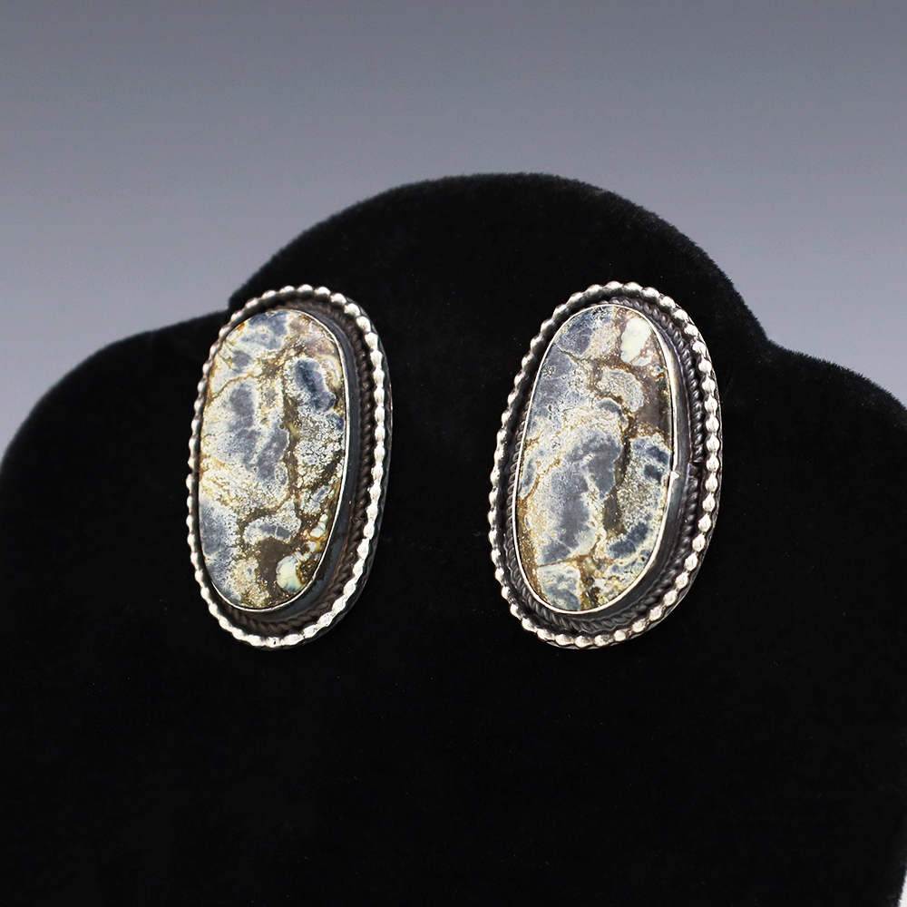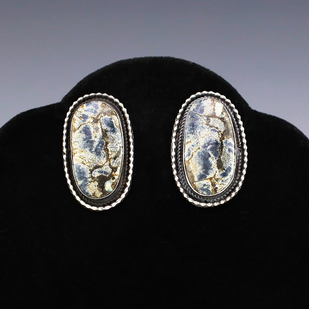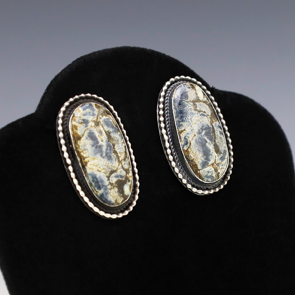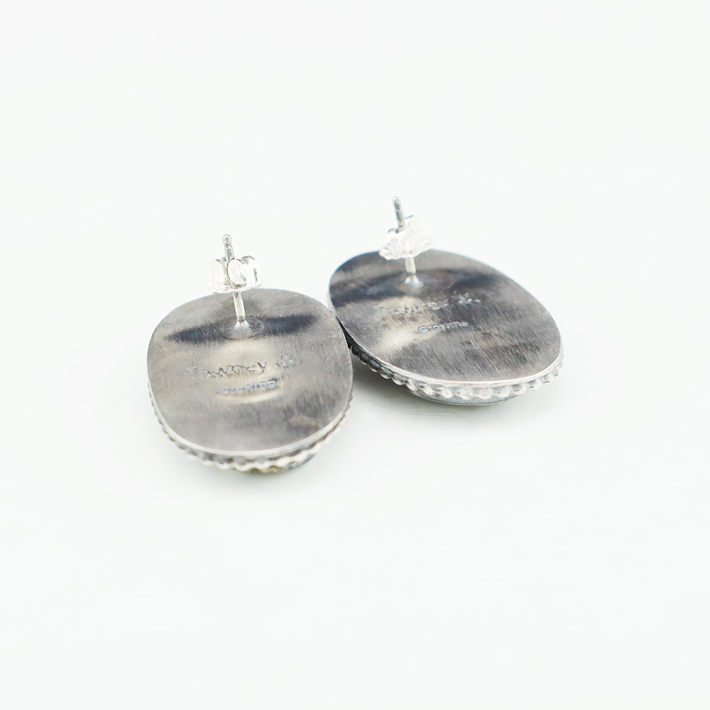 Beautiful post earrings hand made by Navajo silversmith Tawney Willie. The earrings are sterling silver and set with New Lander Variscite stones. These fabulous earrings will become a versatile accessory in your jewelry collection. Weighs 16 grams. Signed.