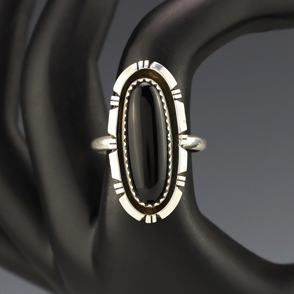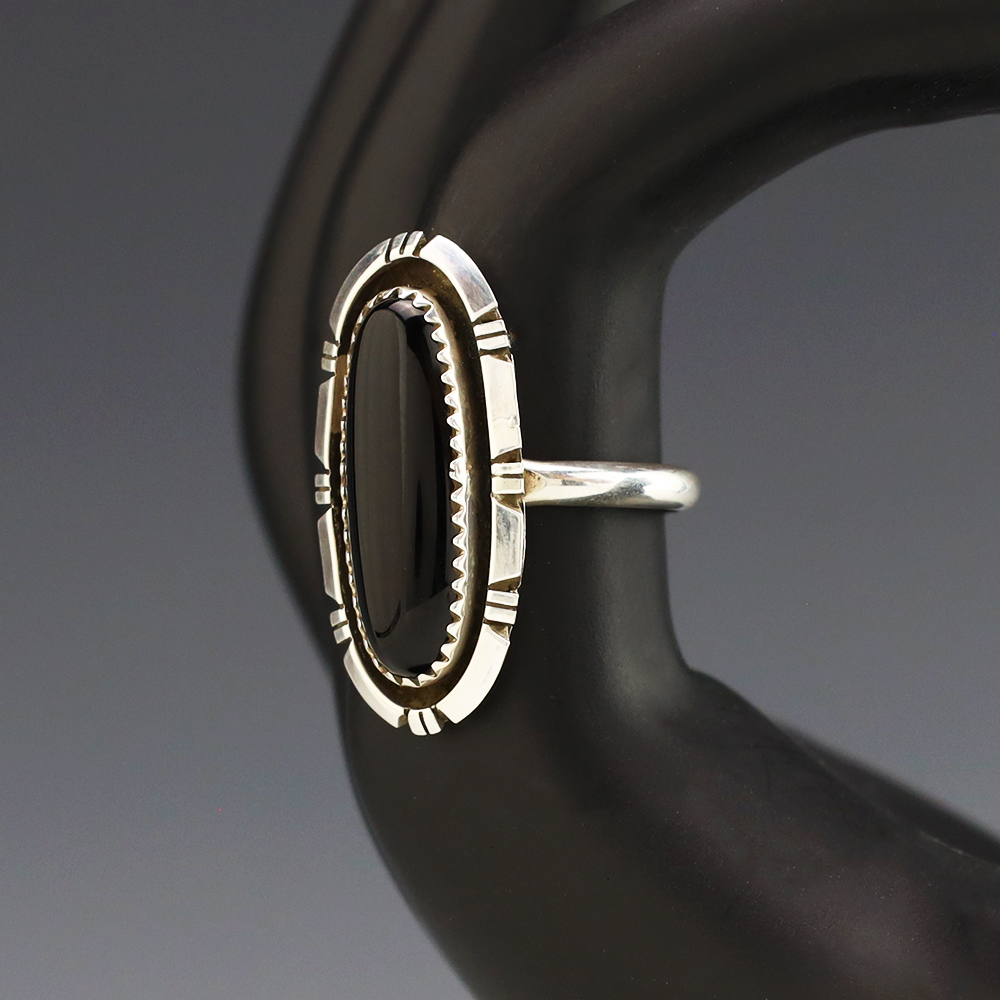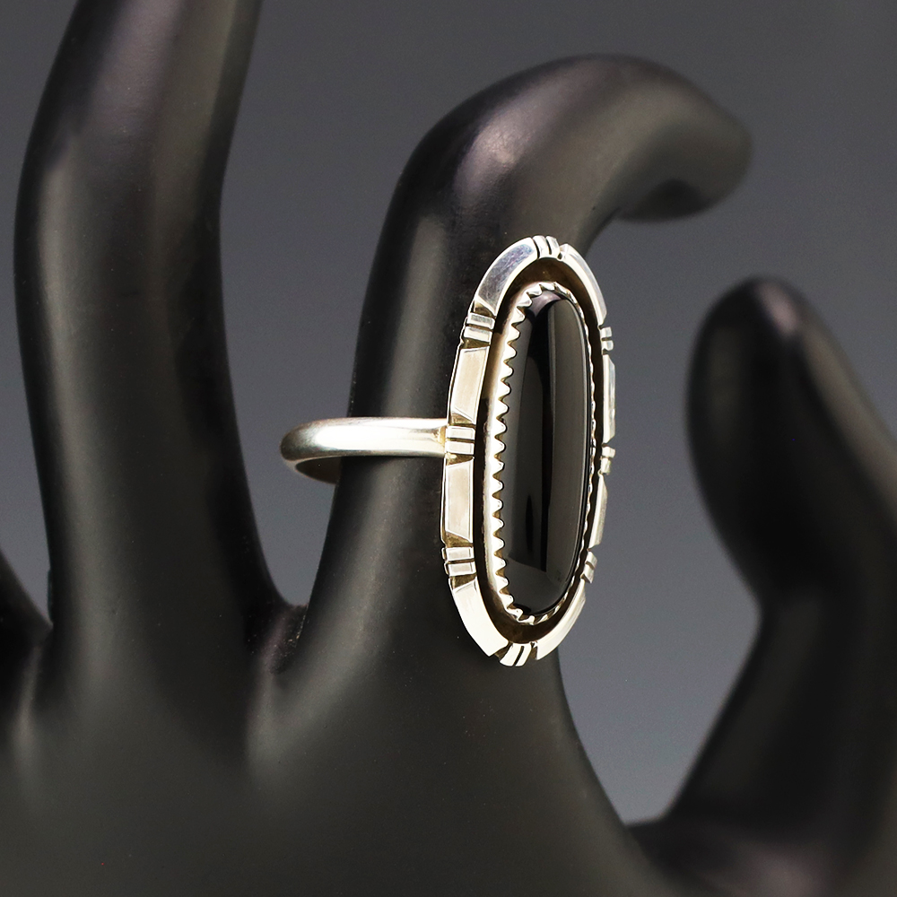 This ring is a great representation of hand made Navajo jewelry and will make a statement on your hand. Onyx is set into a sterling silver setting. Weighs 4 grams. Size 8. Signed