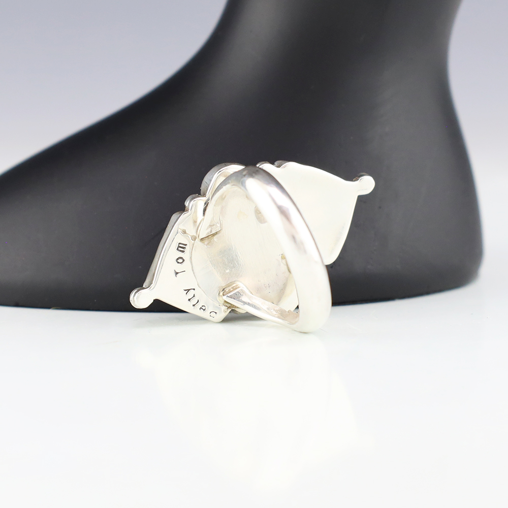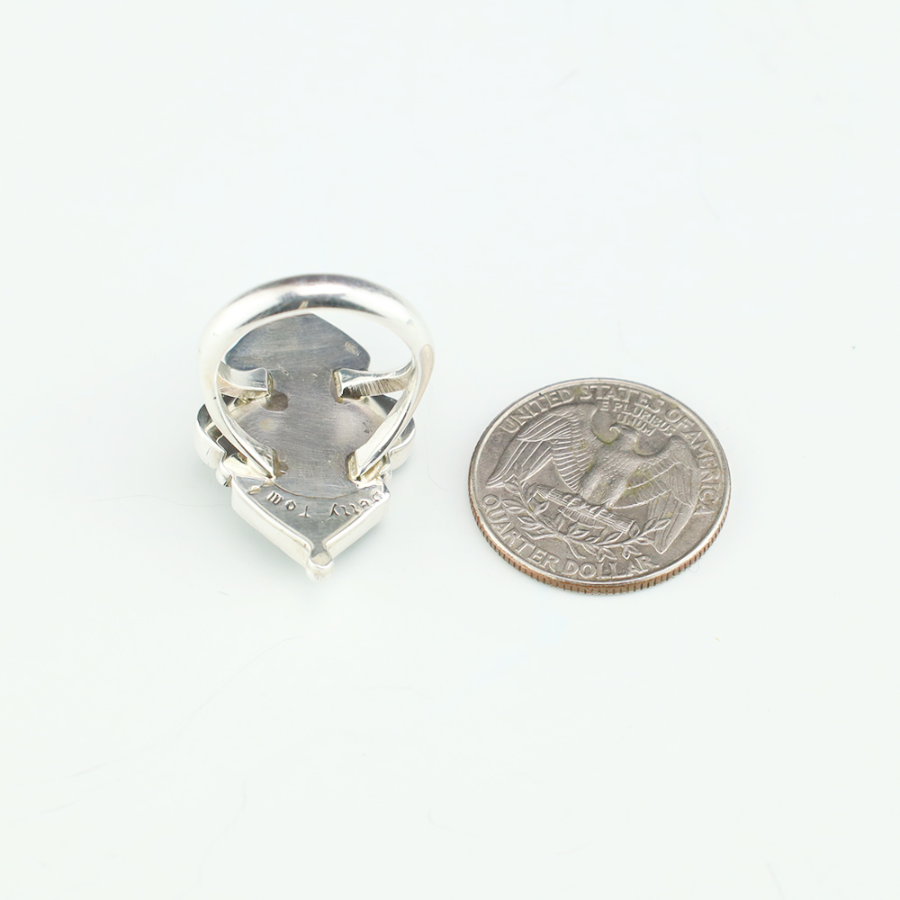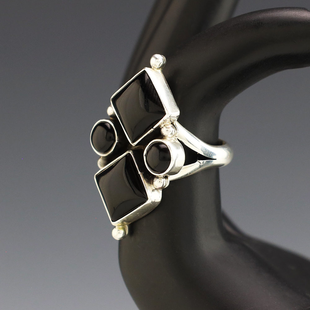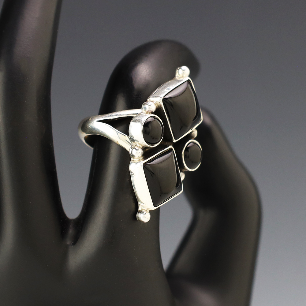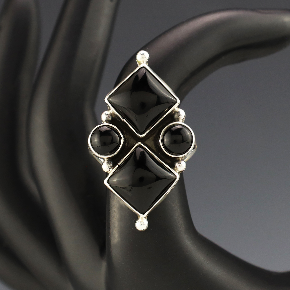 This ring is a great representation of hand made Navajo jewelry and will make a statement on your hand. Onyx is set into a sterling silver setting. Hand made by Navajo artist Betty Tom. Weighs 10 grams. Size 7. Signed