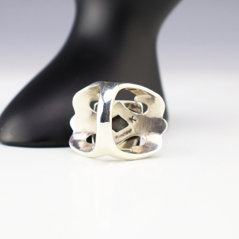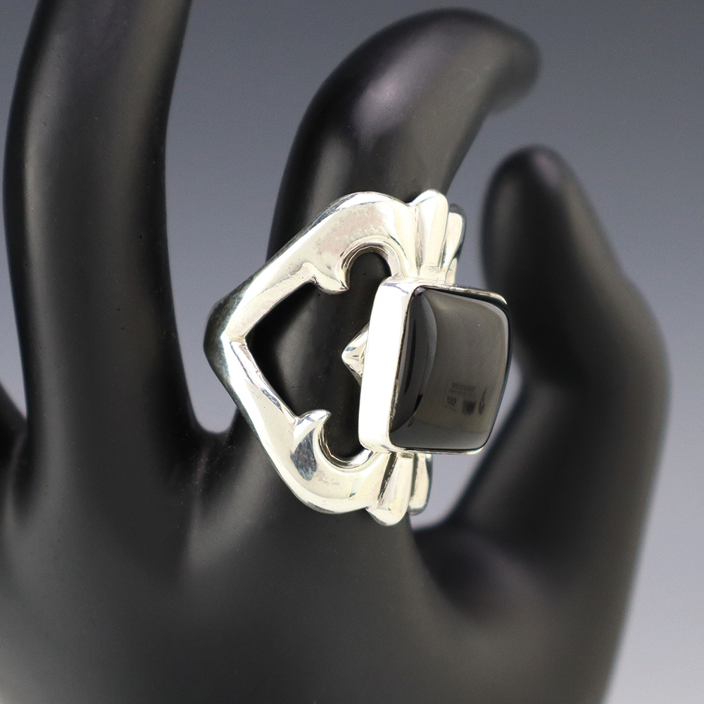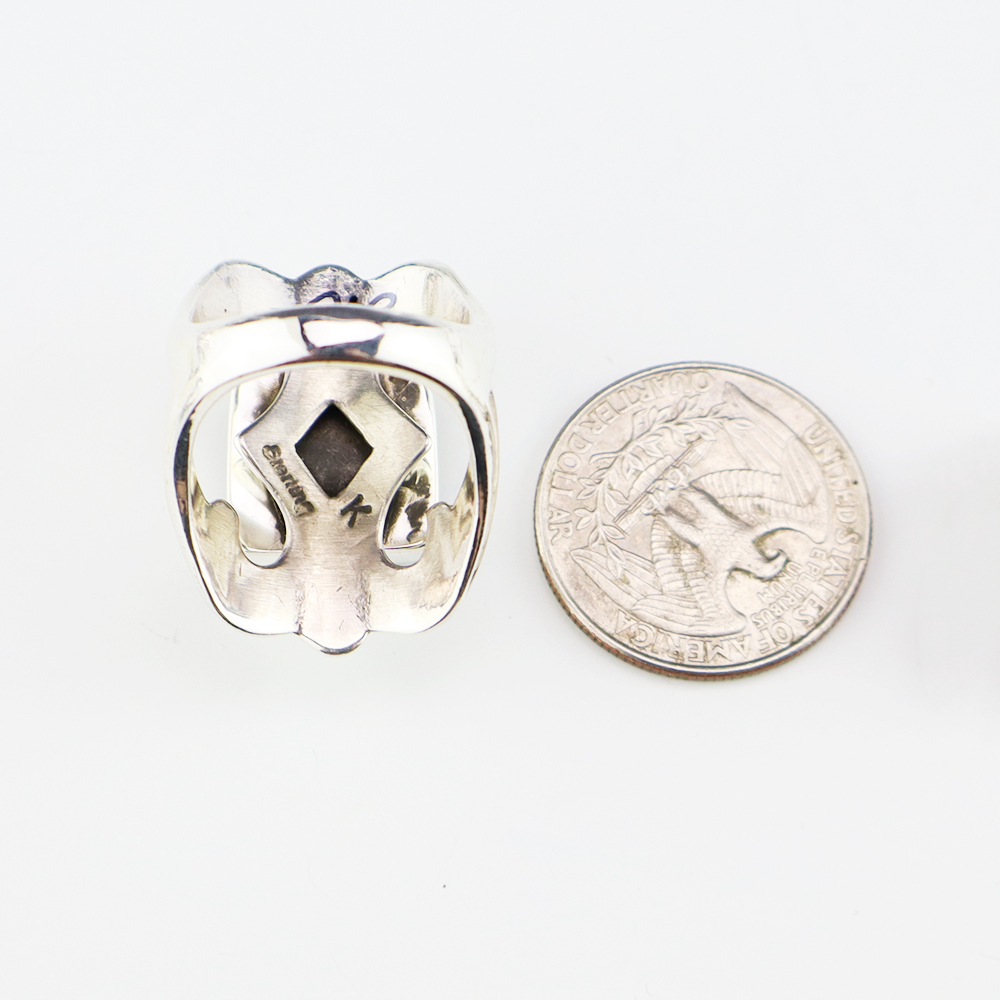 Zuni jewelry makers, Nancy and Sheldon Westika hand crafted this magnificent ring. Made out of sterling silver and inlaid with Kingman Turquoise and Jet. Zuni artists are known for their lapidary work. The Westikas have been making jewelry since the 1970’s and they are known for their fine inlay work. ...