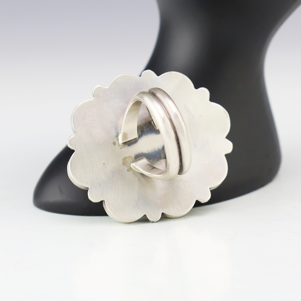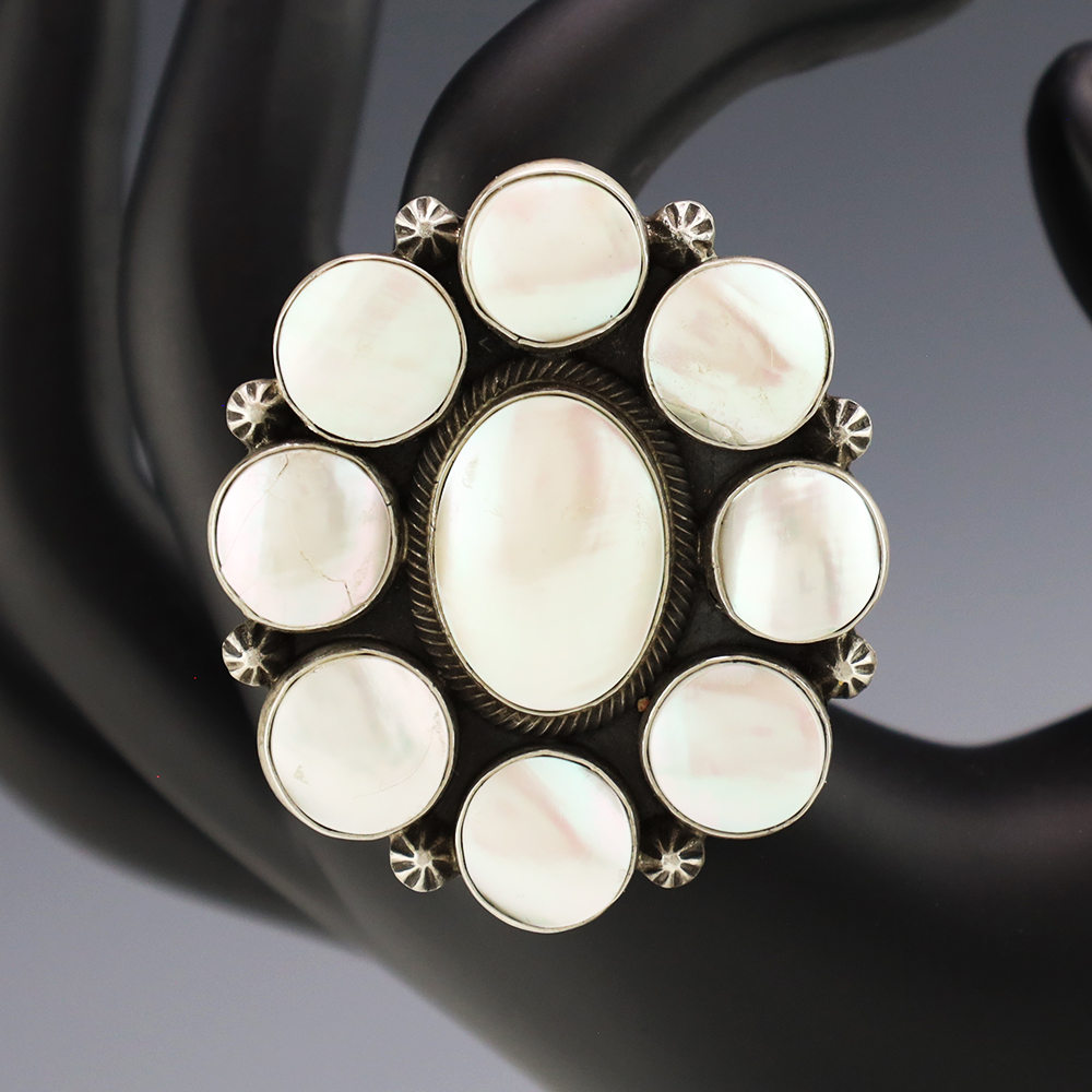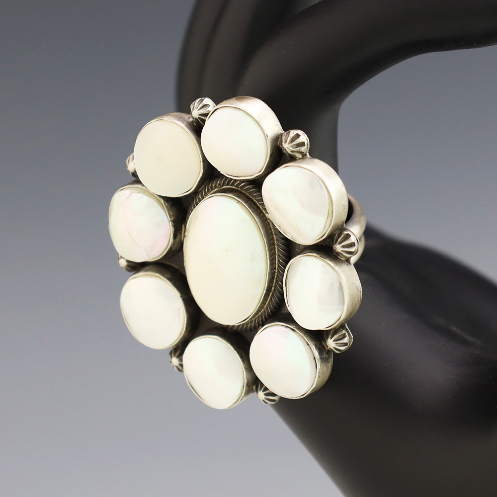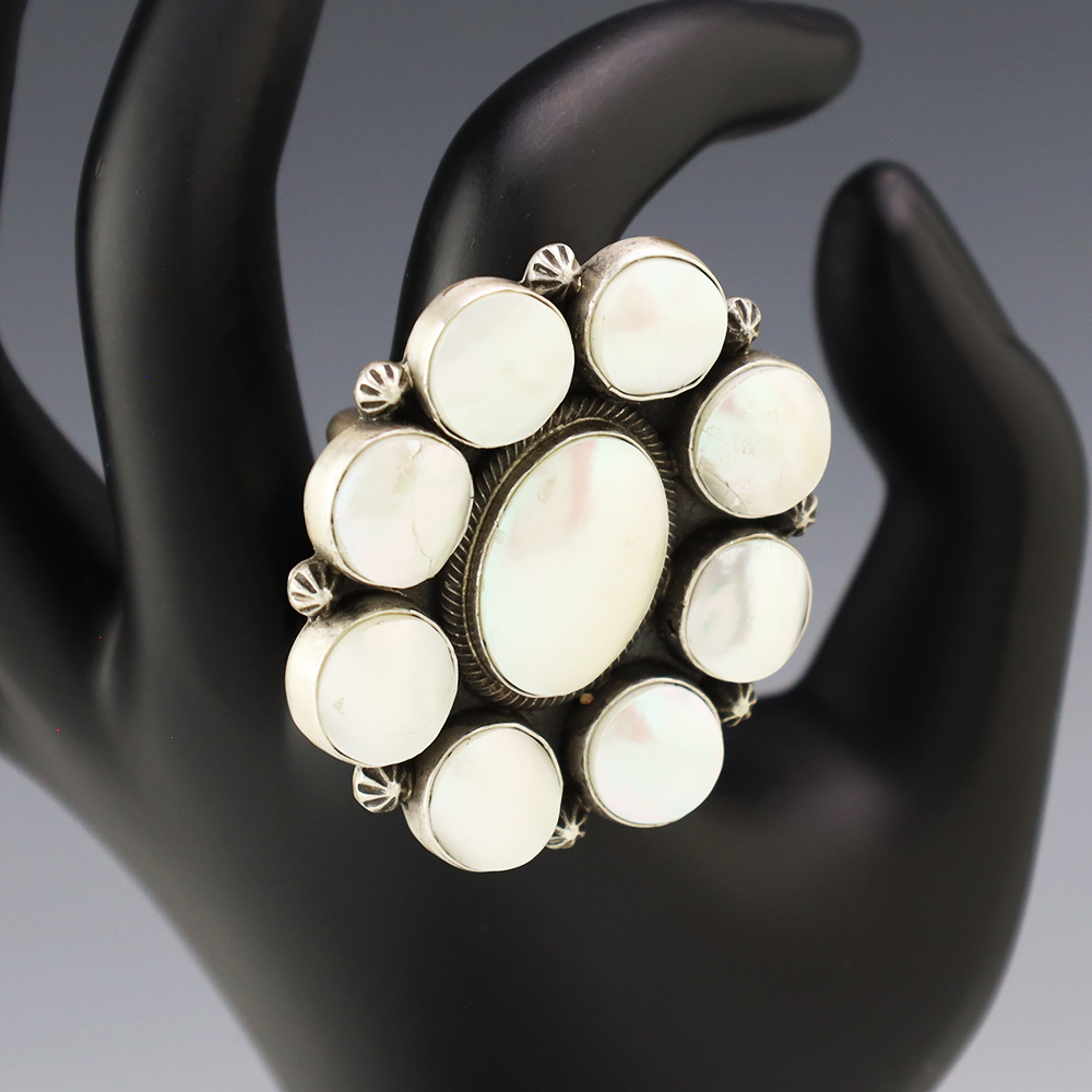This ring is a great representation of hand made Navajo jewelry and will make a statement on your hand. Beautiful Pearls are set into a sterling silver setting. Handmade by Navajo artist Freddie Maloney. Weighs 24 grams. Size 9 1/2. Signed.