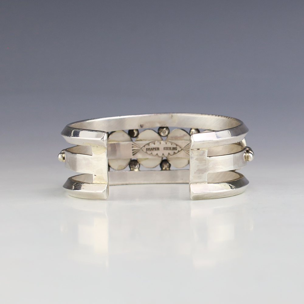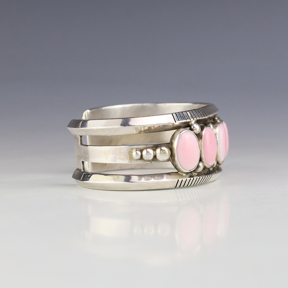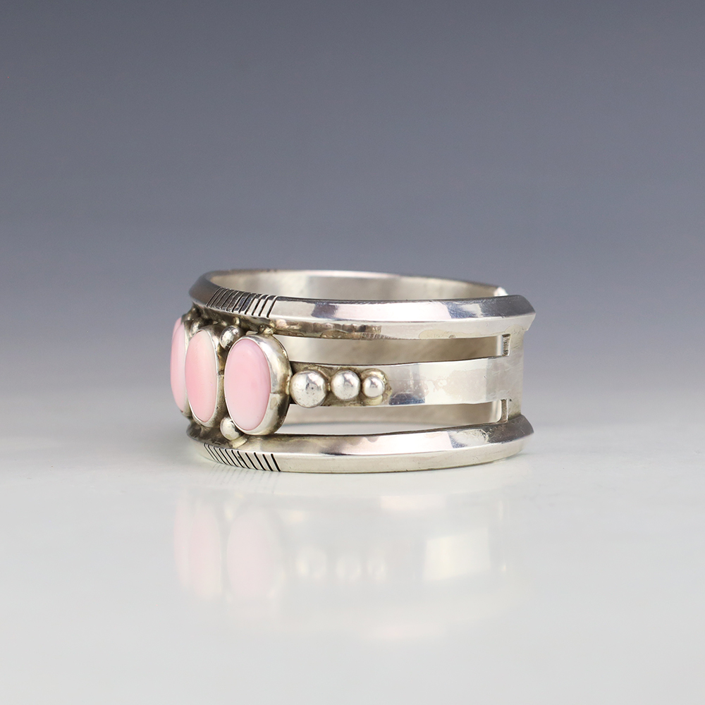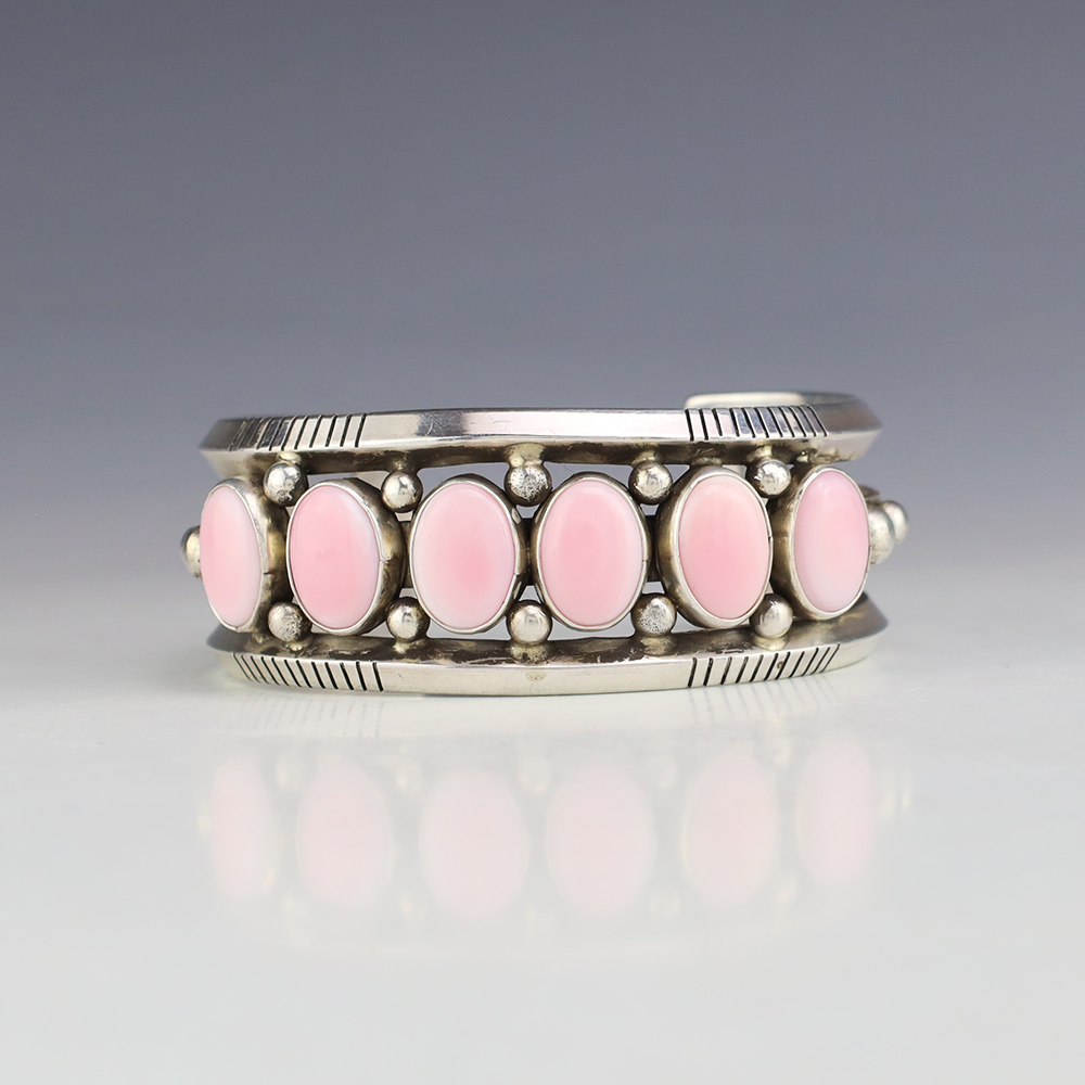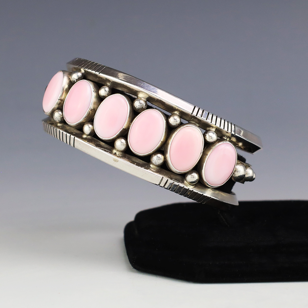 Navajo artist Joelias Draper made this gorgeous bracelet. Sterling silver with Pink Conch. Weighs 74 grams. The entire inner circumference is about 6 3/4”, including 1 1/8” opening. (Fits a 6 3/4″ wrist). Signed
