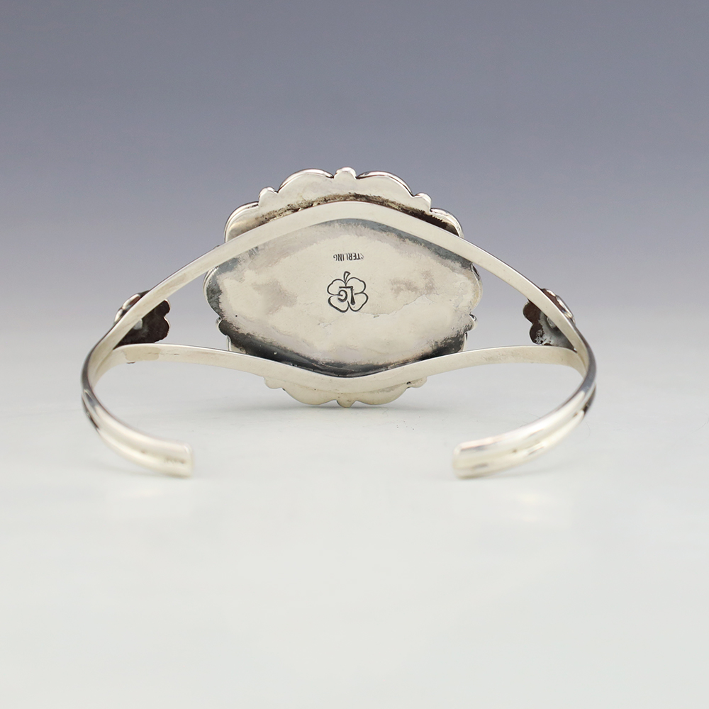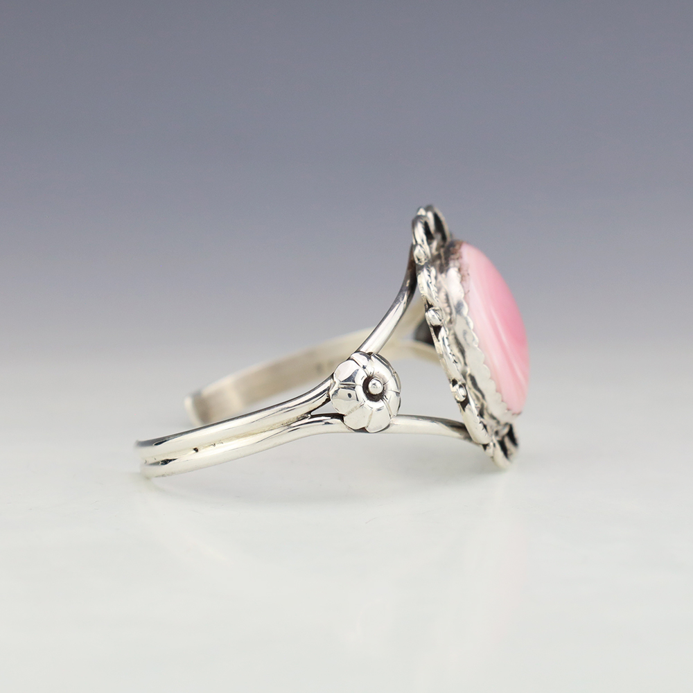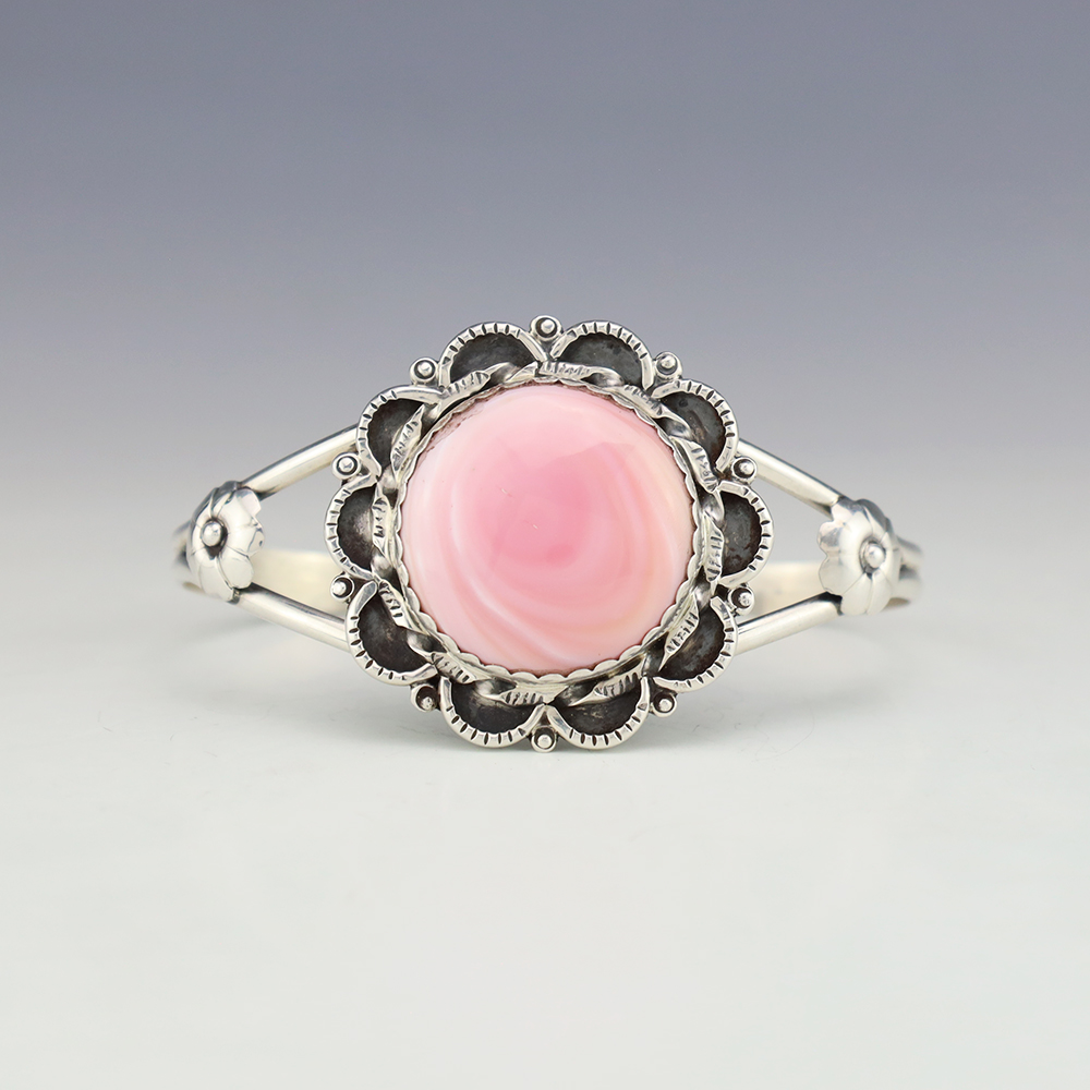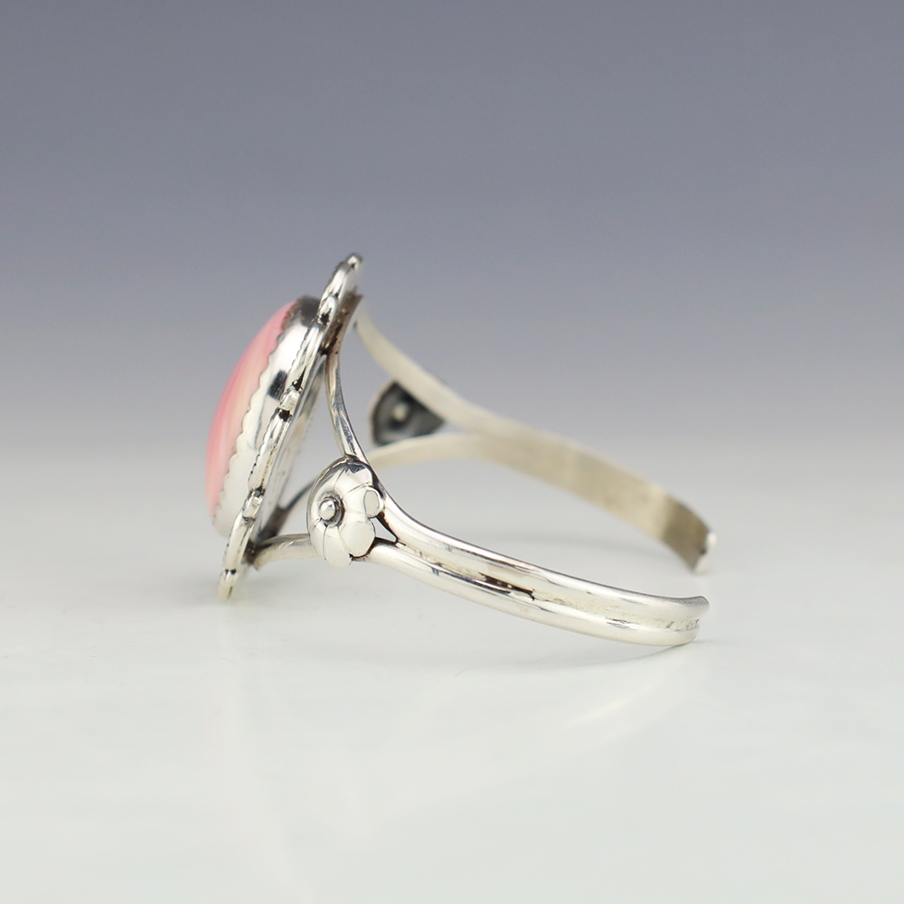 This timeless piece would be a great addition to your jewelry collection. Navajo silversmith Lyanne Goodluck created this gorgeous bracelet out of sterling silver and Pink Conch. The entire inner circumference is about 6 3/4”, including 1 1/8” opening (Fits a 6 3/4″ wrist). Weighs 26 grams. Signed.