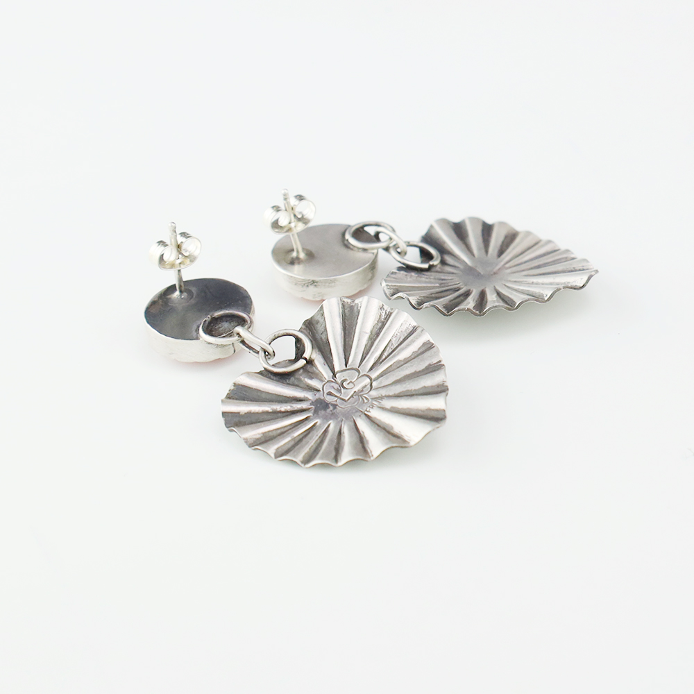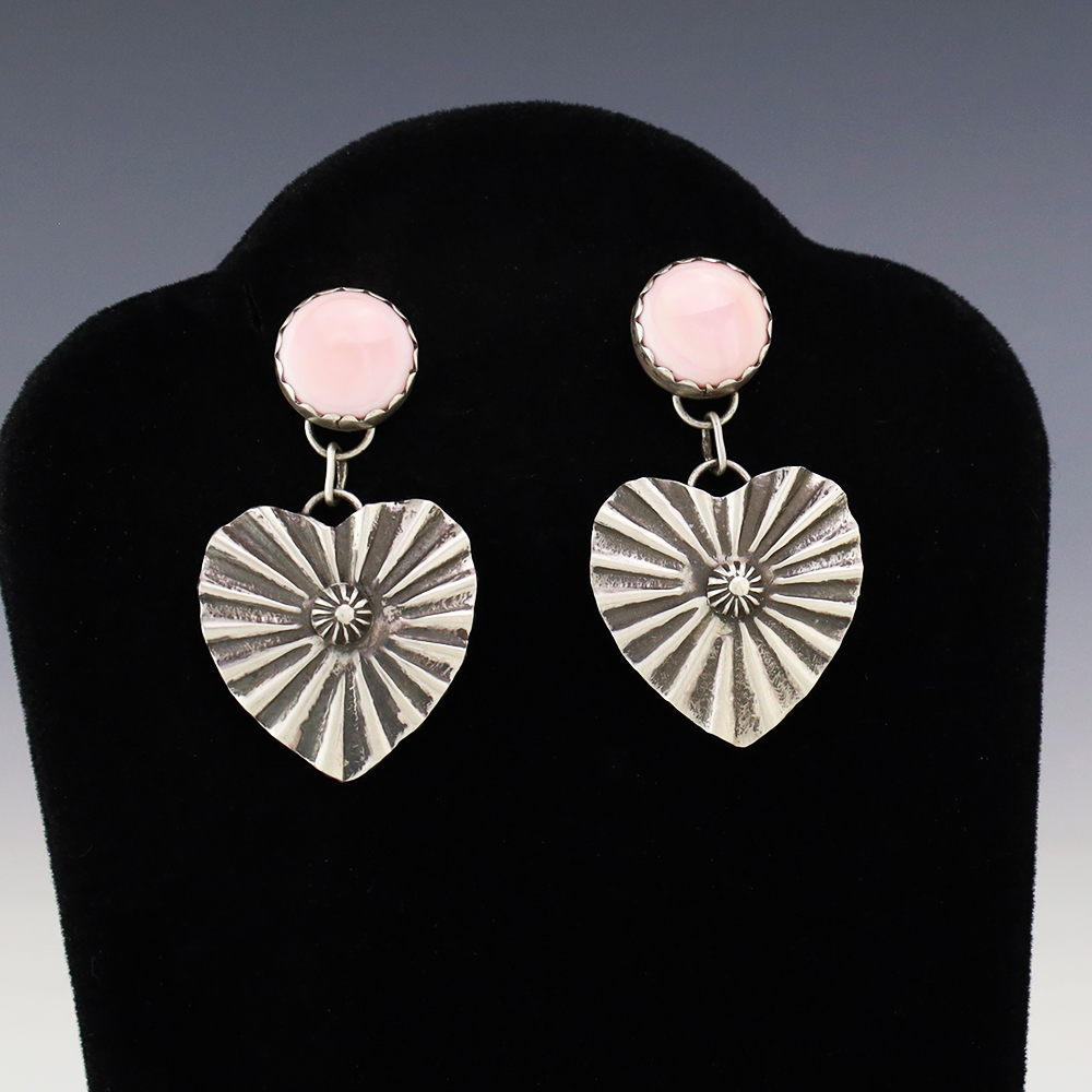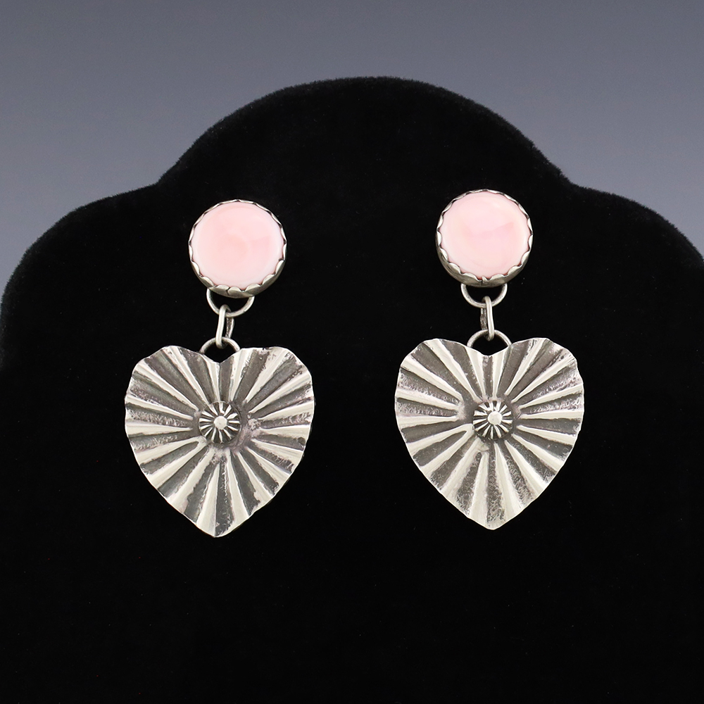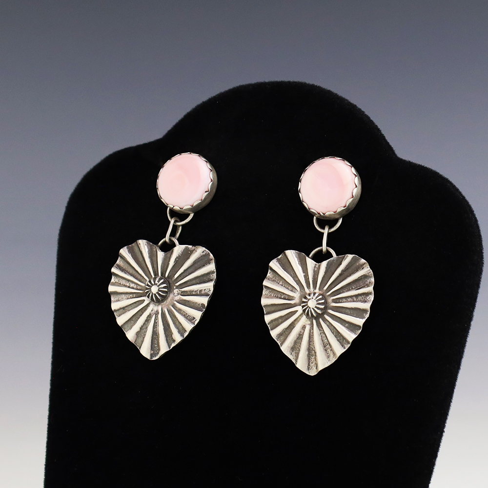 Beautiful earrings hand made out of sterling silver and Pink Conch by Navajo silversmith Lyanne Goodluck. These wonderful earrings will become a versatile accessory in your jewelry collection. Weighs 12 grams. Signed