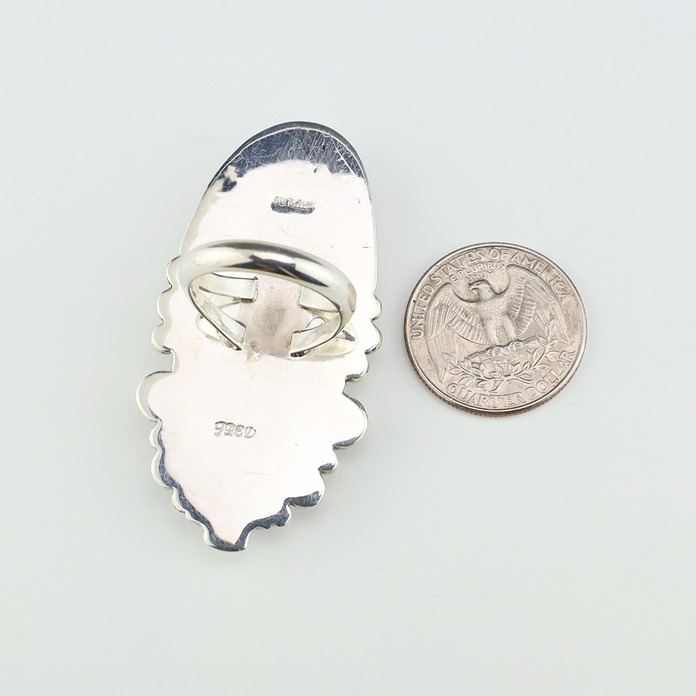 Zuni jewelry makers, Nancy and Sheldon Westika hand crafted this magnificent ring. Made out of sterling silver and inlaid with Kingman Turquoise and Jet. Zuni artists are known for their lapidary work. The Westikas have been making jewelry since the 1970’s and they are known for their fine inlay work. ...
