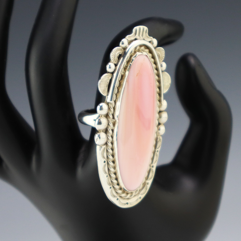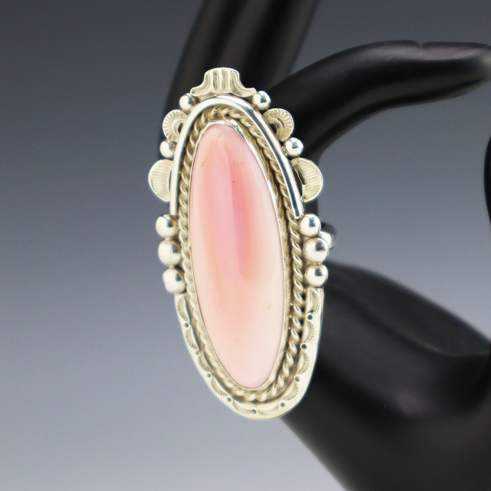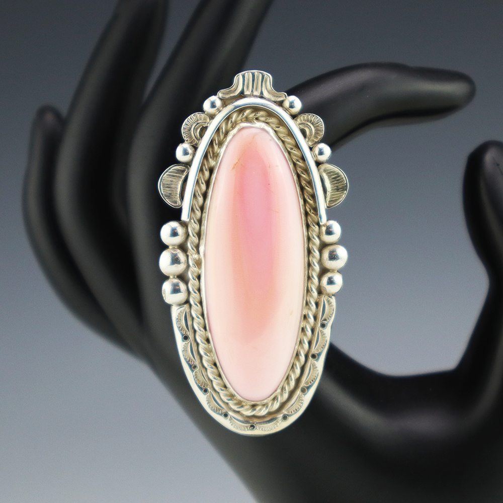 Magnificent ring made by Navajo artist Fred Francis. Sterling silver with a Pink Conch stone. It is a great representation of hand made Navajo jewelry. Size 8 1/2. Weighs 26 grams. Signed