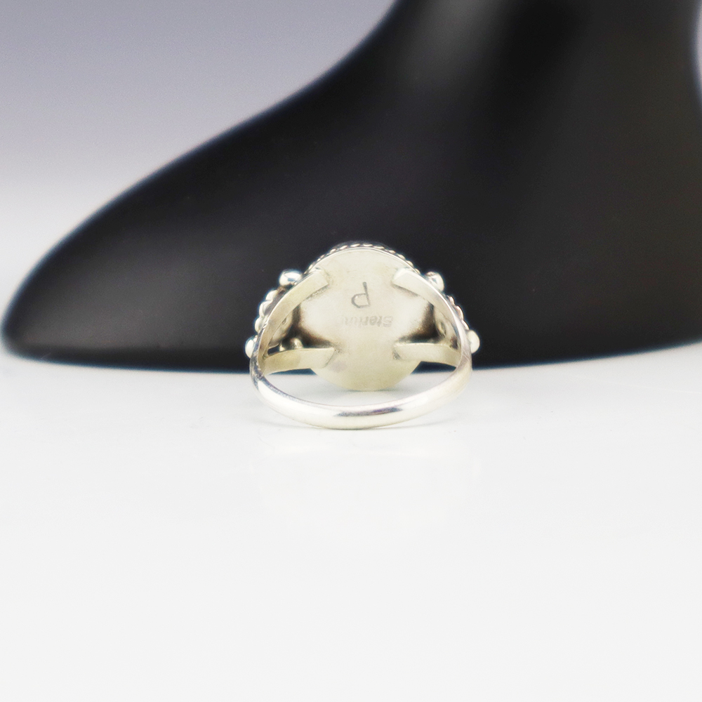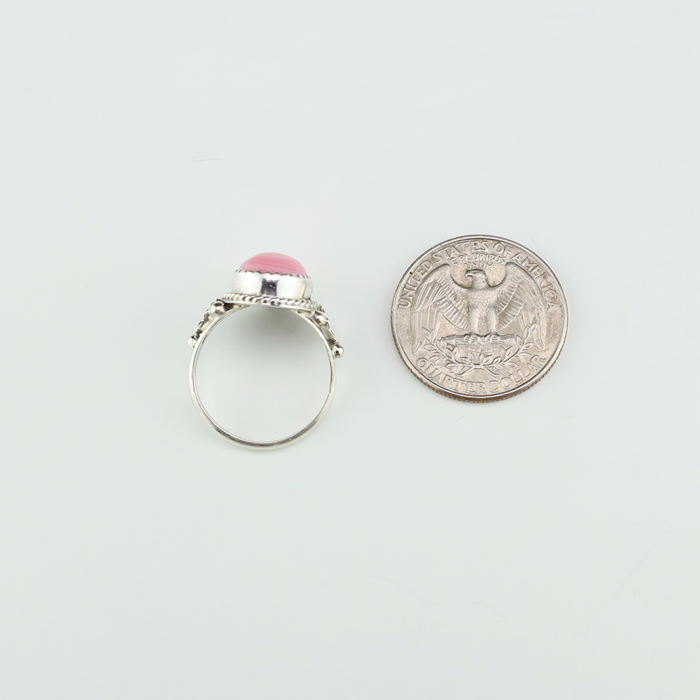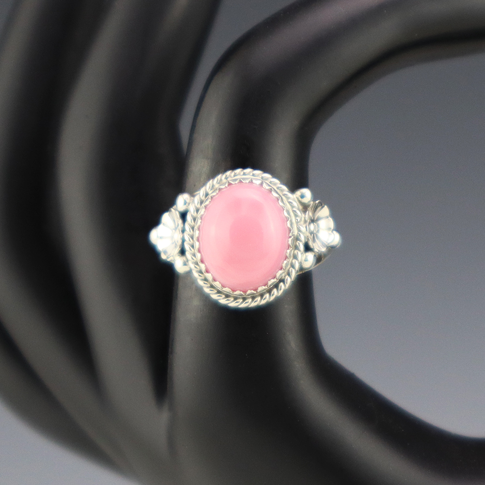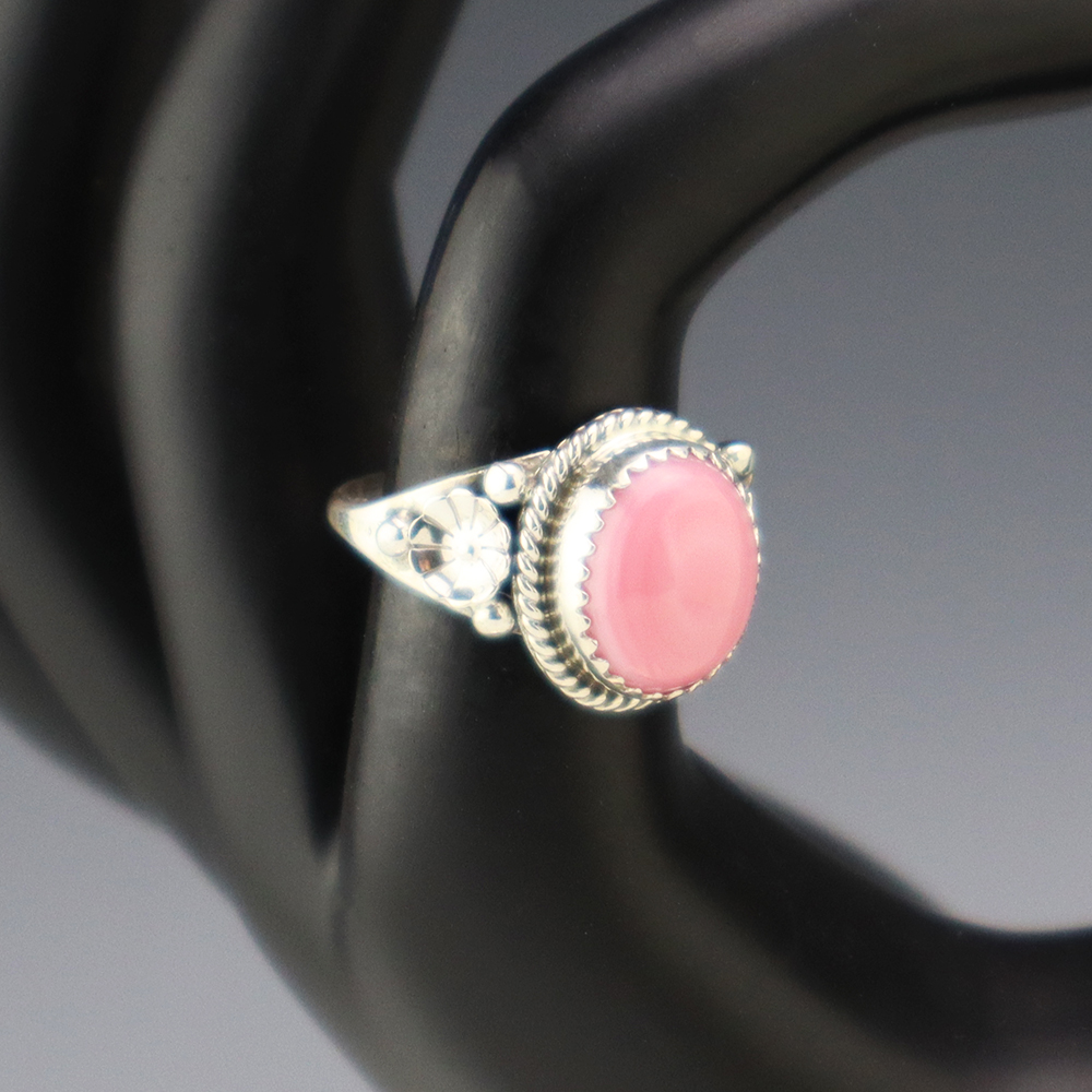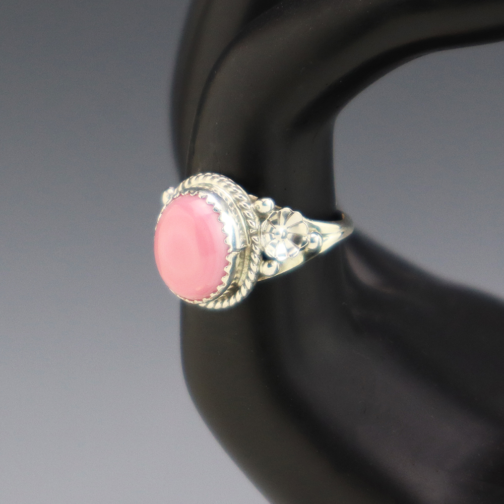 This ring is a great representation of hand made Navajo jewelry and will make a statement on your hand. Pink Conch is set into a sterling silver setting. Made by Navajo artist Priscilla Smith. Weighs 4 grams. Size 7 3/4.