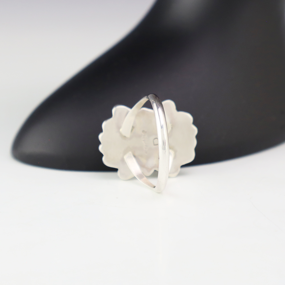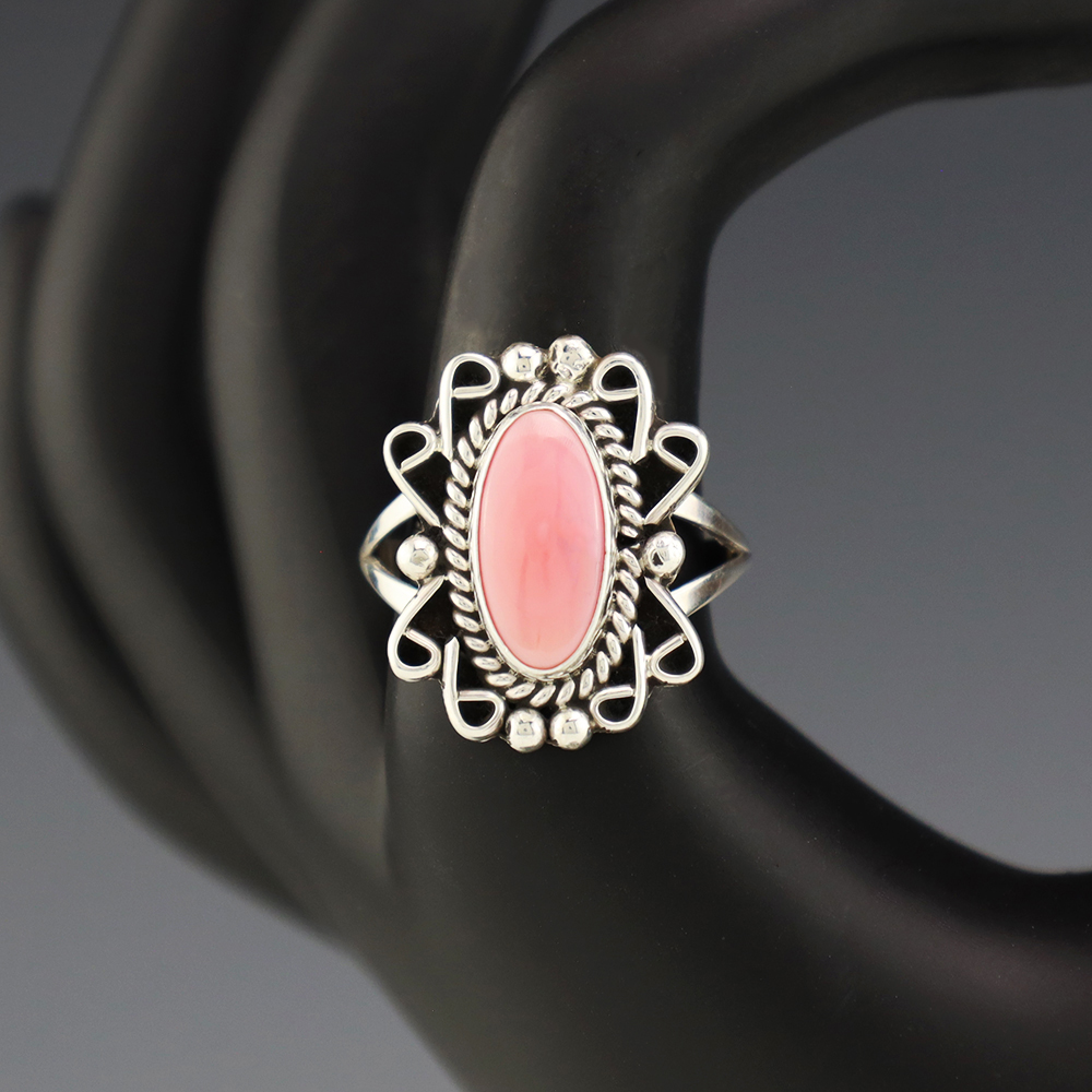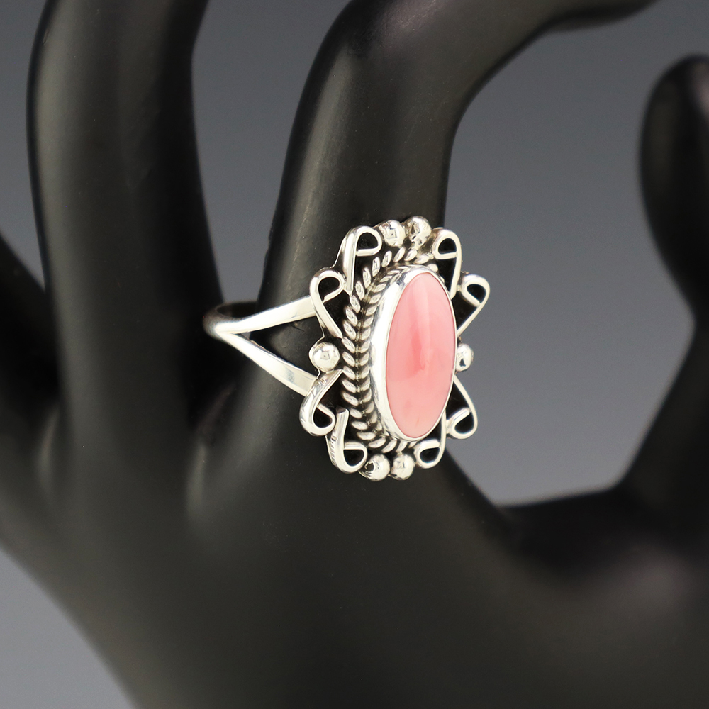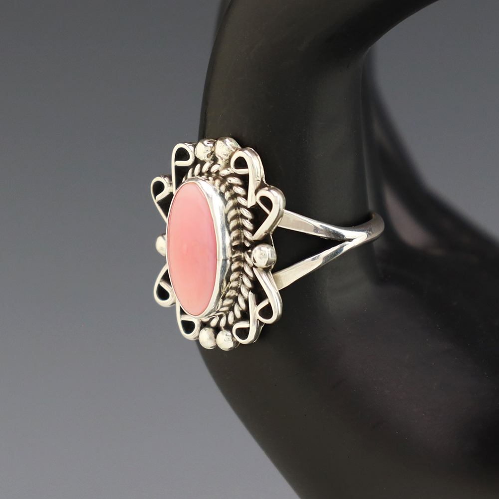 This ring is a great representation of hand made Navajo jewelry and will make a statement on your hand. Pink Conch is set into a sterling silver setting. Made by Navajo artist Priscilla Smith. Weighs 6 grams. Size 9 1/4.