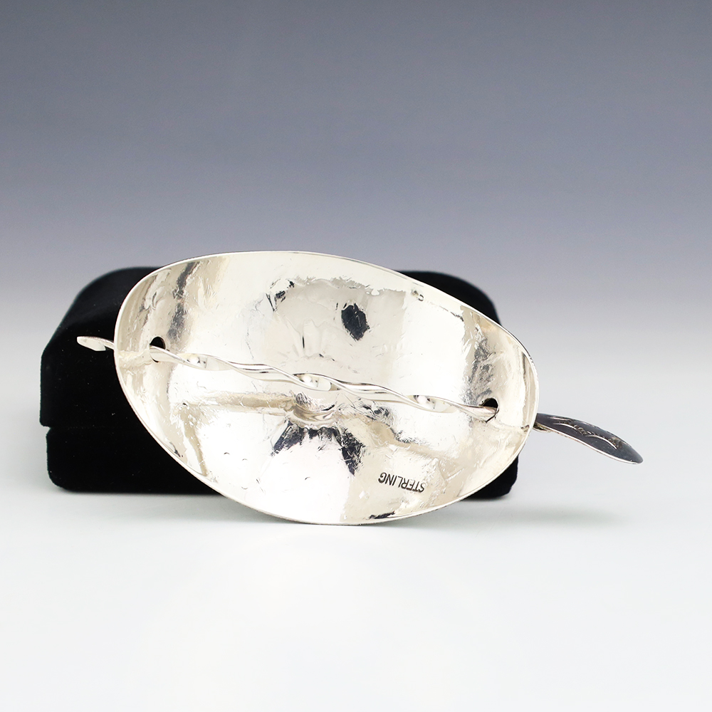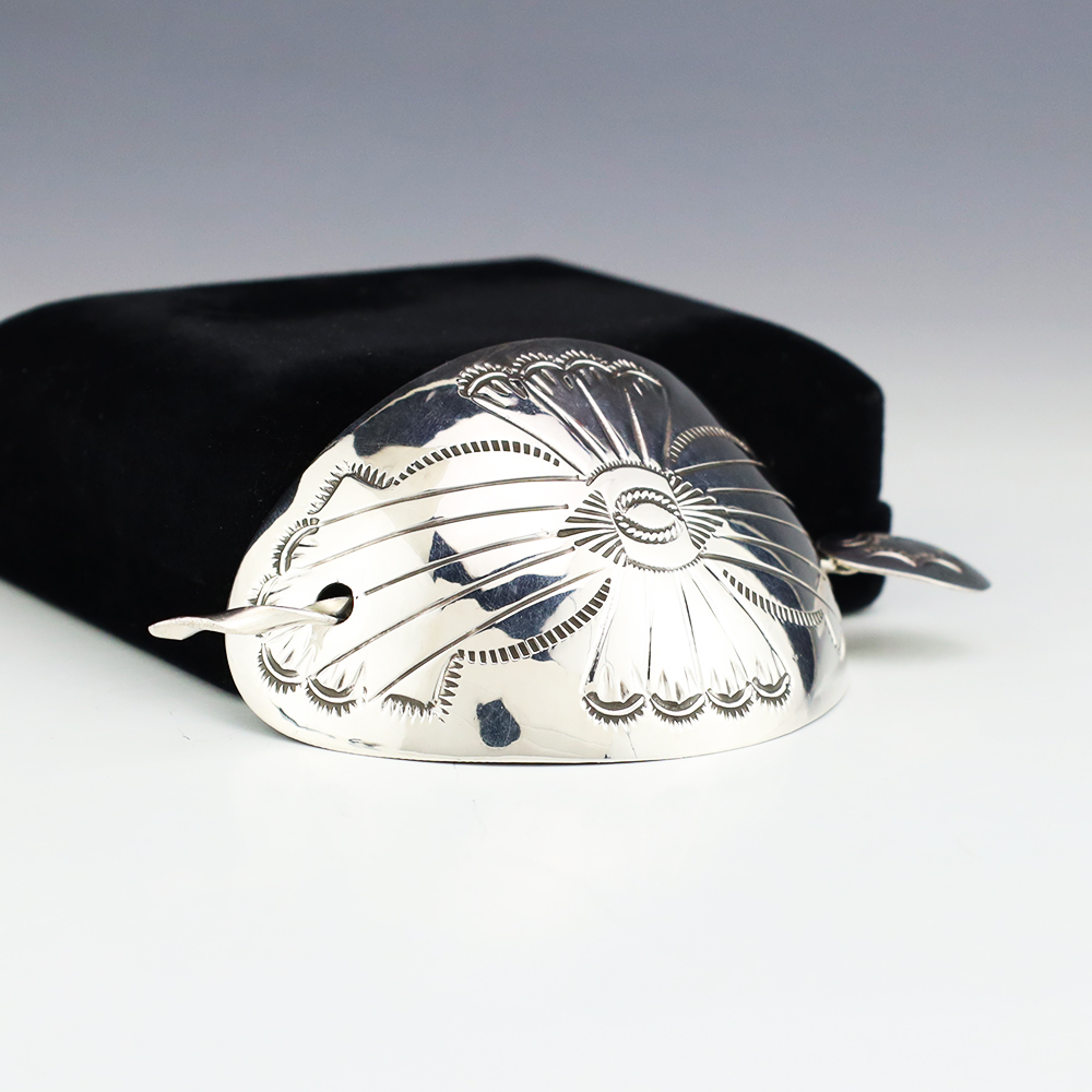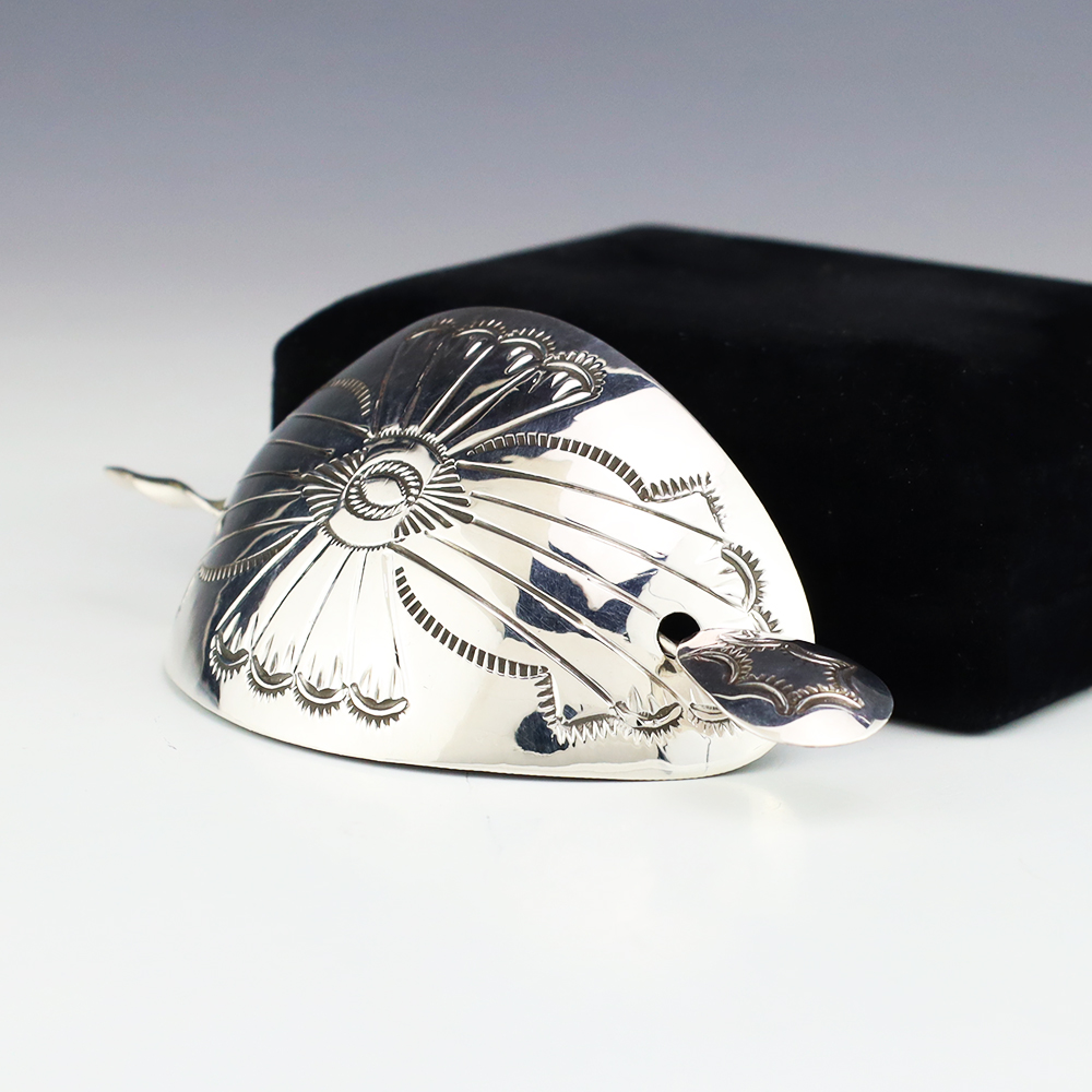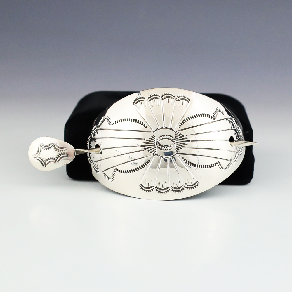 Jolene Begay created this beautiful ponytail holder out of sterling silver. Great stamp work! Navajo barrettes and ponytail holders look absolutely amazing in your hair. Weighs 16 grams.