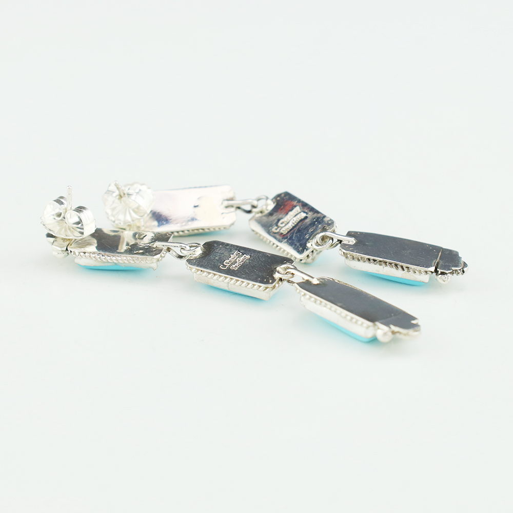 Gorgeous earrings hand made by Navajo silversmith Charmayne Charley. The earrings are sterling silver and set with Prince Turquoise stones. These fabulous earrings will become a versatile accessory in your jewelry collection. Weighs 16 grams. Signed.