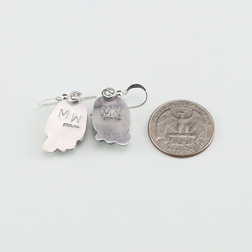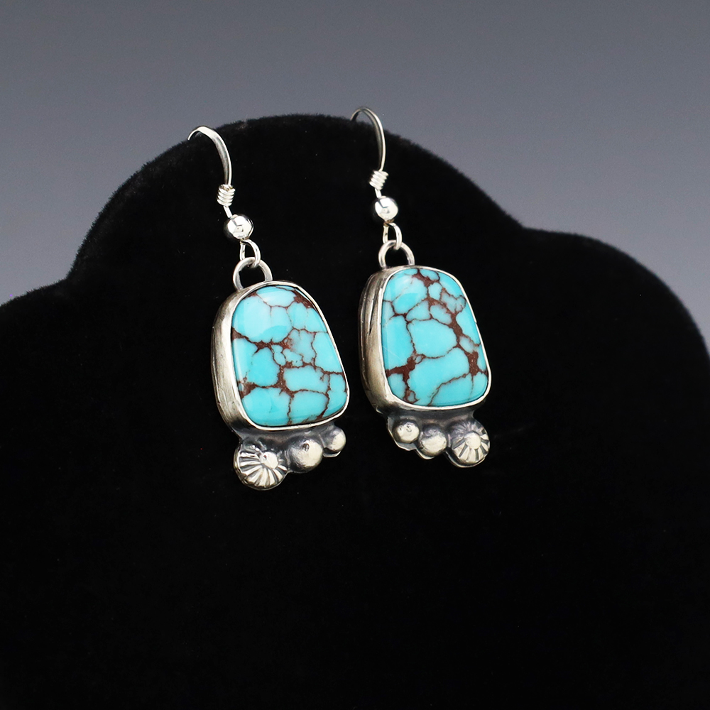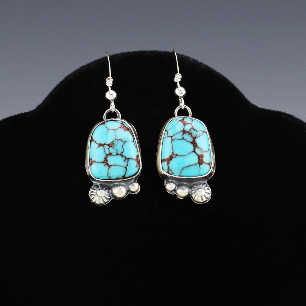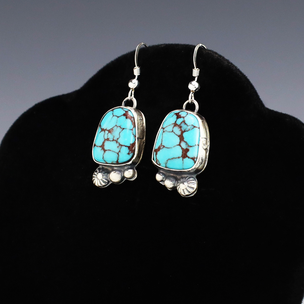 Gorgeous dangle earrings made out of sterling silver and set with PrinceTurquoise stones. Hand made by Navajo artist Miranda Willie. These fabulous earrings will become a versatile accessory in your jewelry collection. Weighs 8 grams. Signed.