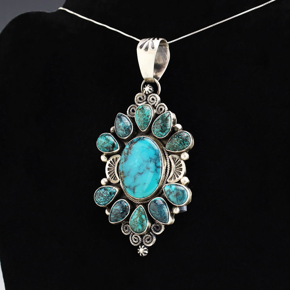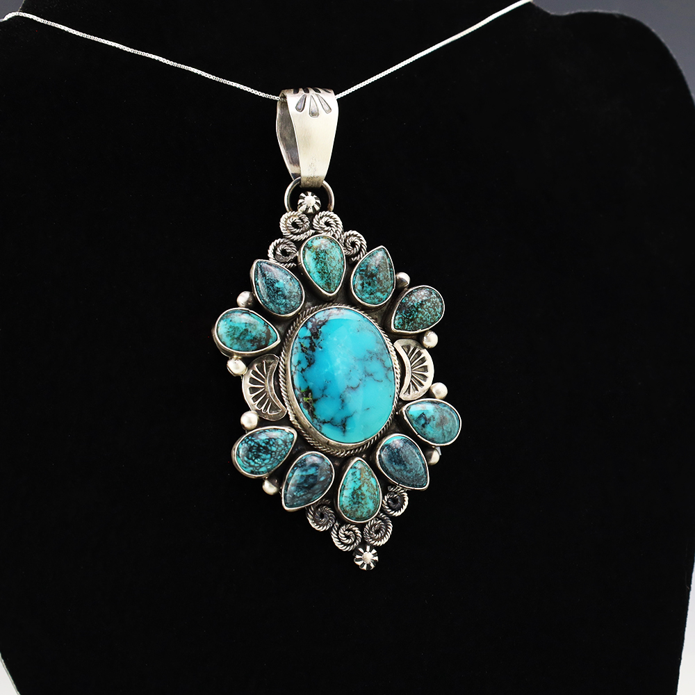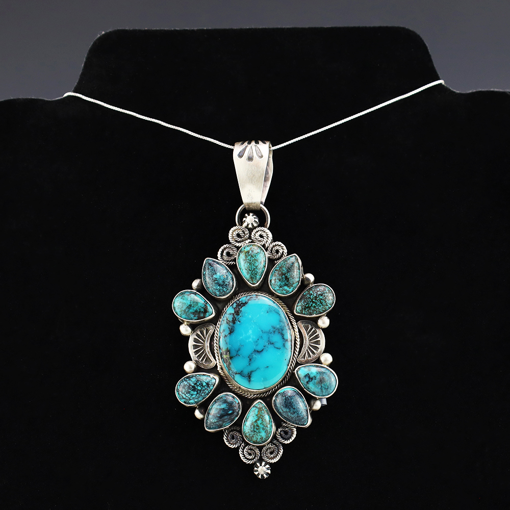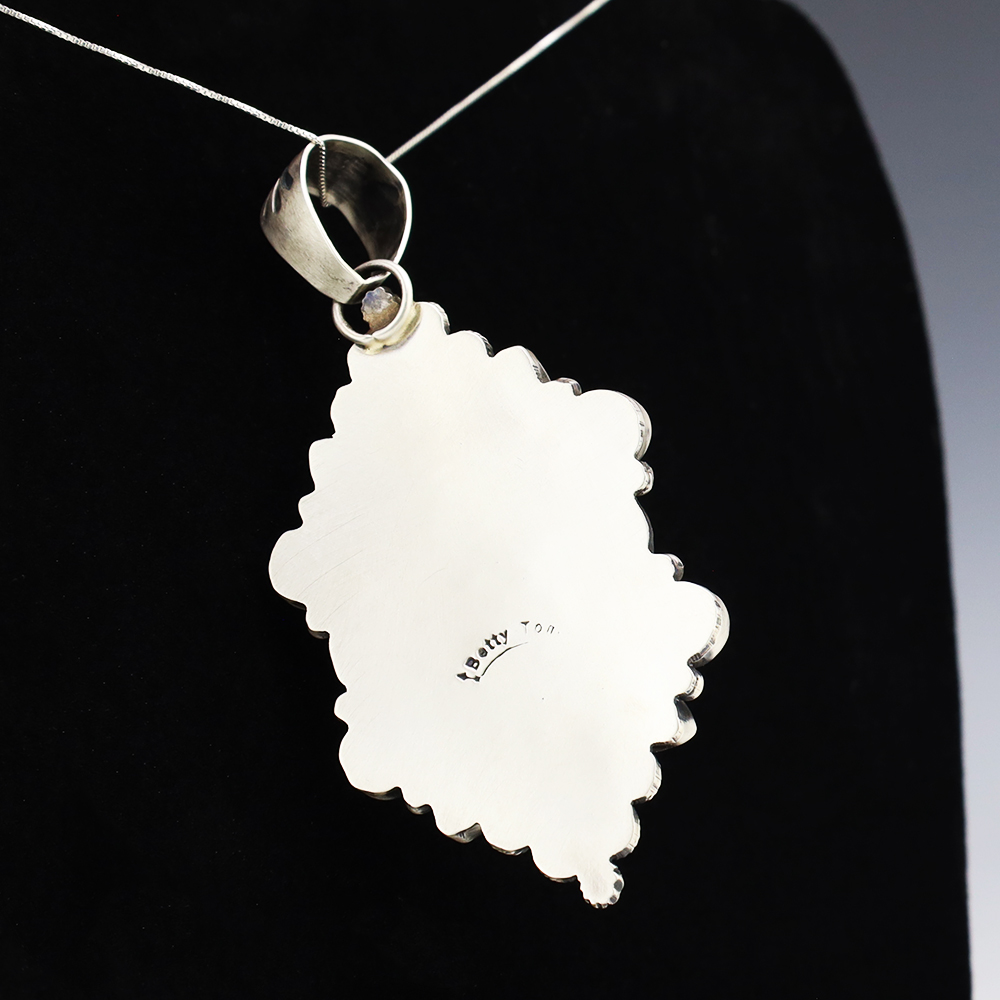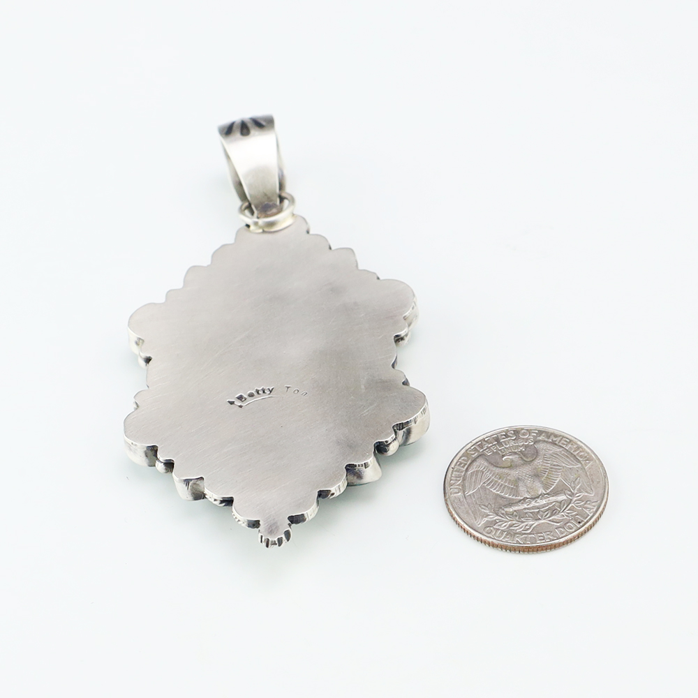 Stunning pendant hand made out of sterling silver and Prince Turquoise by Navajo artist Betty Tom. A timeless beauty that you will enjoy for years to come. Weighs 36 grams. Signed (Chain not included)