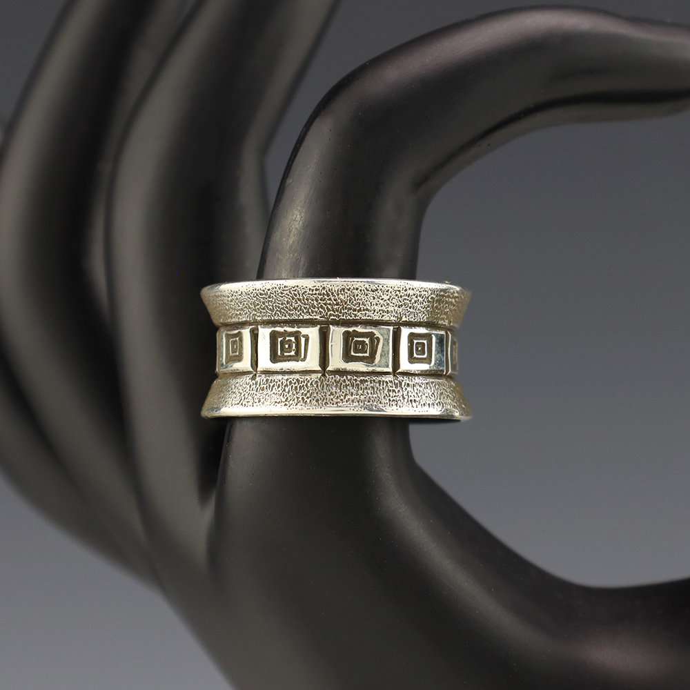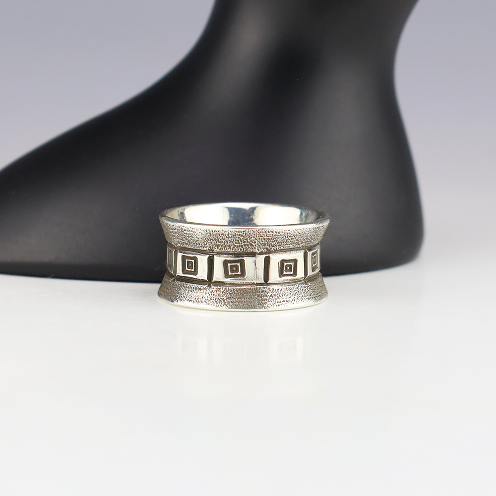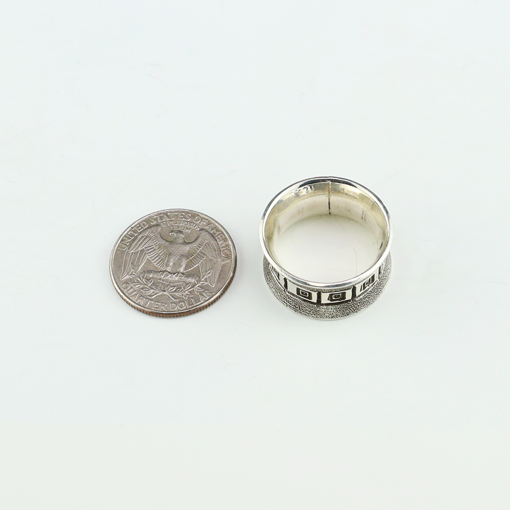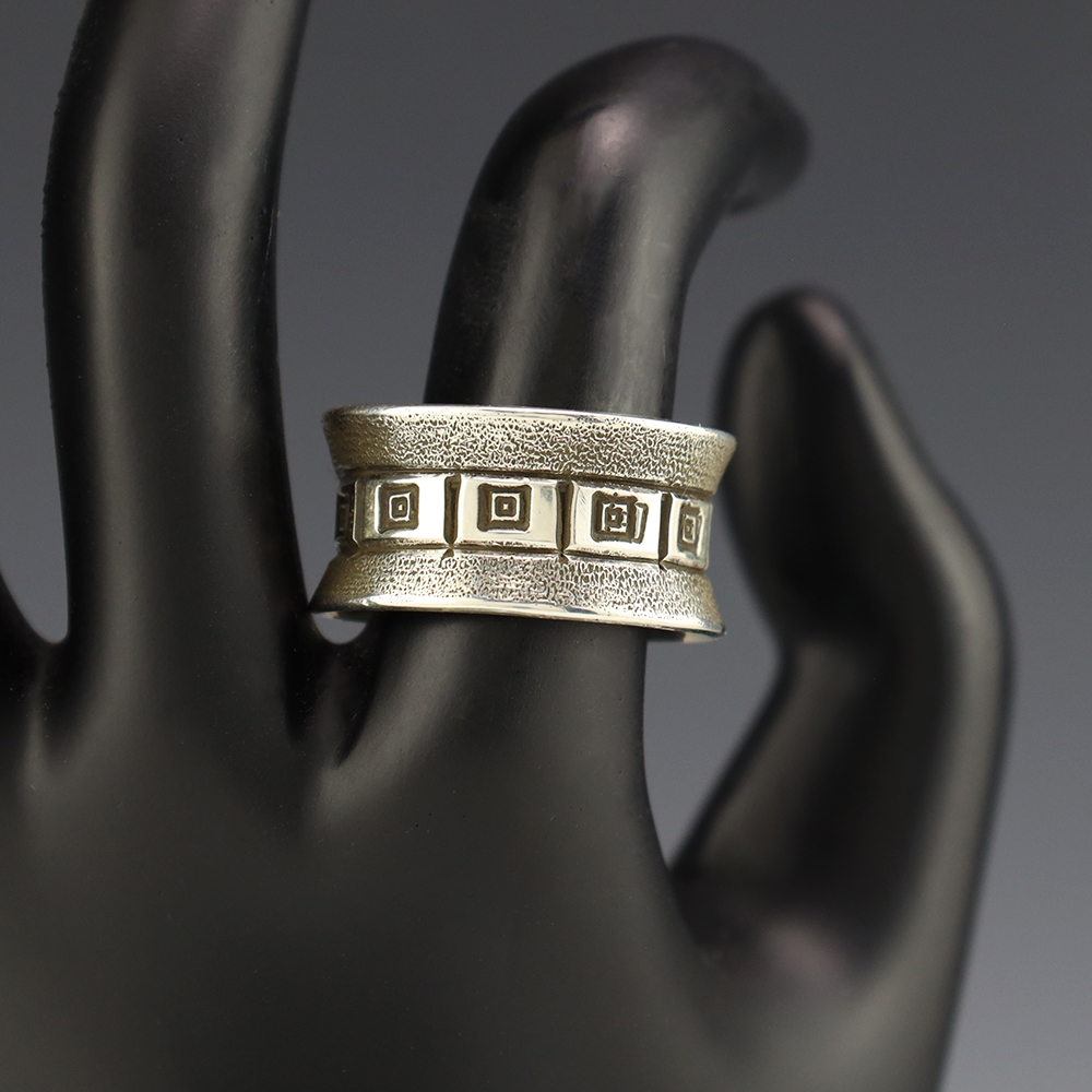 Navajo silversmith Landon Secatero hand crafted this outstanding ring out of sterling silver. Great hand stamped design. Size 9 1/4. Weighs 10 grams. Signed