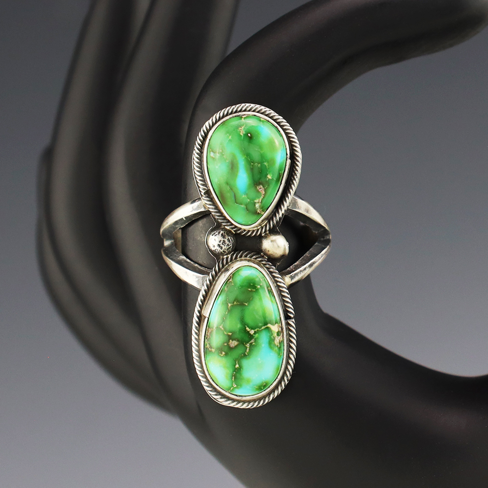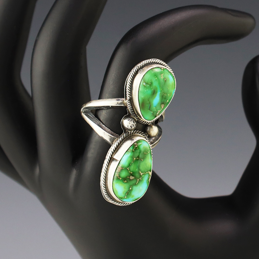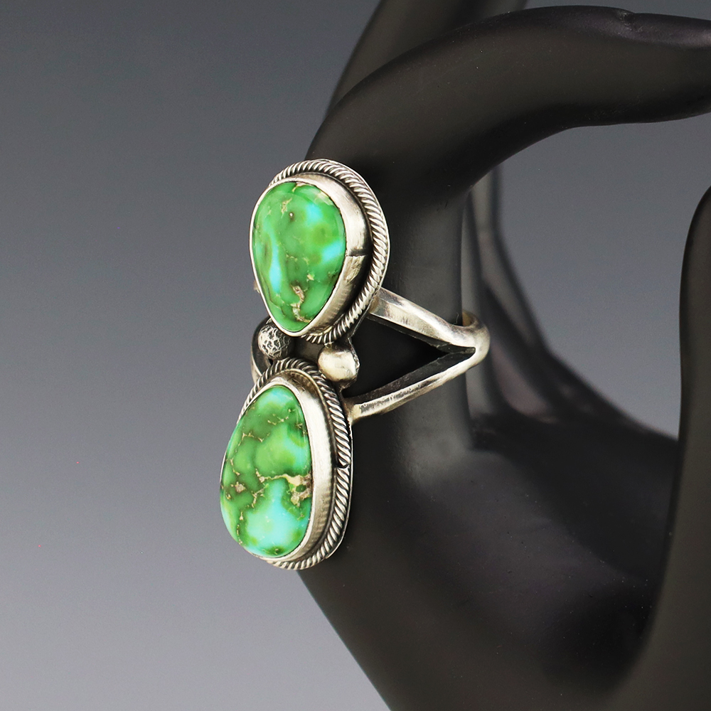 This beautiful ring was hand made out of sterling silver with Sonoran Gold Turquoise stones. It is a great representation of hand made Navajo jewelry. Size 8 1/2. Weighs 12 grams. Signed