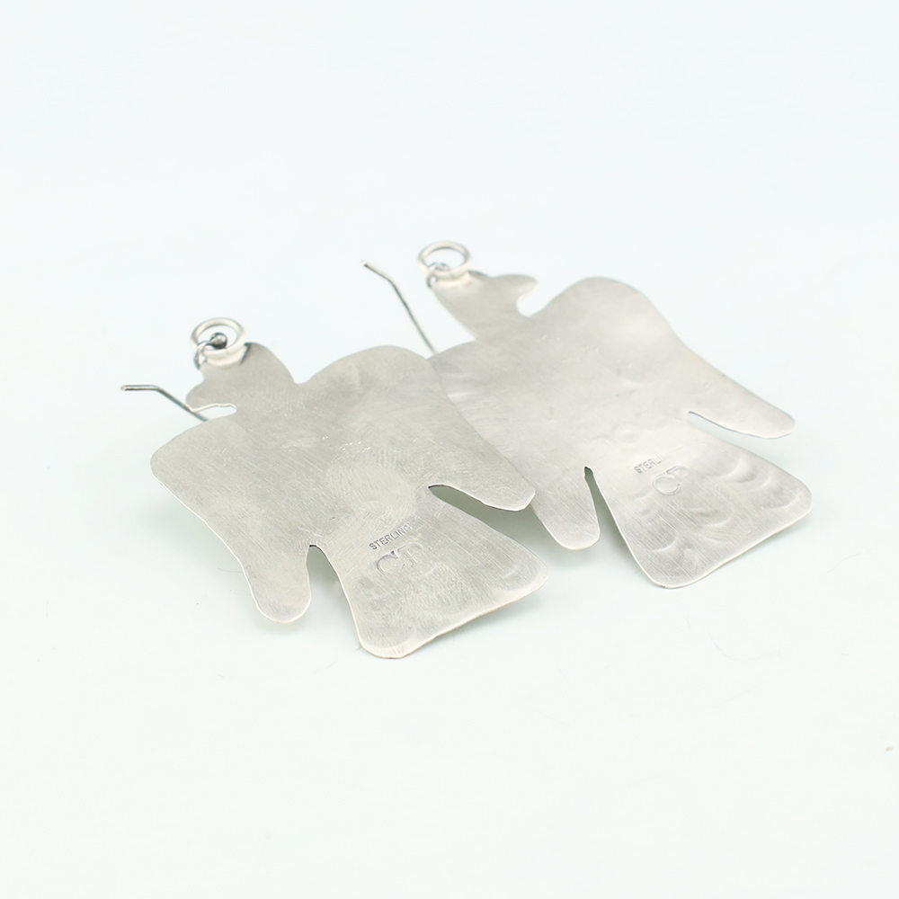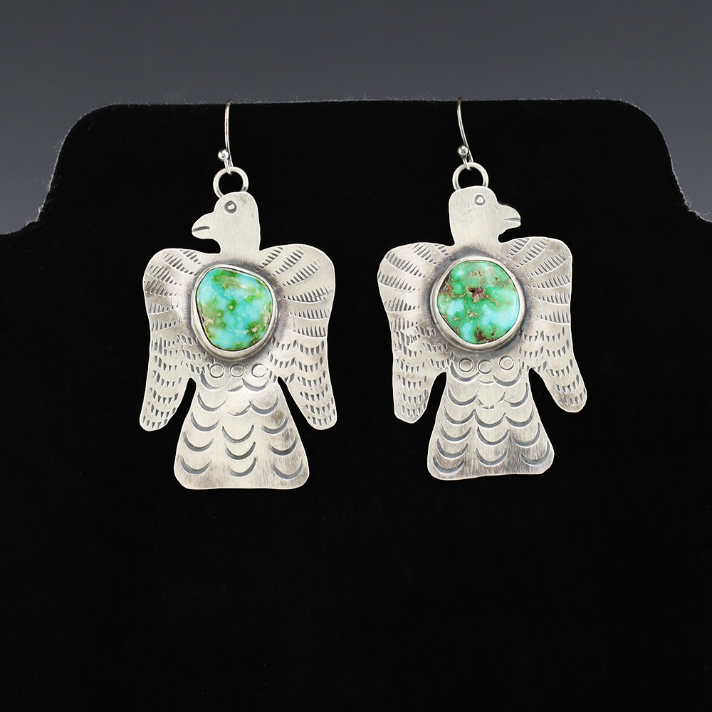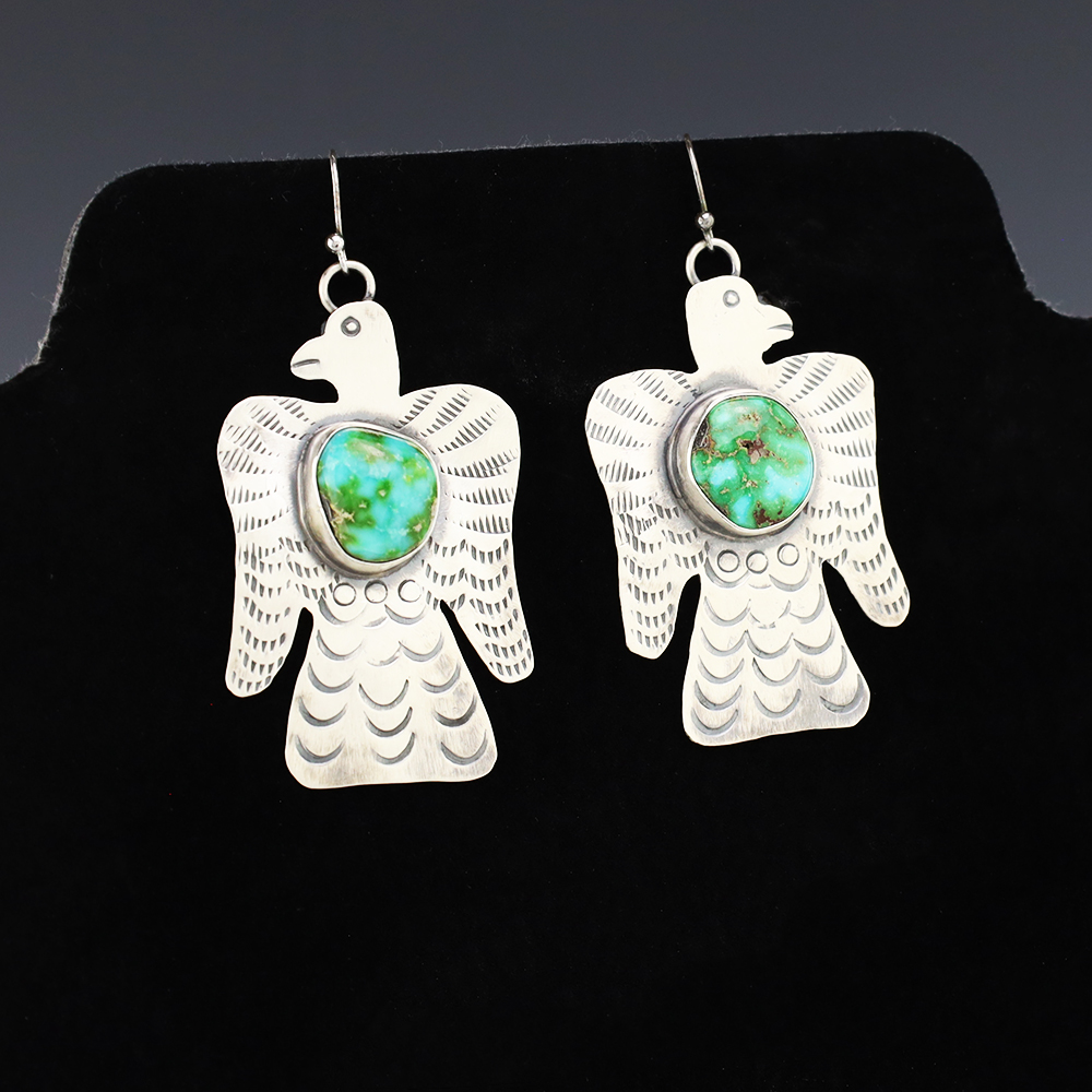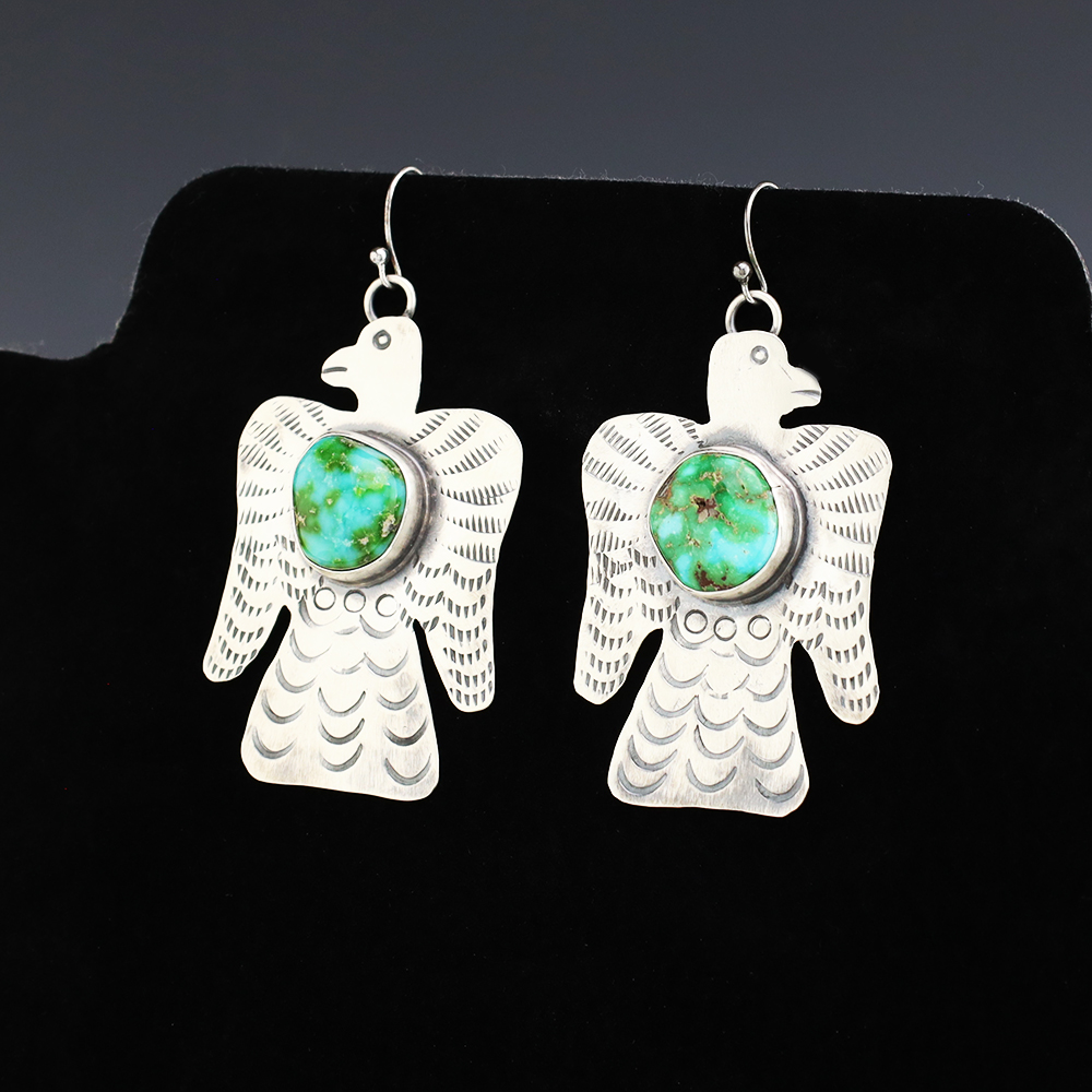 Beautiful Thunderbird earrings hand made out of sterling silver and Sonoran Gold Turquoise. These wonderful earrings will become a versatile accessory in your jewelry collection. Weighs 16 grams. Signed