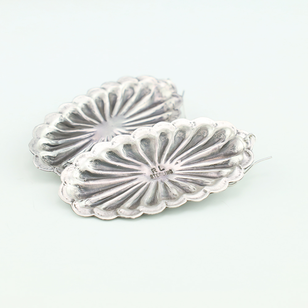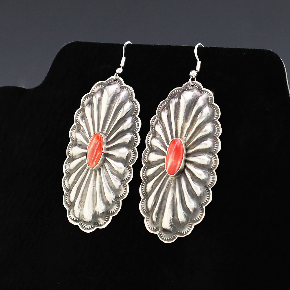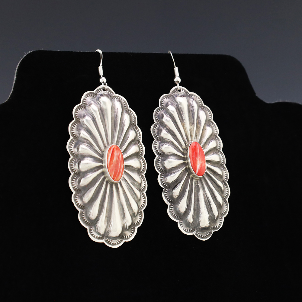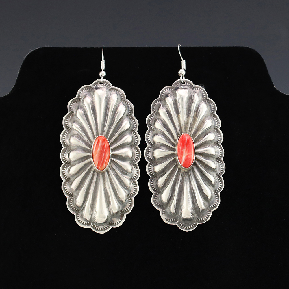 Beautiful earrings hand made out of sterling silver and Spiny Oyster by Navajo artist Rita Lee. Great repousee design! These fabulous earrings will become a versatile accessory in your jewelry collection. Weighs 16 grams.
