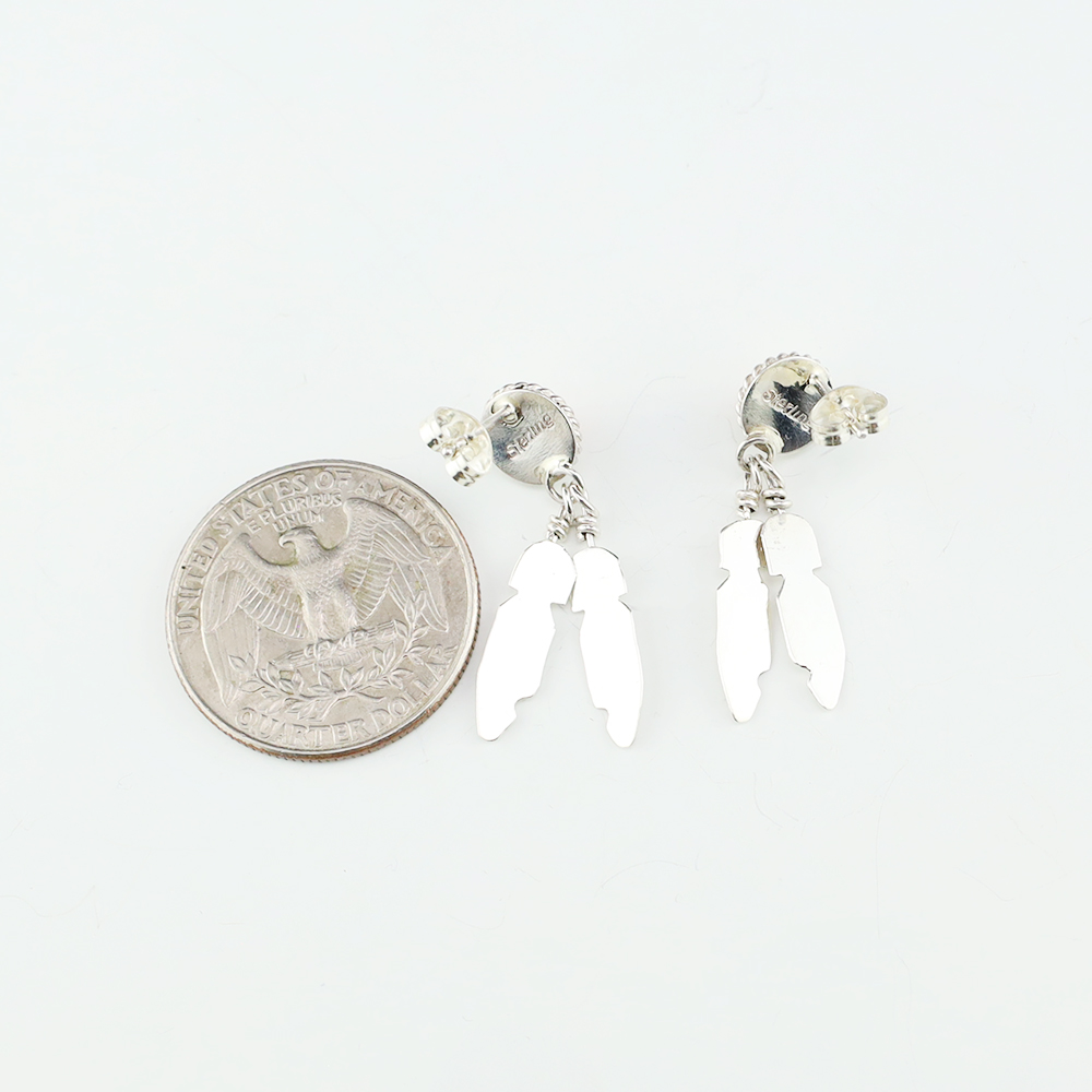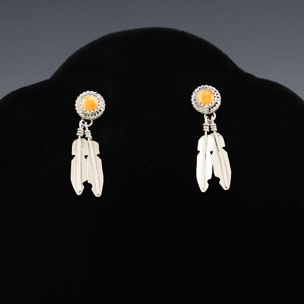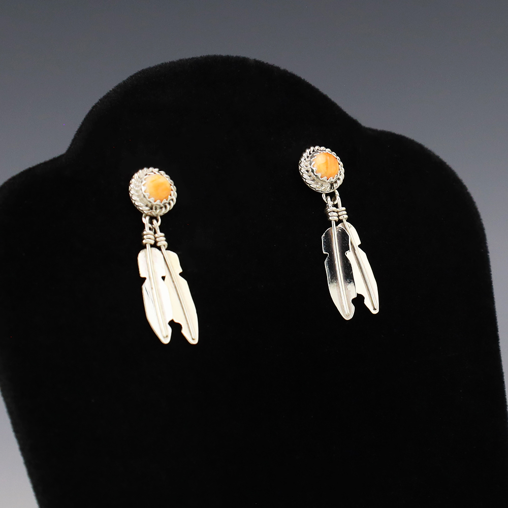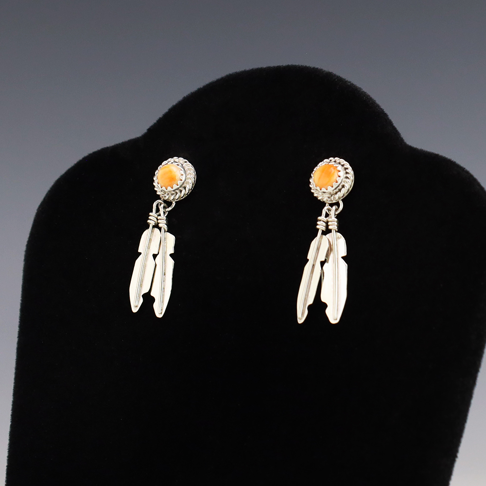 Fabulous feather earrings hand made out of sterling silver and Spiny Oyster by Navajo silversmith Theresa Kinsel. These wonderful earrings will become a versatile accessory in your jewelry collection. Weighs 2 grams.