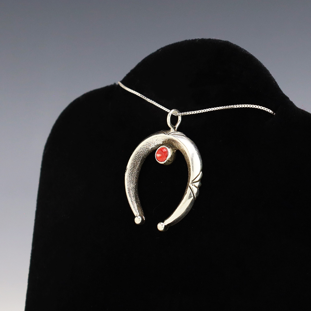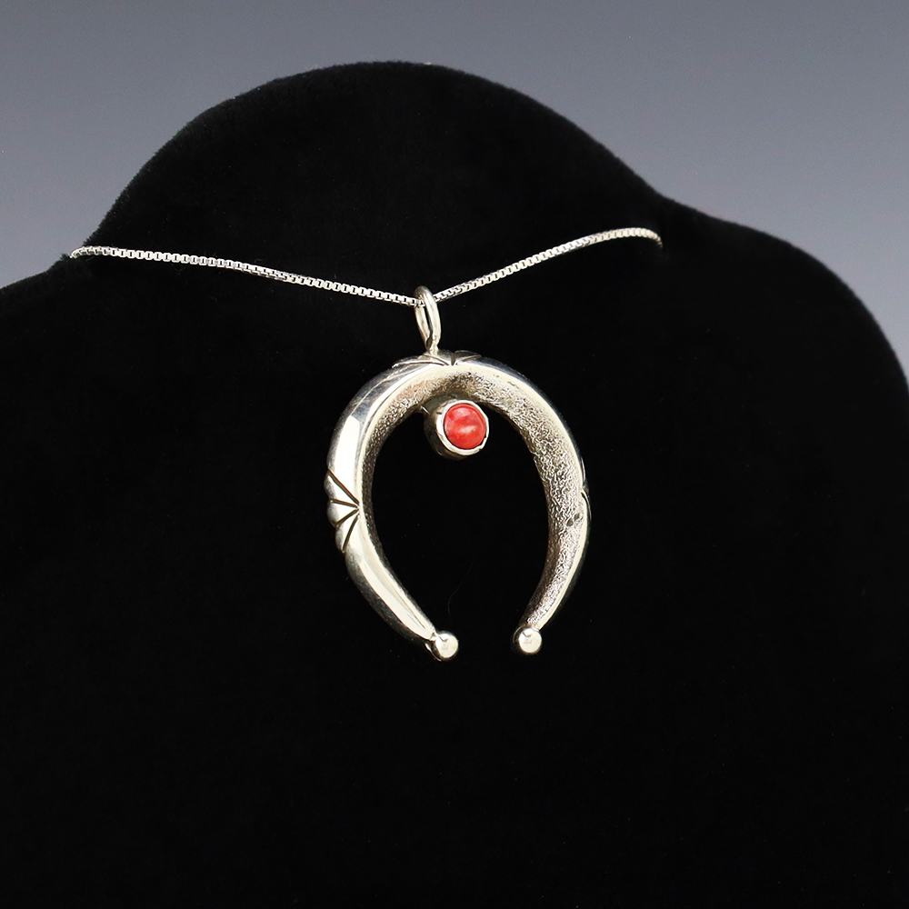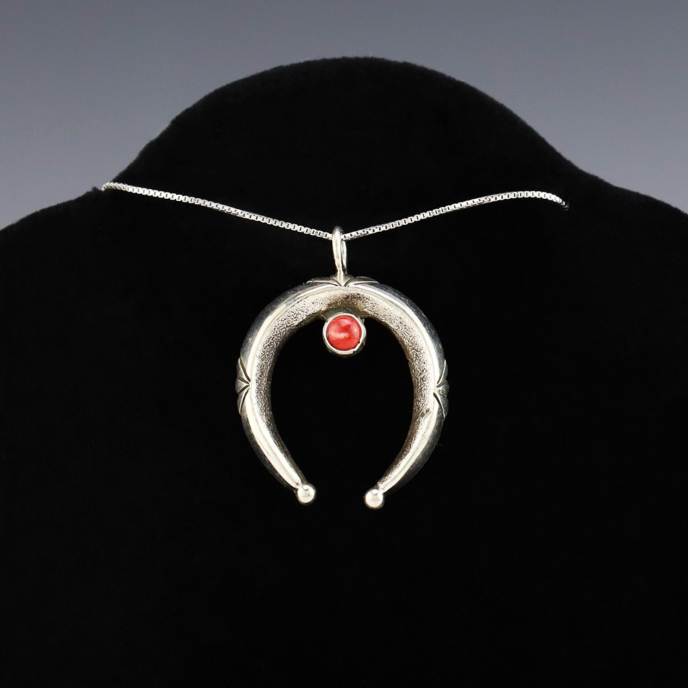 Wonderful sterling silver and Spiny Oyster naja pendant by Navajo artist Lee Charley. A timeless beauty that you will enjoy for years to come. Weighs 6 grams. Signed (Chain not included)