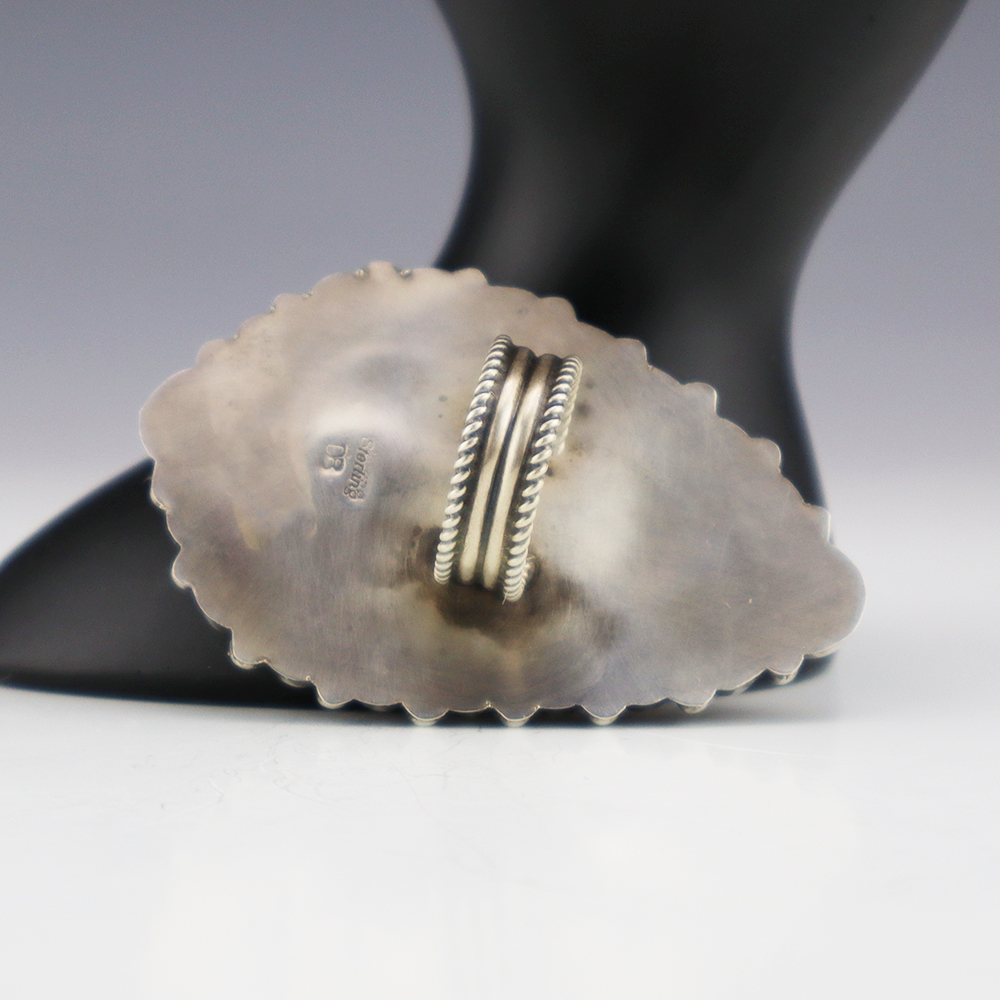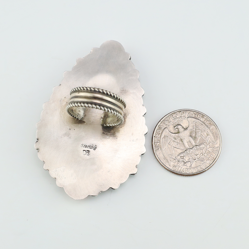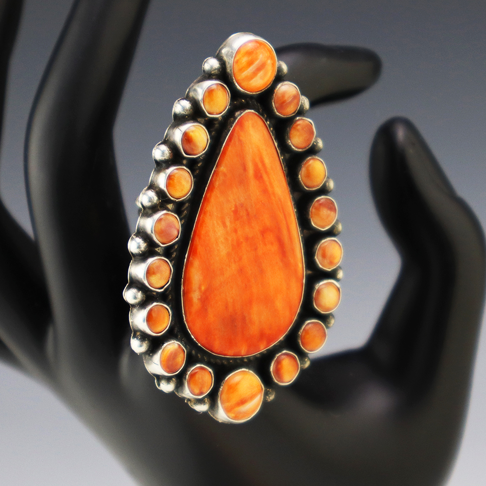This ring is a great representation of hand made Navajo jewelry and will make a statement on your hand. Beautiful pieces of Spiny Oyster are set into a sterling silver setting. Hand made by Navajo artist Devin Brown. Weighs 22 grams. Size 7 1/2 and slightly adjustable. Signed