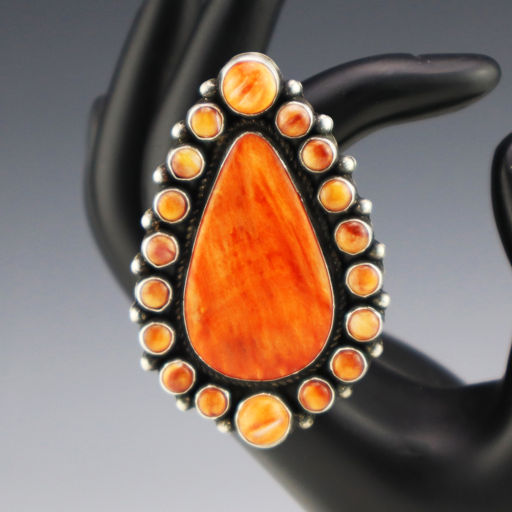 This ring is a great representation of hand made Navajo jewelry and will make a statement on your hand. Beautiful pieces of Spiny Oyster are set into a sterling silver setting. Hand made by Navajo artist Devin Brown. Weighs 22 grams. Size 7 1/2 and slightly adjustable. Signed