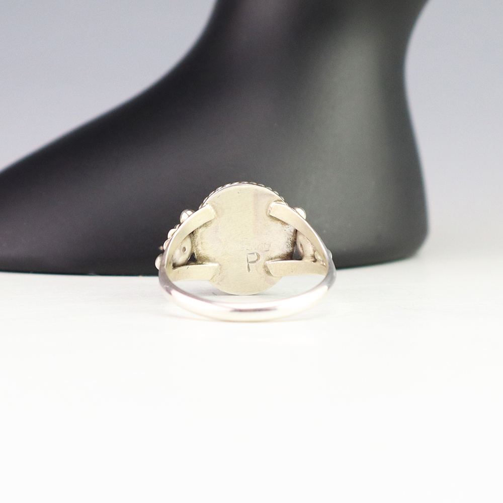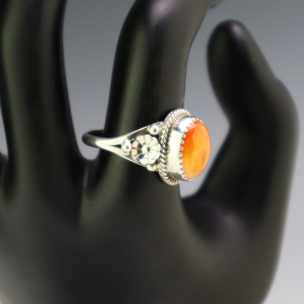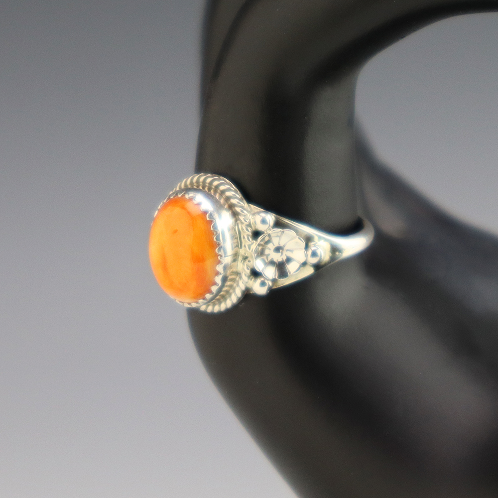 This ring is a great representation of hand made Navajo jewelry and will make a statement on your hand. Spiny Oyster is set into a sterling silver setting. Made by Navajo artist Priscilla Smith. Weighs 4 grams. Size 9.