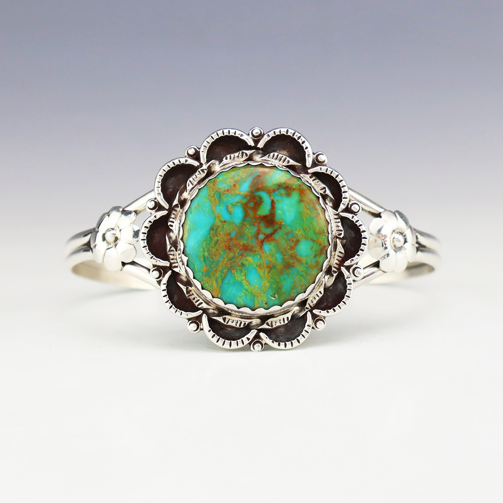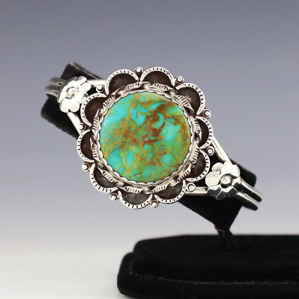 The Navajos began working with silver in the 19th century, and began making things like buckles, bridles, buttons, rings, canteens, hollow beads, earrings, crescent-shaped pendants (called “najas”), bracelets, crosses, powder chargers, tobacco canteens, and conchos (for belts). Their silversmithing skills has evolved and changed throughout the years, and in about 1880 Navajo silversmiths started to set turquoise in their silver work. Traditionally, Navajo artists worked with jewelry techniques like repousee and stamp work, but today they explored in other Native American jewelry making techniques like Zuni inlay work and Hopi overlay work