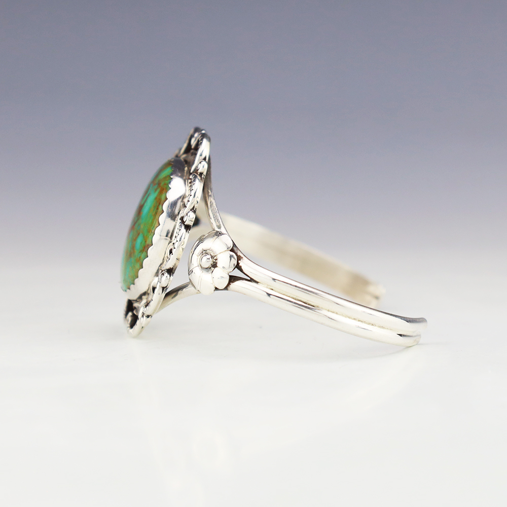 This timeless piece would be a great addition to your jewelry collection. Navajo silversmith Lyanne Goodluck created this gorgeous bracelet out of sterling silver and Turquoise. The entire inner circumference is about 6 1/2”, including 1 1/16” opening (Fits a 6 1/2″ wrist). Weighs 22 grams. Signed.