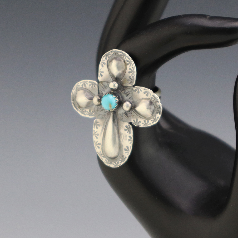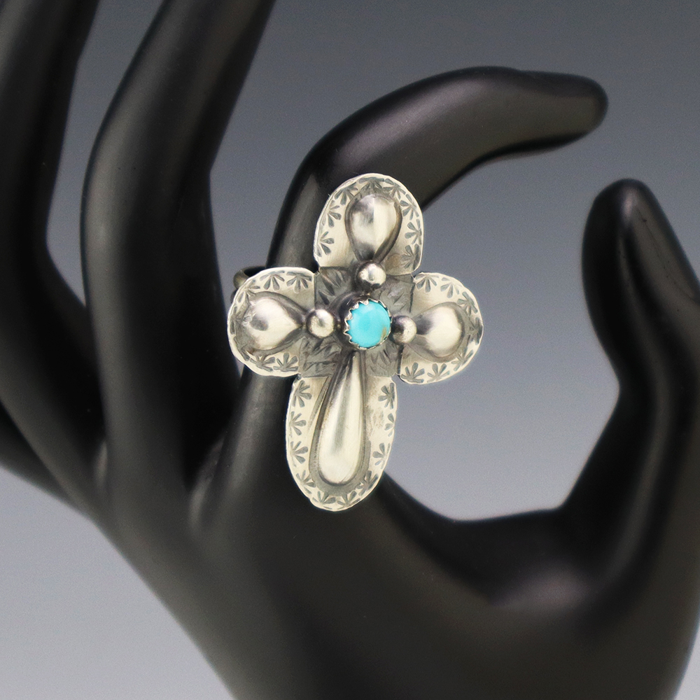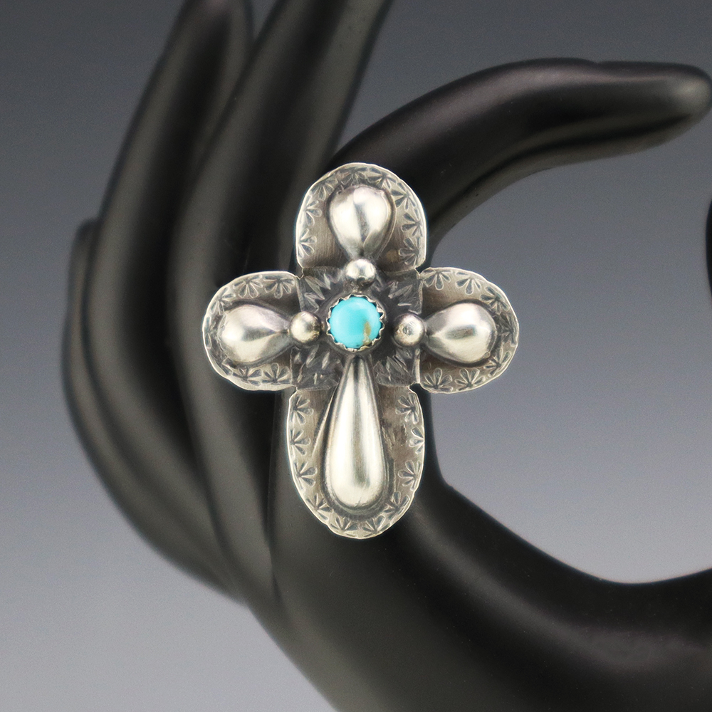 The Navajos began working with silver in the 19th century, and began making things like buckles, bridles, buttons, rings, canteens, hollow beads, earrings, crescent-shaped pendants (called “najas”), bracelets, crosses, powder chargers, tobacco canteens, and conchos (for belts). Their silversmithing skills has evolved and changed throughout the years, and in about 1880 Navajo silversmiths started to set turquoise in their silver work. Traditionally, Navajo artists worked with jewelry techniques like repousee and stamp work, but today they explored in other Native American jewelry making techniques like Zuni inlay work and Hopi overlay work.