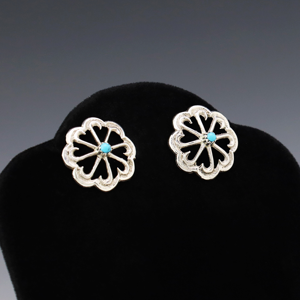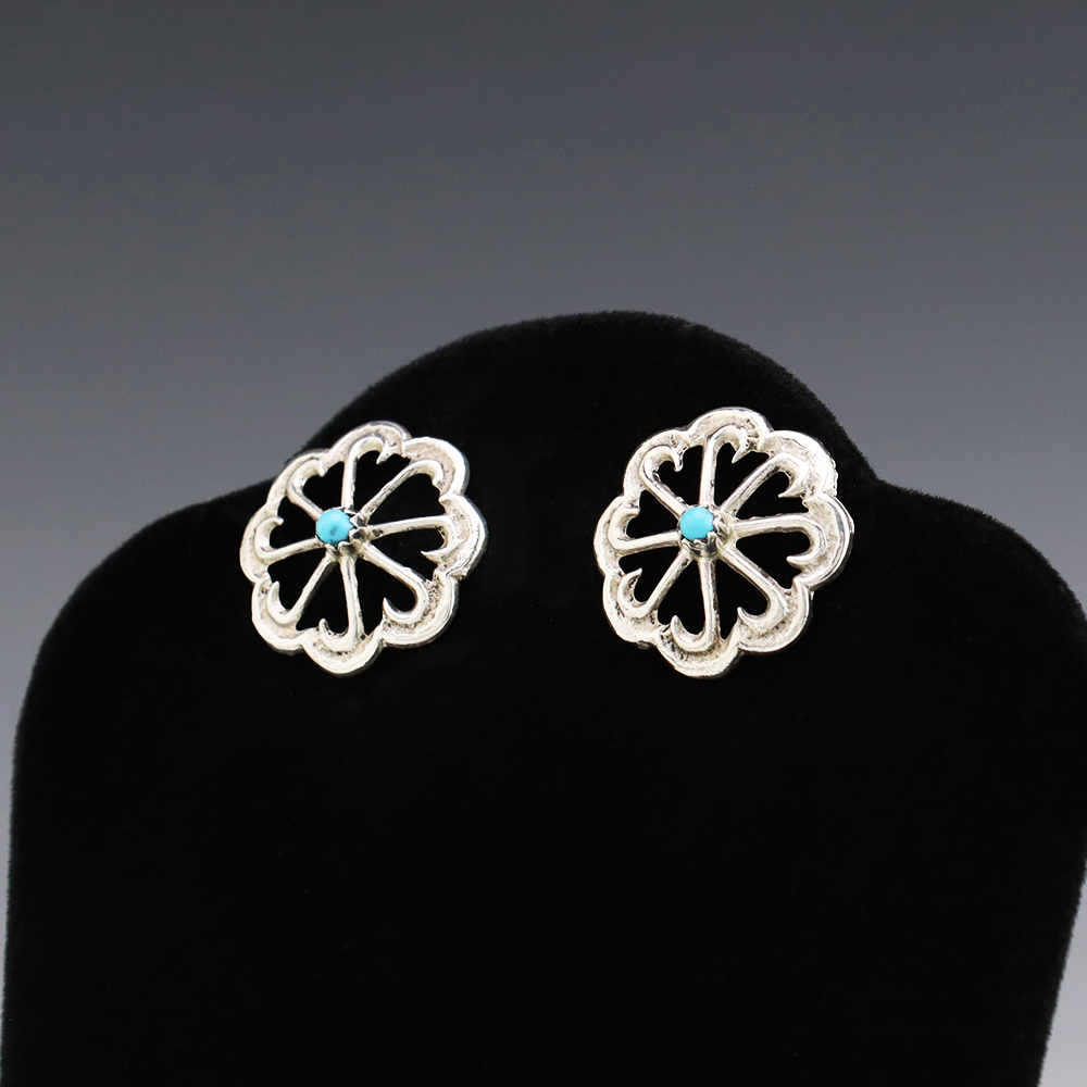 Wonderful earrings hand made by Navajo artist Bruce Chee. The earrings are sterling silver and set with Turquoise stones. These fabulous earrings will become a versatile accessory in your jewelry collection. Weighs 4 grams.